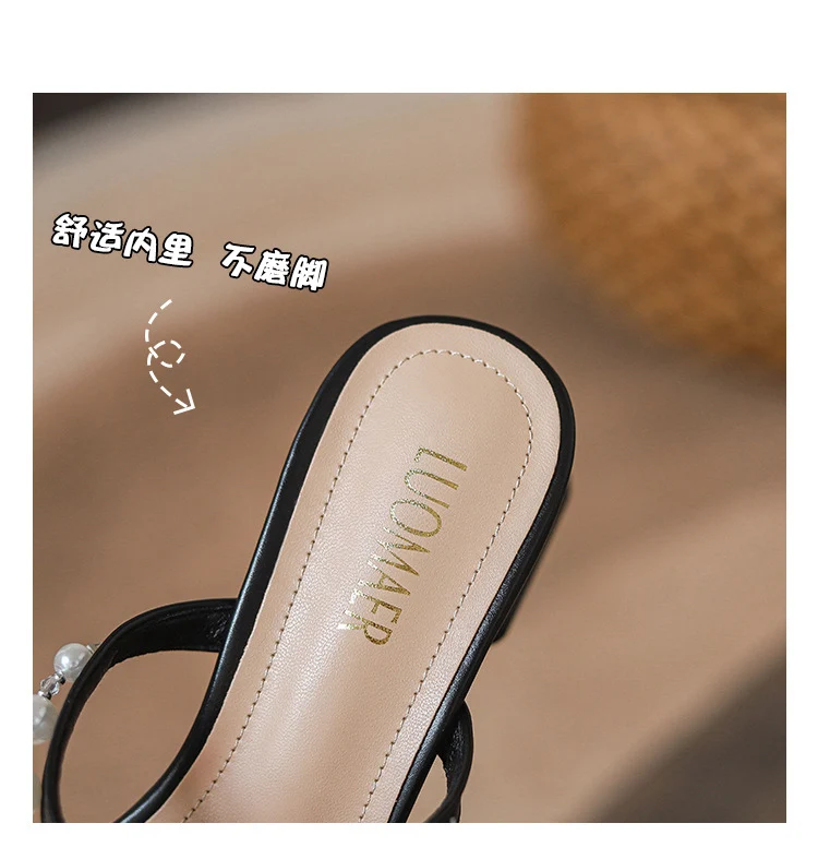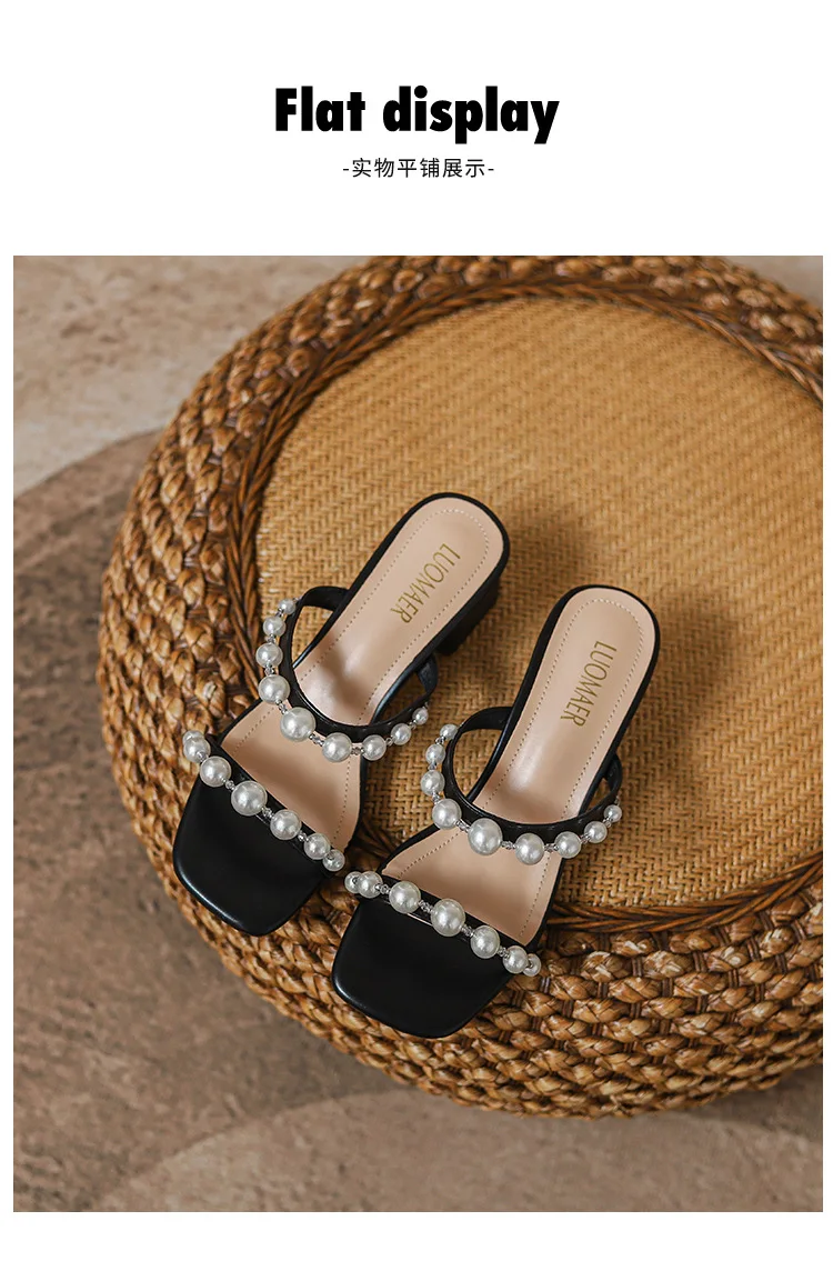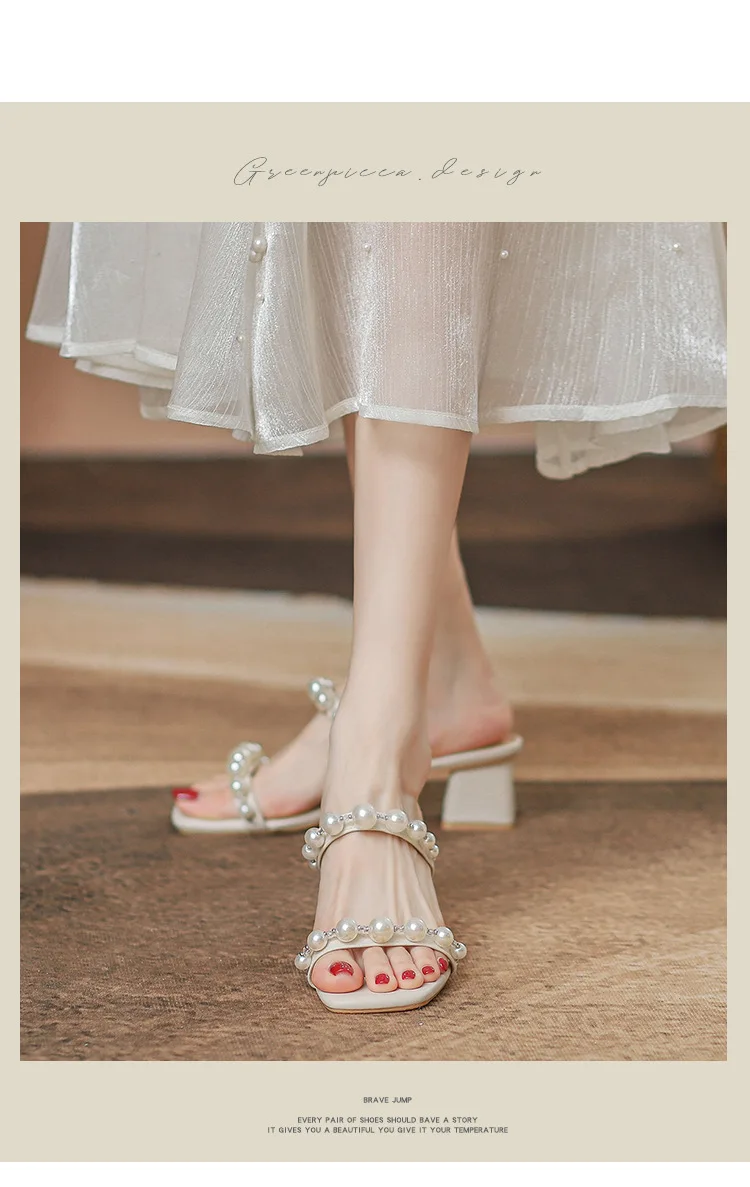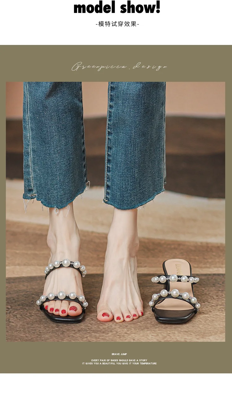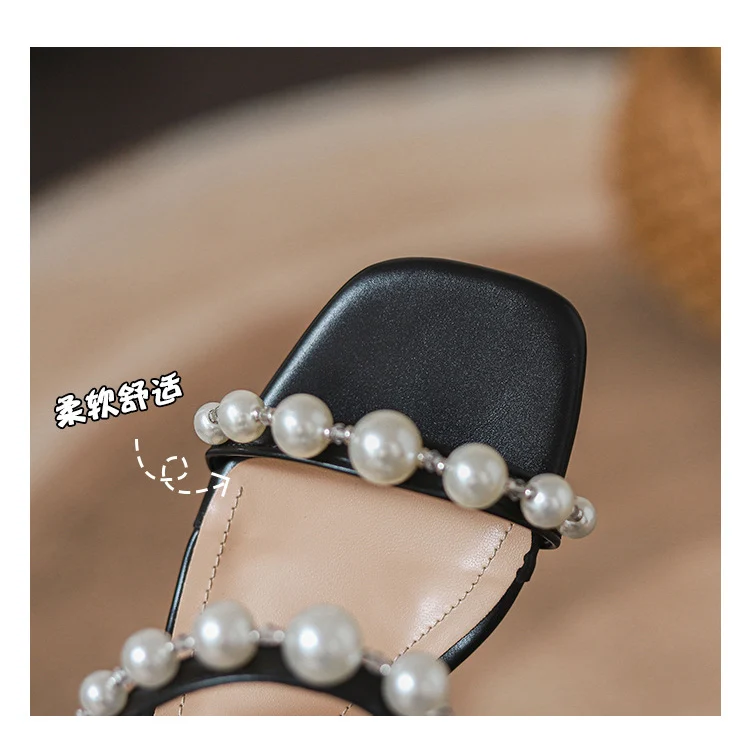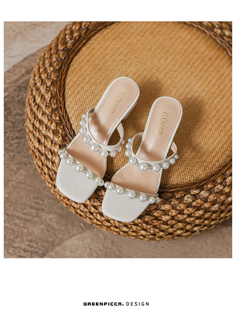 summer shoes woman pearl beading slippers double narrow band high heels sandals female crystal strings flip flops women slides