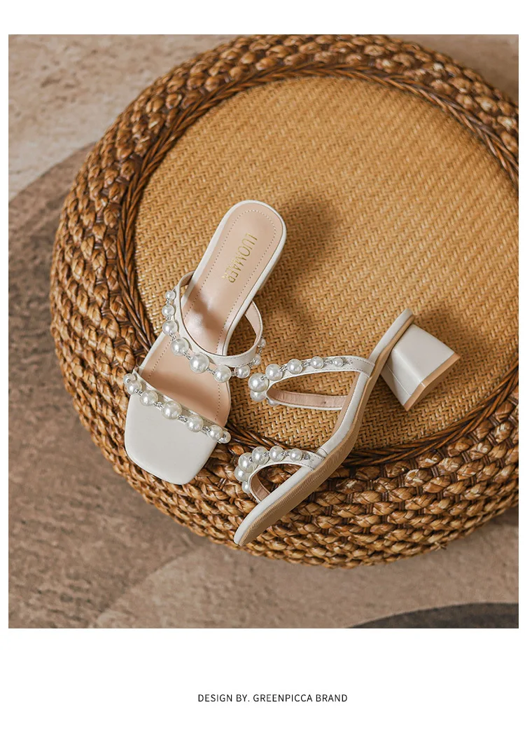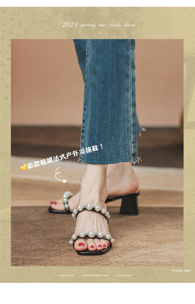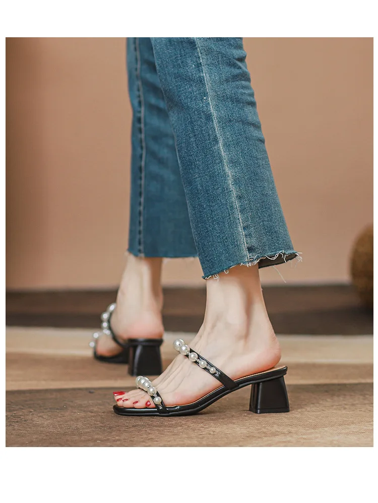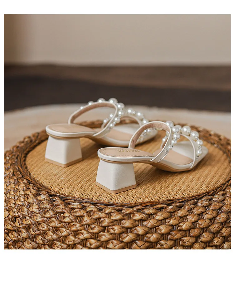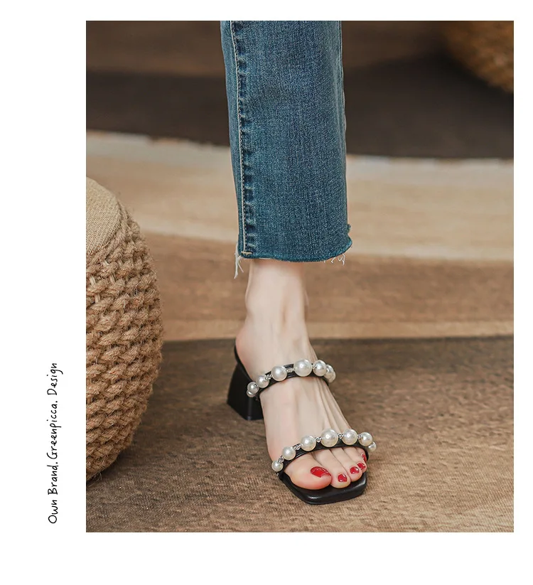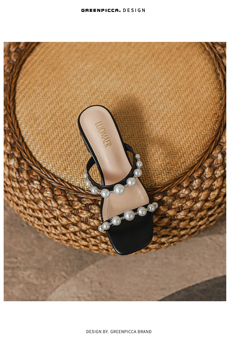 summer shoes woman pearl beading slippers double narrow band high heels sandals female crystal strings flip flops women slides
