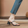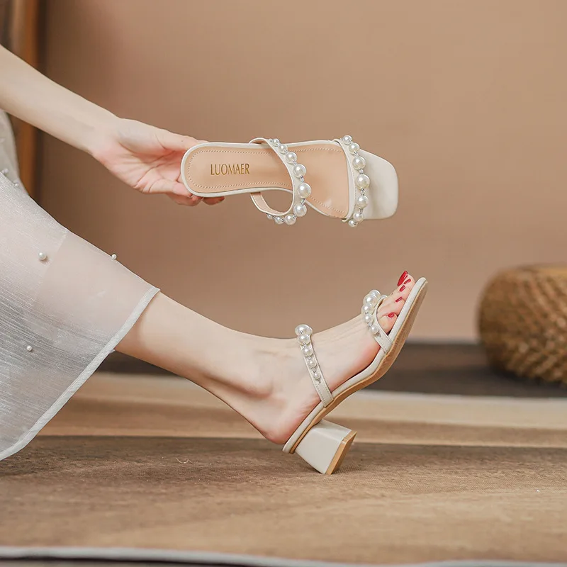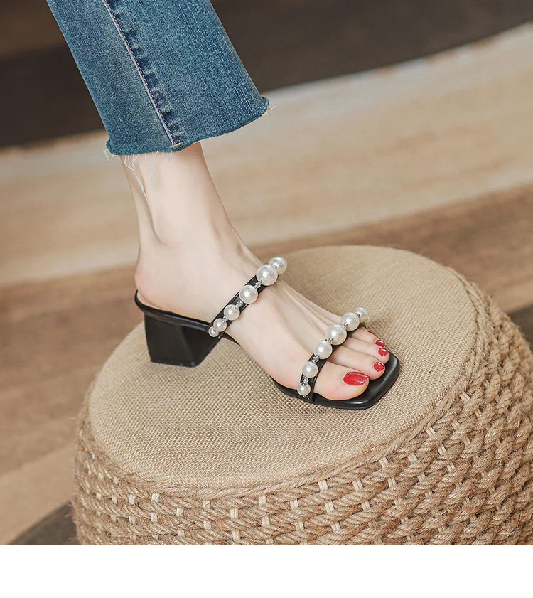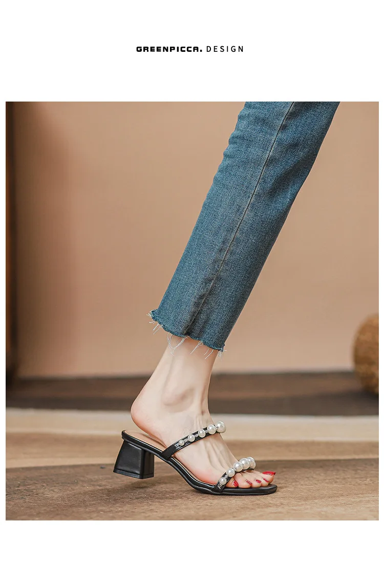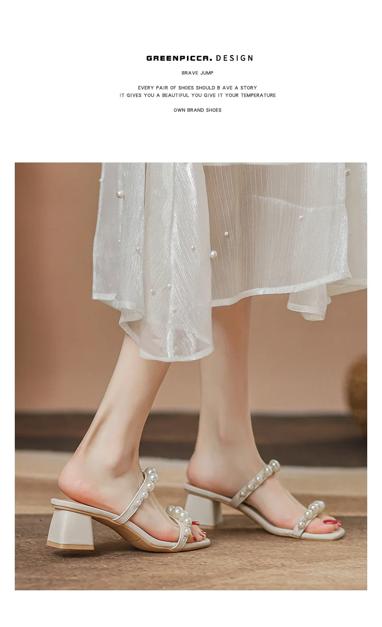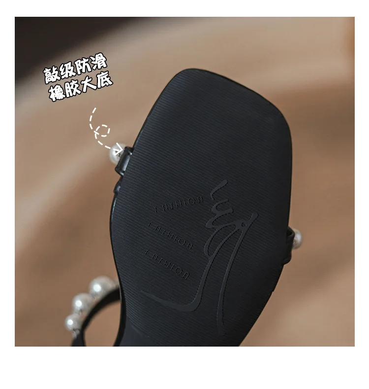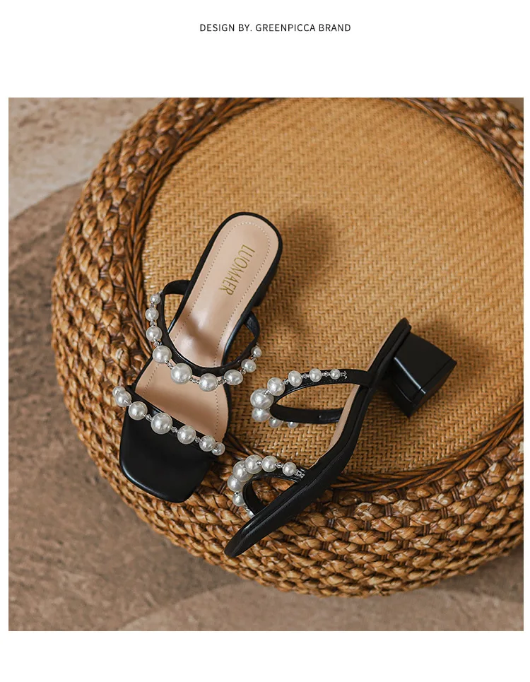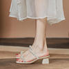 summer shoes woman pearl beading slippers double narrow band high heels sandals female crystal strings flip flops women slides