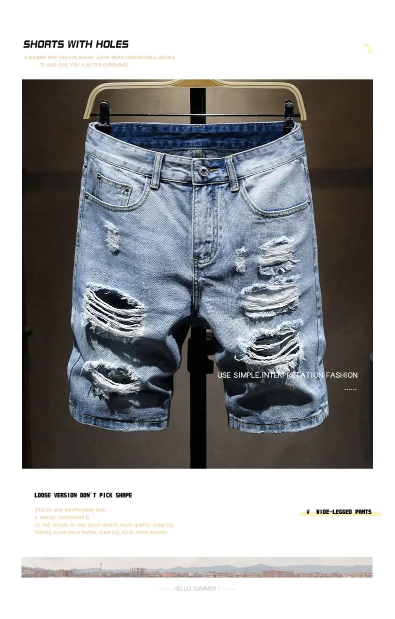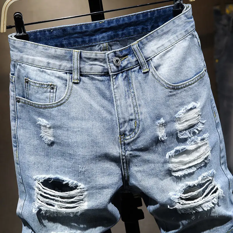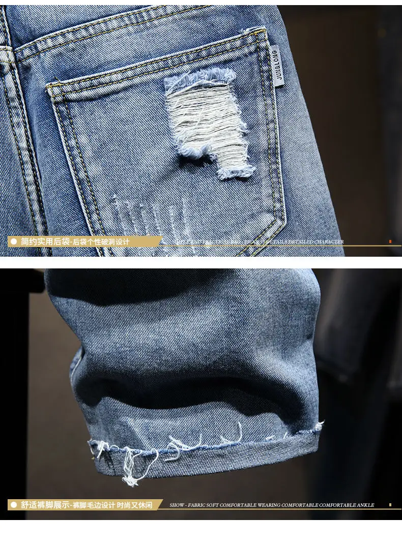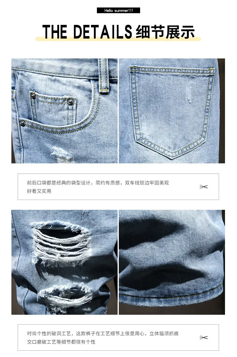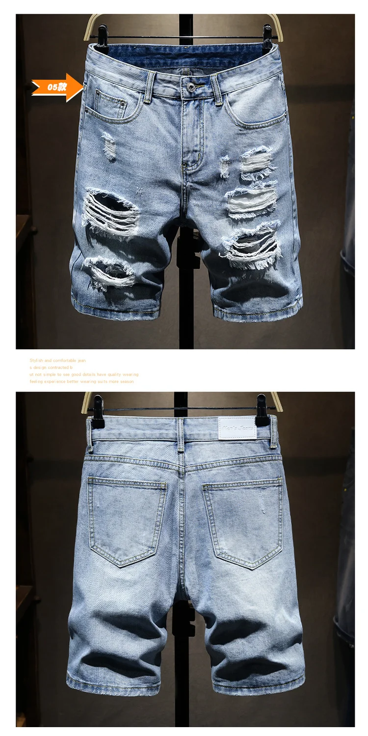 Summer thin denim shorts men’s trend light blue color fashion pants loose personality ripped jeans men clothes