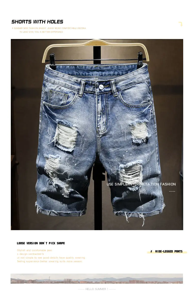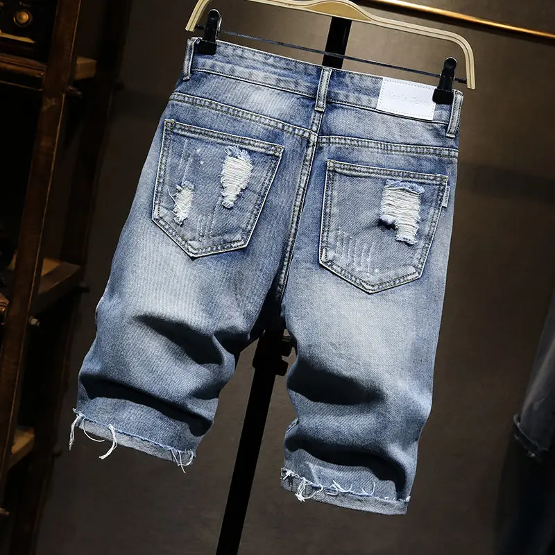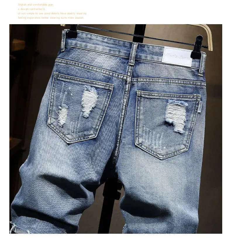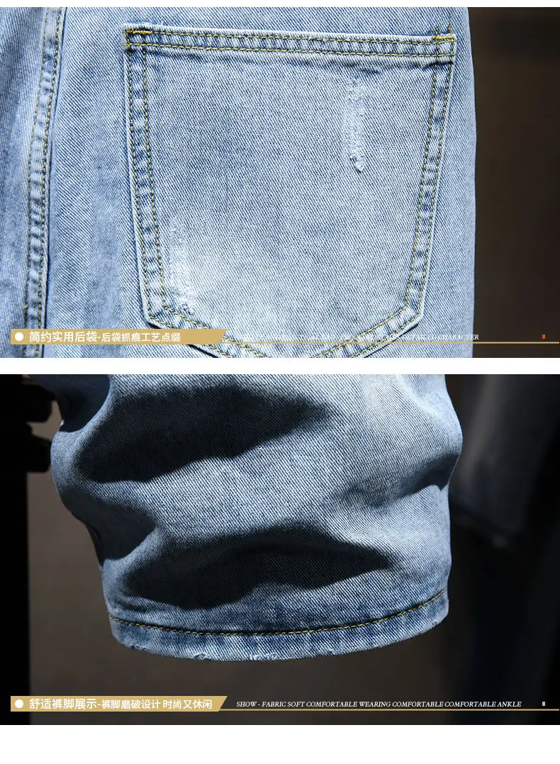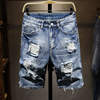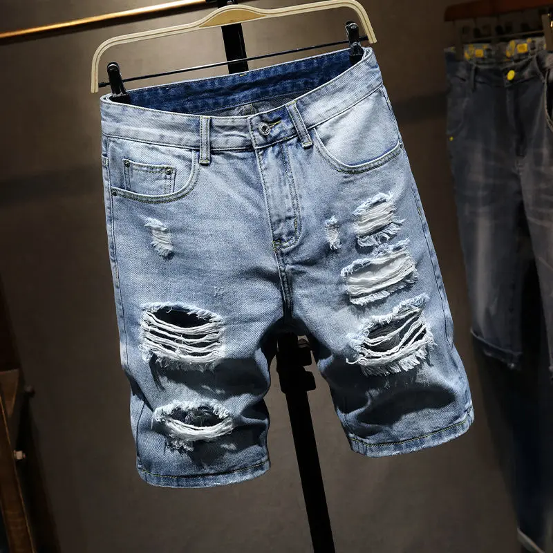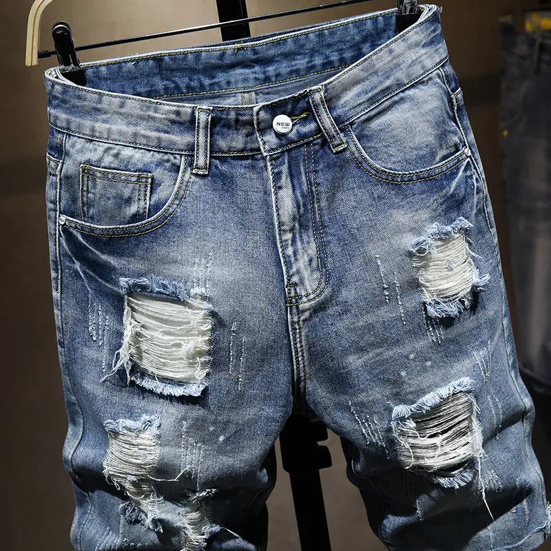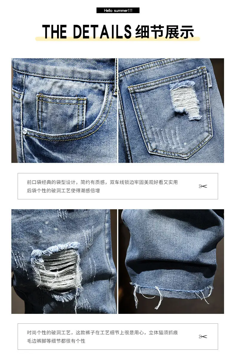 Summer thin denim shorts men’s trend light blue color fashion pants loose personality ripped jeans men clothes