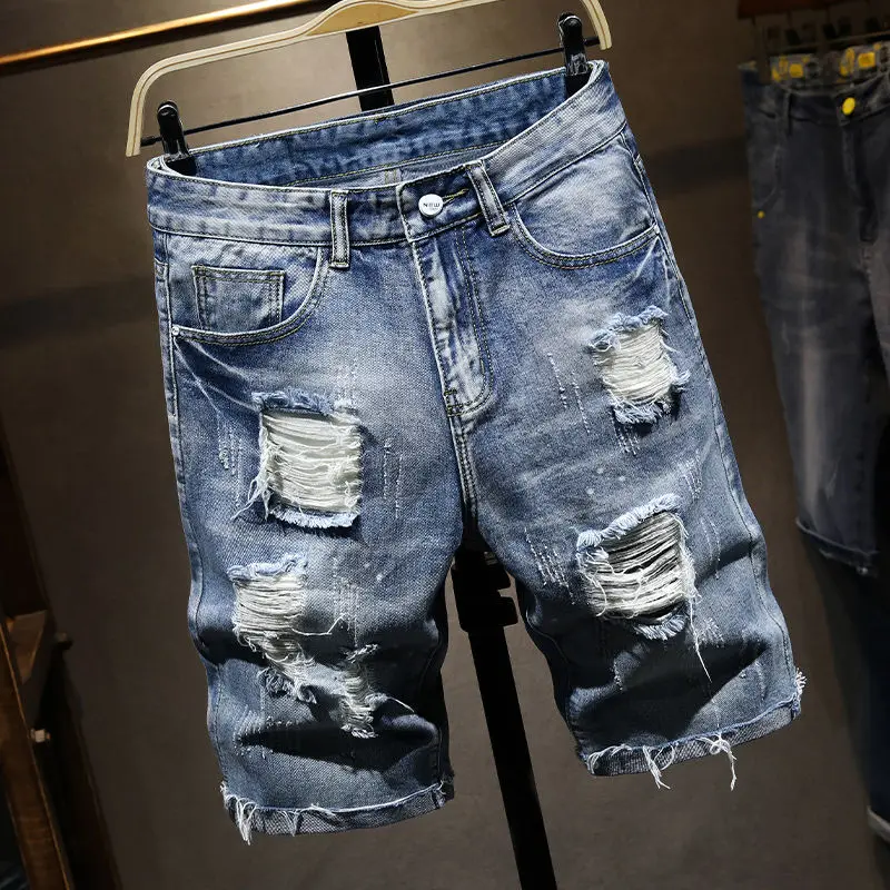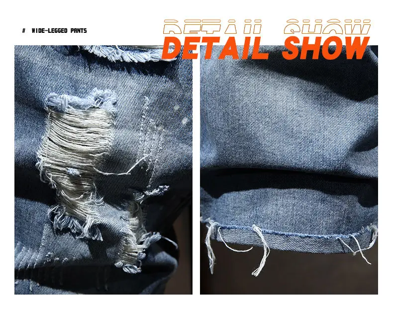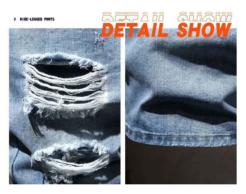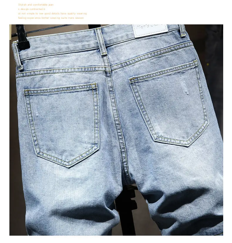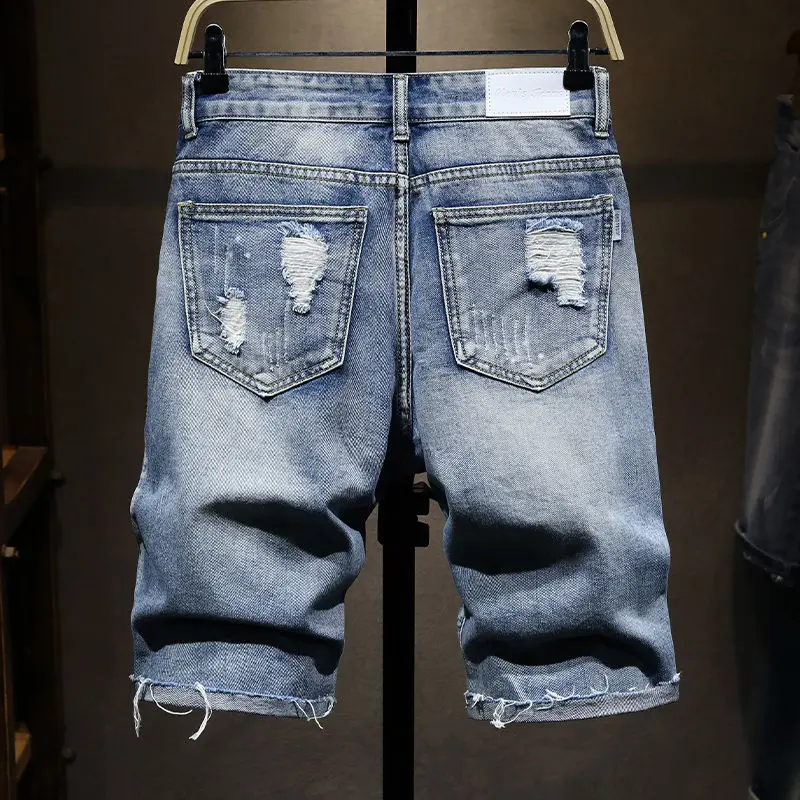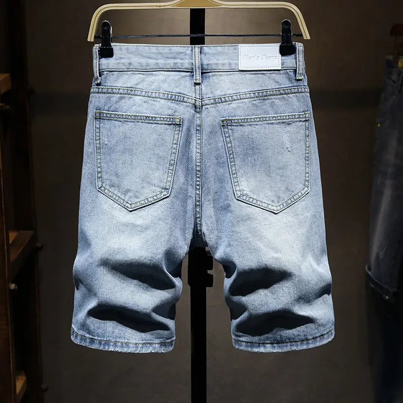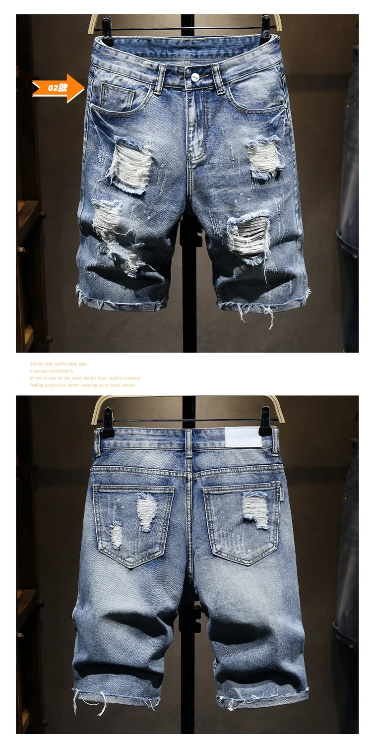 Summer thin denim shorts men’s trend light blue color fashion pants loose personality ripped jeans men clothes