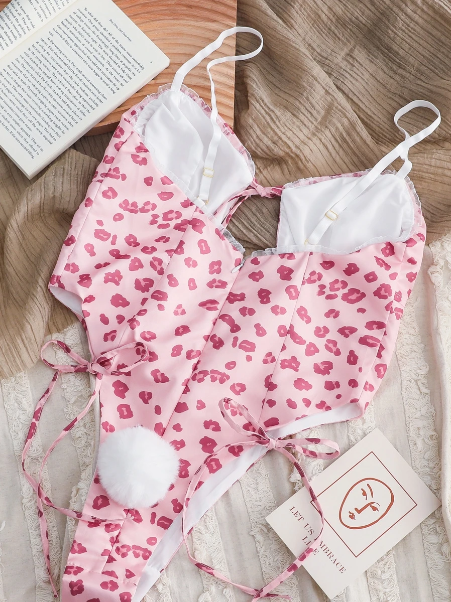 Sweet and sexy hollow bunny girl lingerie uniform leopard print three-point one-piece camisole women bodysuit set