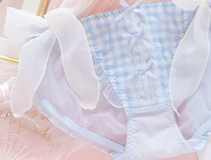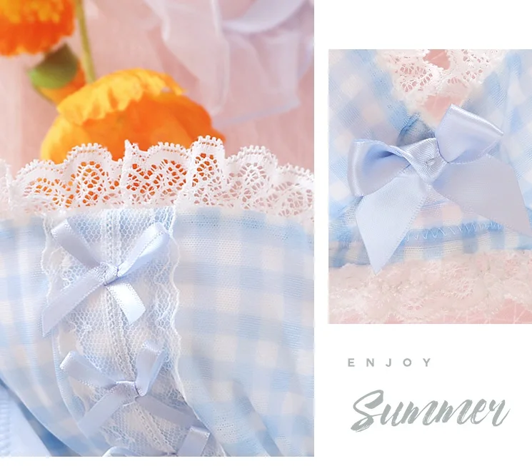 Sweet and sexy lingerie briefs set female large size gather cute loli Japanese brattle maid plaid steel ring bra panties suit