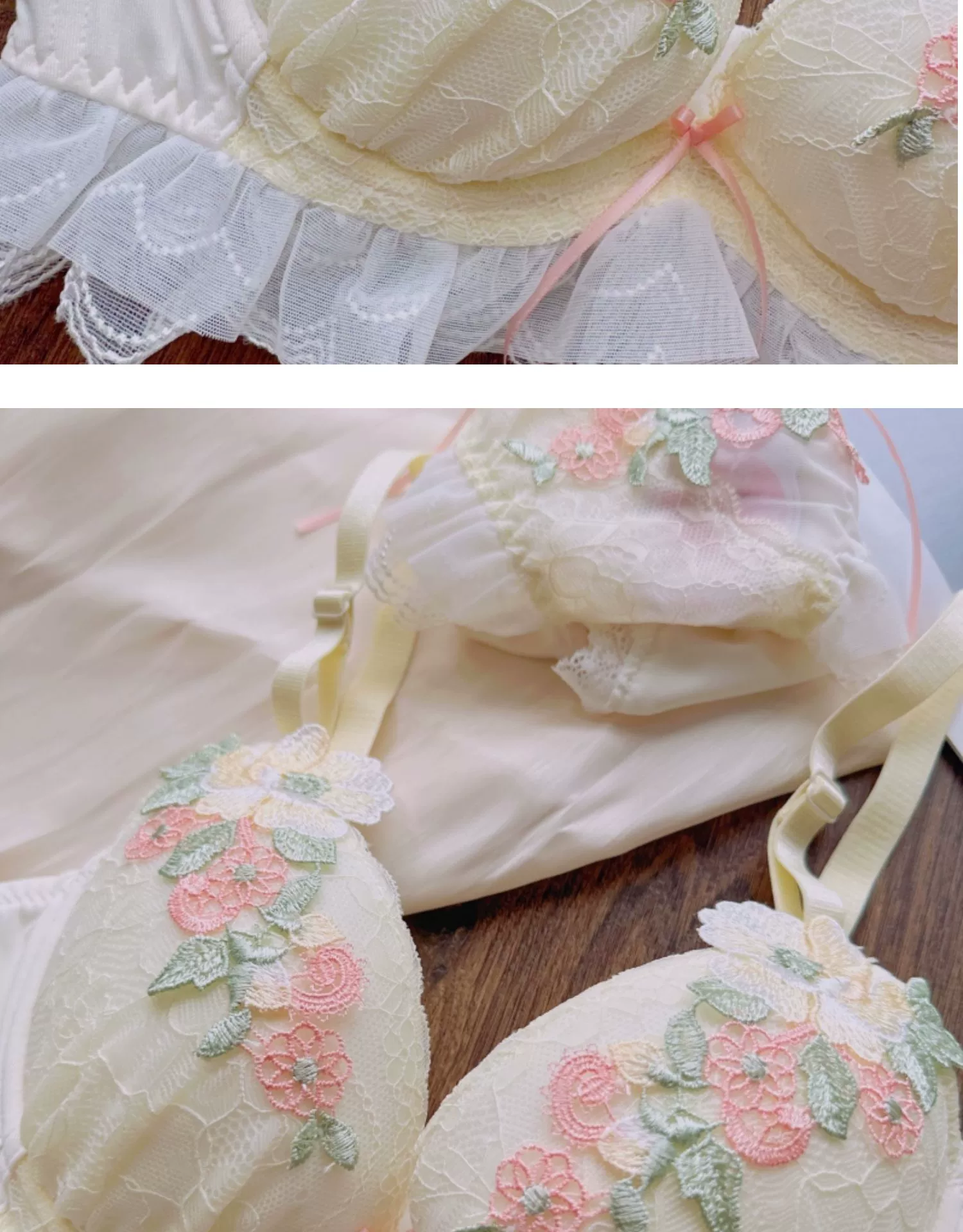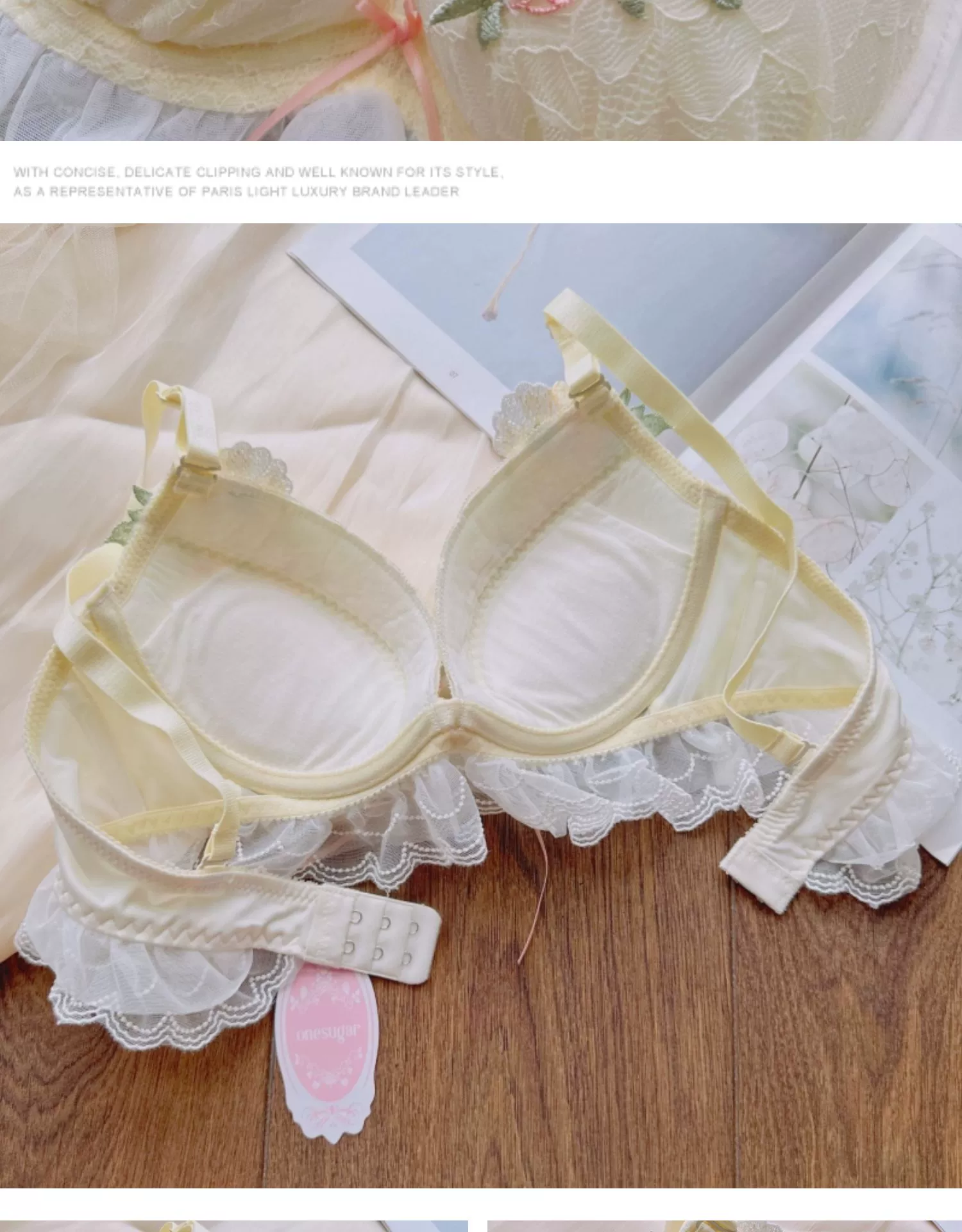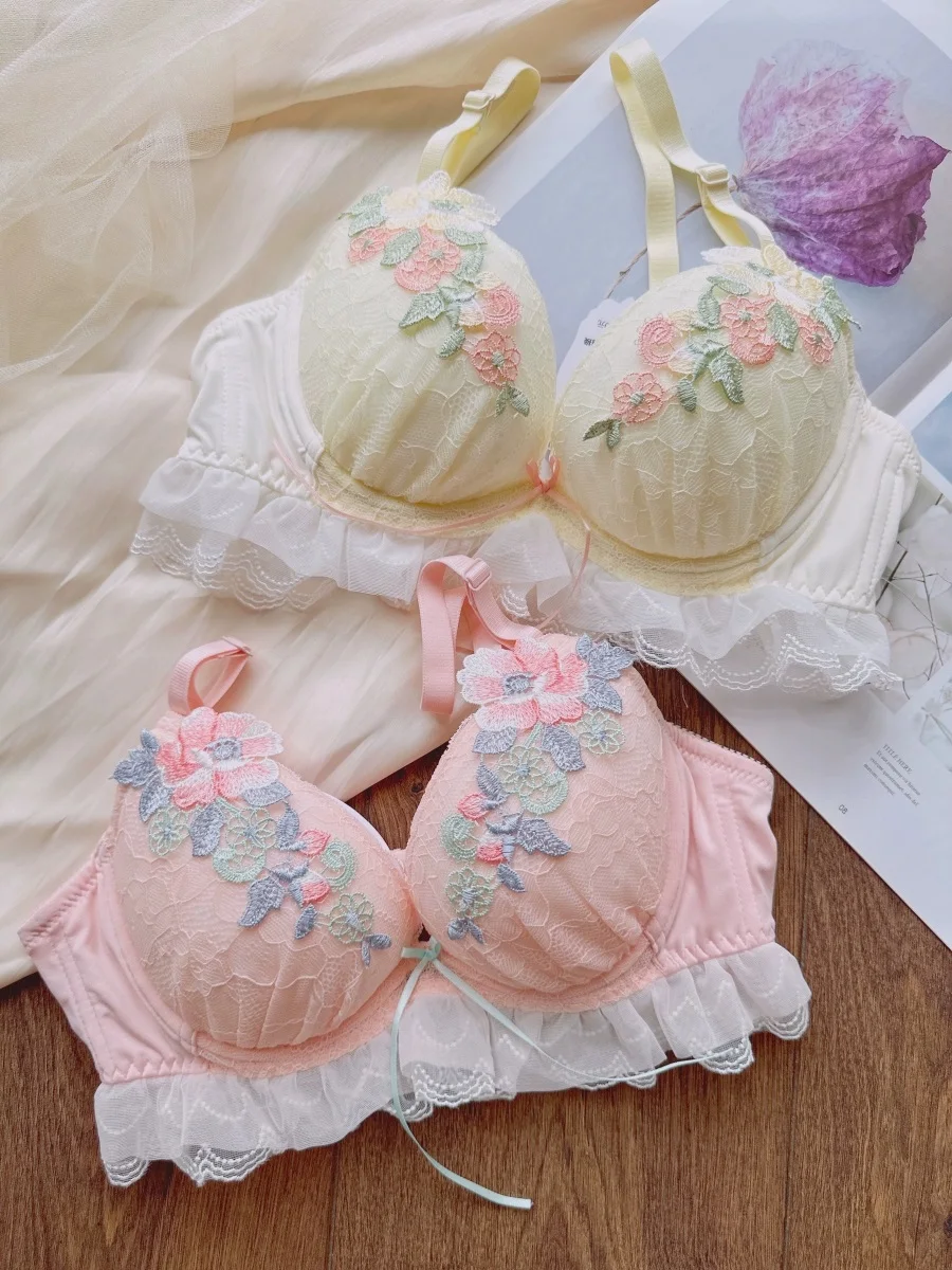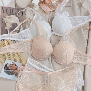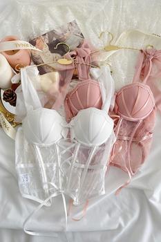 Sweet water-soluble lace lingerie deep V large steel ring thin cup bra set gathered sexy underwear
