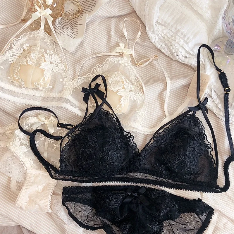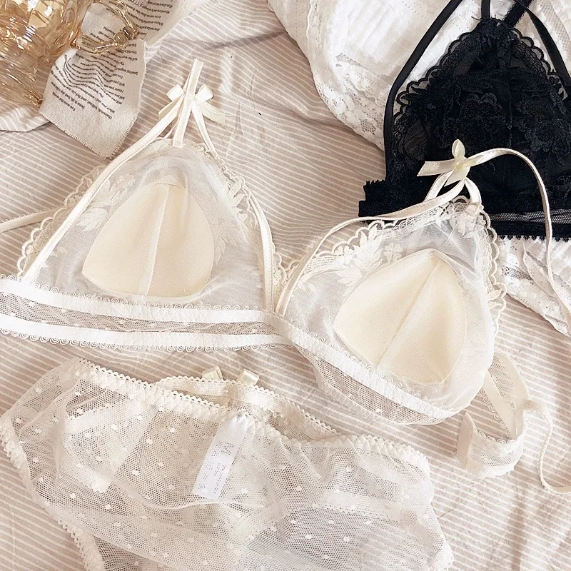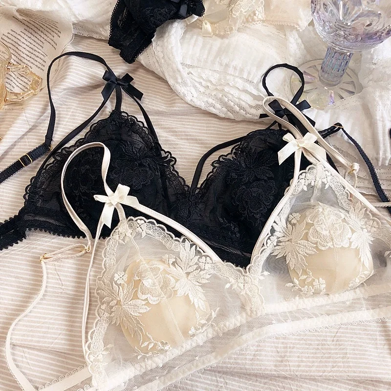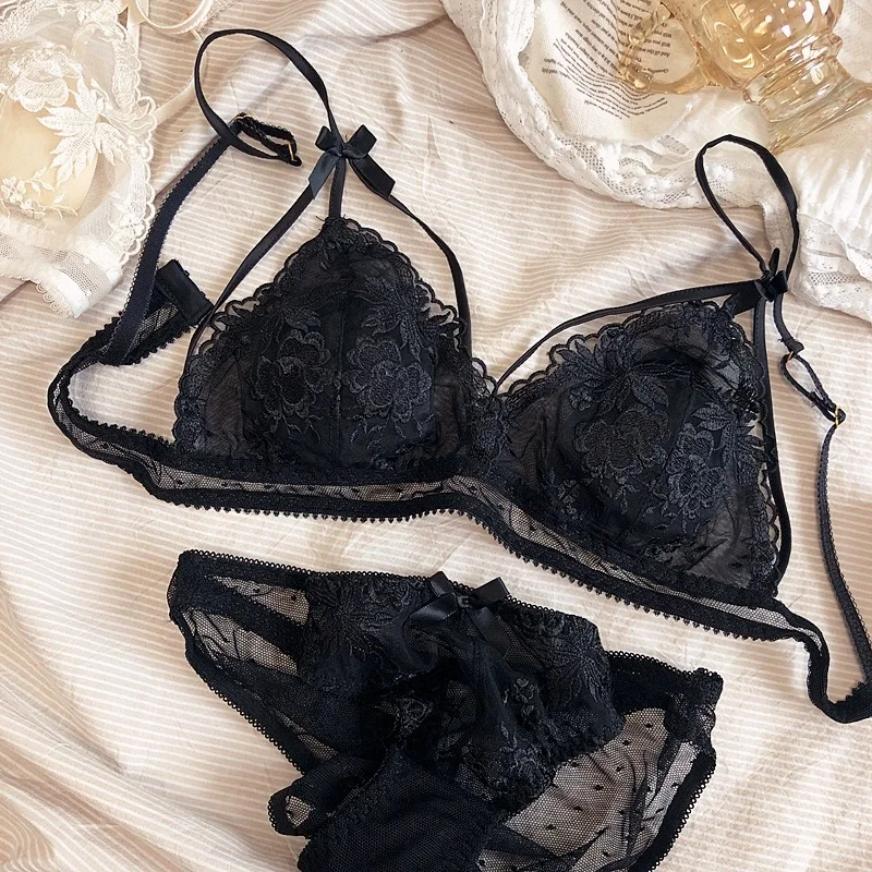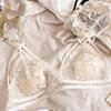 Thin embroidered lace triangle cup lingerie sexy transparent bra set without steel ring crystal cup small breast underwear bra