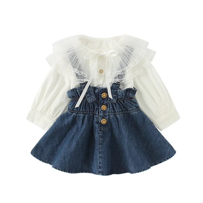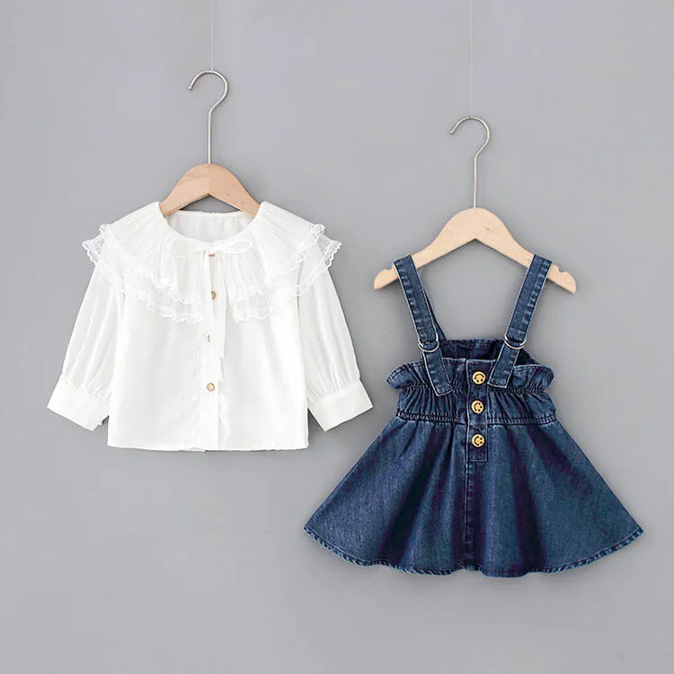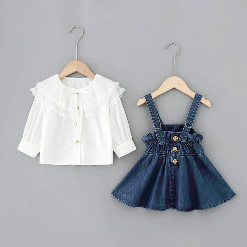 Toddler Baby Dress 1 2 3 4 5 6 Years 2022 Spring Autumn Kid’s Outwear Infant Big Lace Neck Shirt+Dress Two Pieces Set For Girls