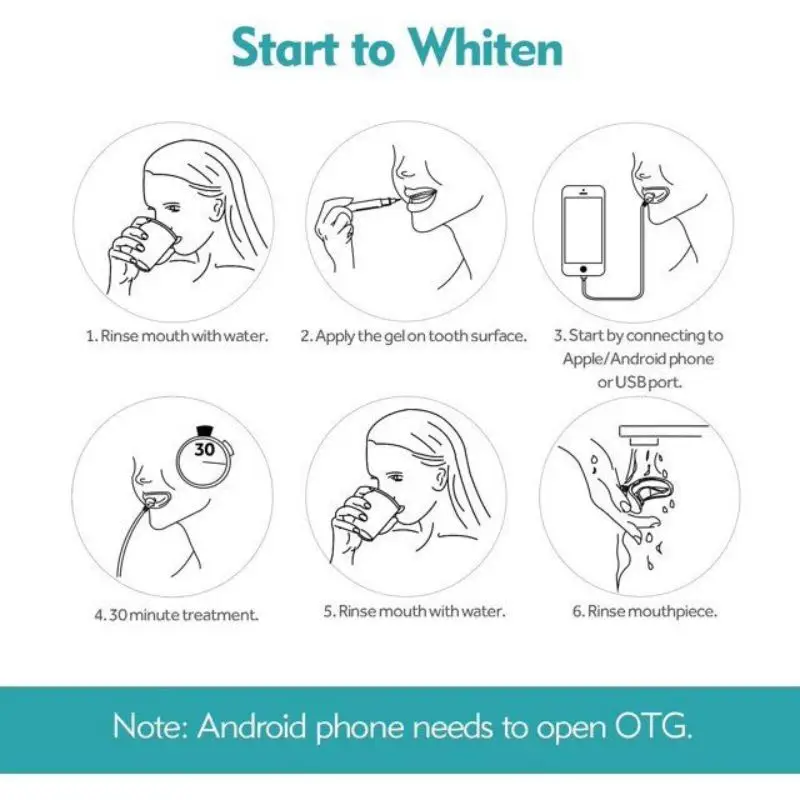【NO NEED BATTERIES, ENERGY SAVING】Our Tooth Whitening Light with 3 Adapters for iPhone, Android and USB. You can connect with your phone anywhere, anytime. NO NEED for batteries or additional teeth whitening trays. Energy saving and environmental protection. Compatible with any commercial teeth whitening gel or teeth whitening strips, enhance your teeth whitening process faster.^