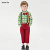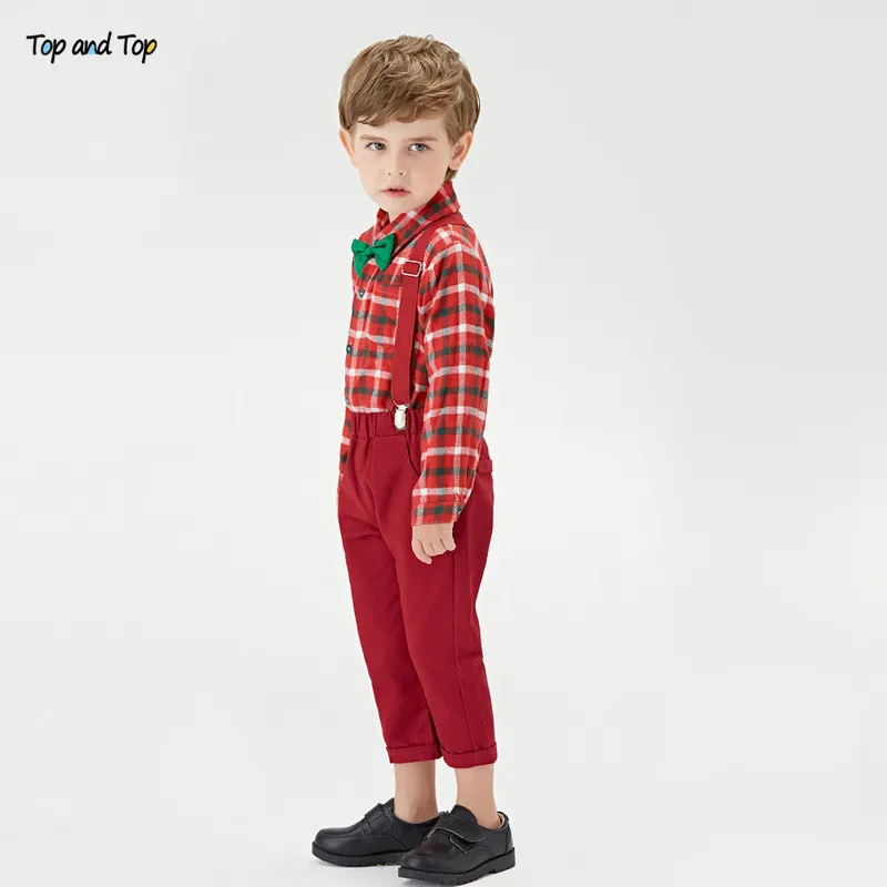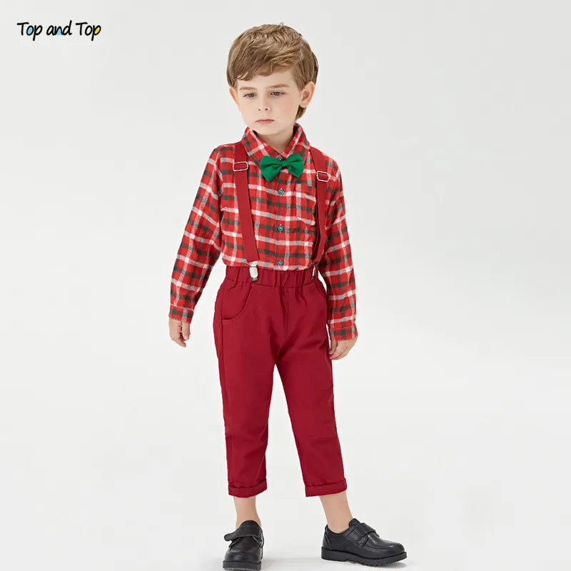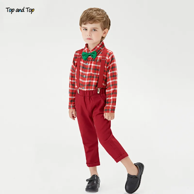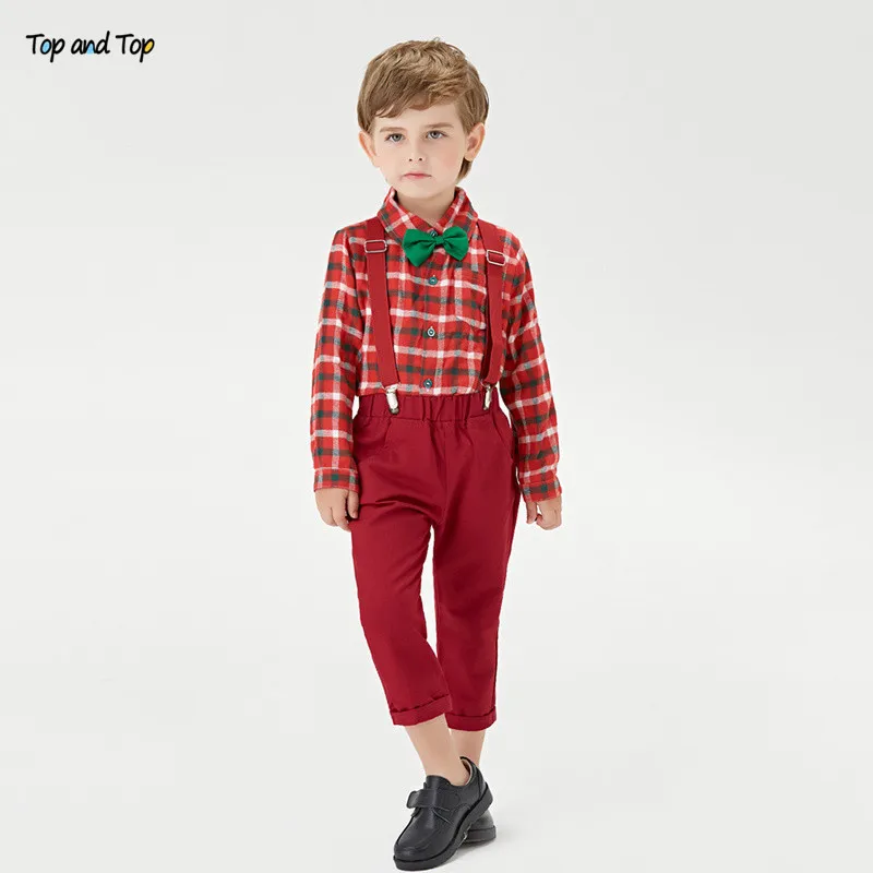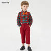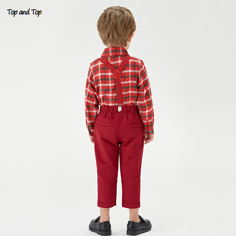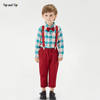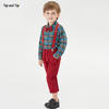 Top and Top Autumn Winter Kids Boys Clothes Outfits Long Sleeve Plaid Bowtie Shirt+Suspenders Red Pants Boys Gentleman Clothing Sets