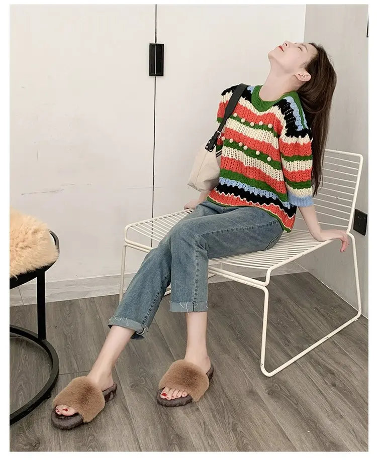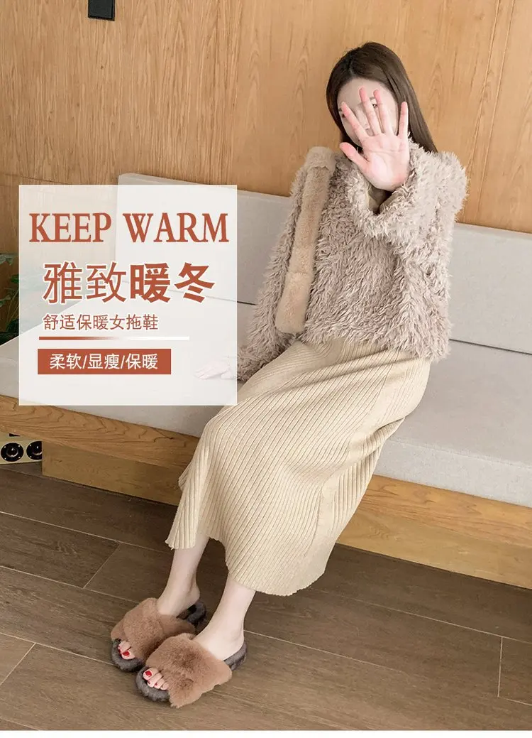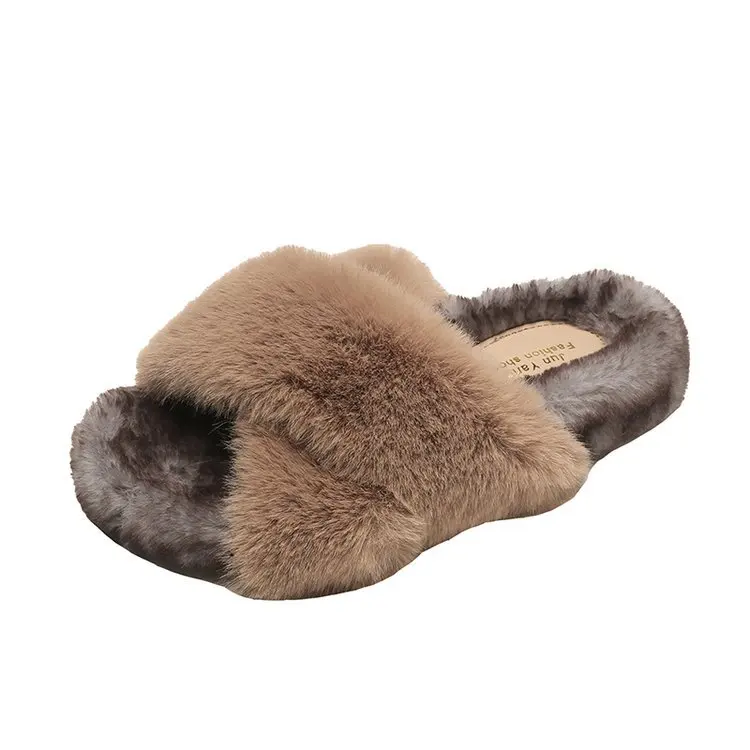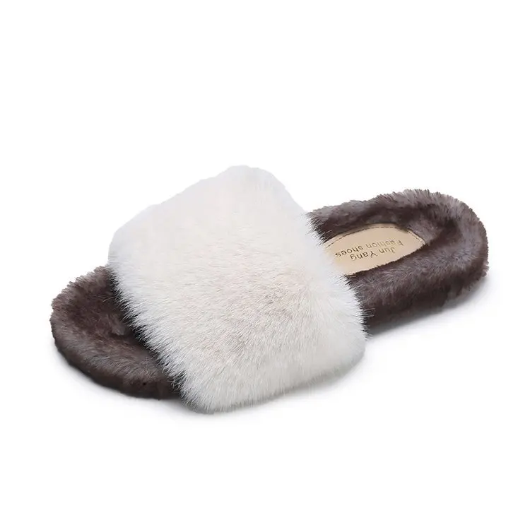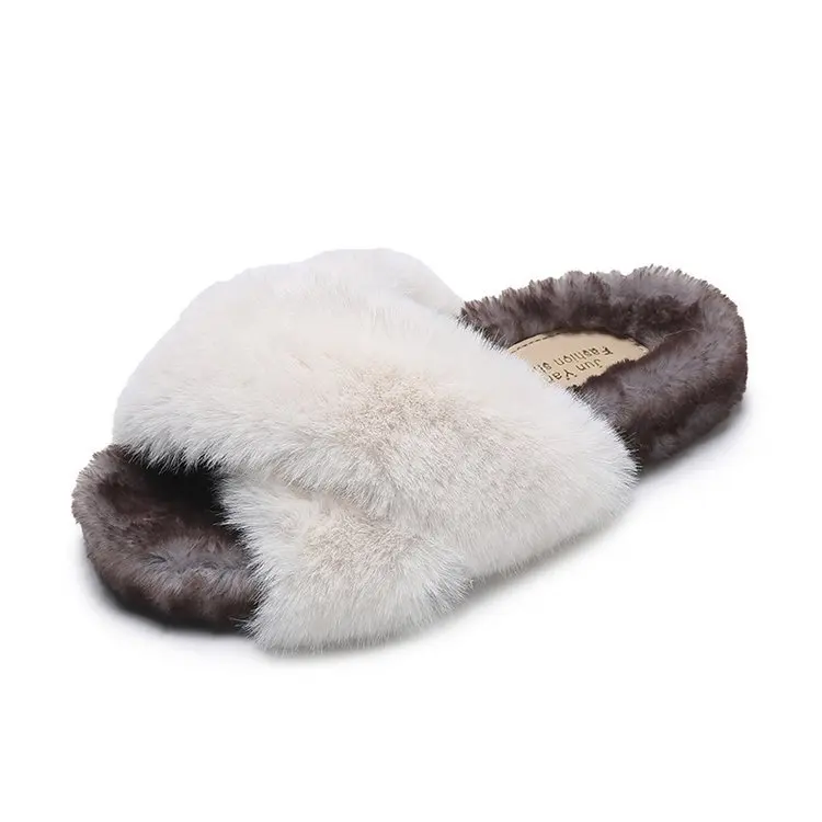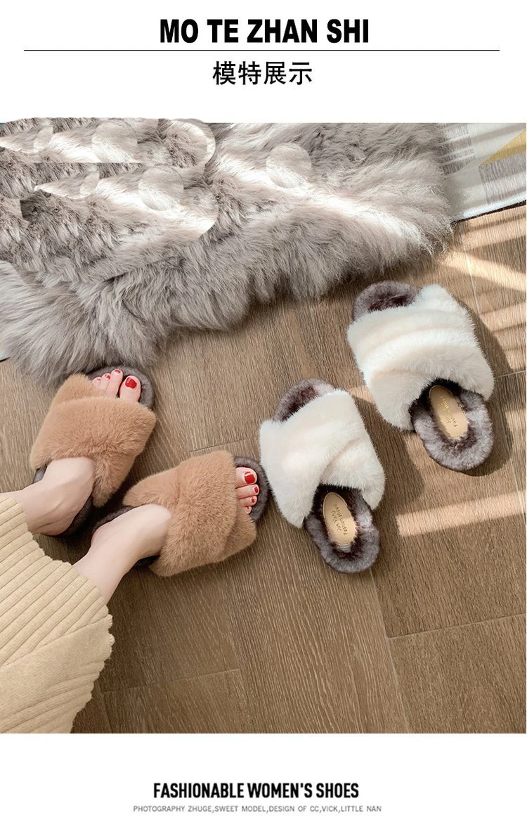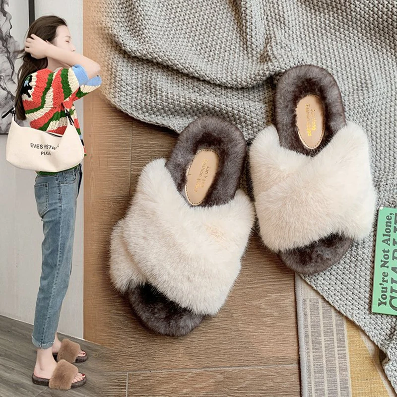 Two Ways mink fur slippers women 2021 ins home winter shoes woman flat cross band warm plush slides mujer cozy furry pantuflas