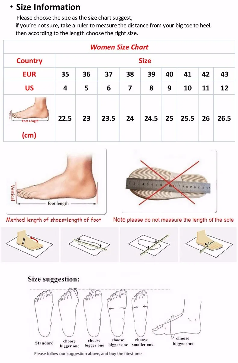 Notice: Hello, please measure your foot length (not insoles length or soles length) carefully and choose the right size according to your foot length, if your foot is wide or fat ,please choose one size larger, if your foot is slim or narrow,please choose one size smaller, thank you.