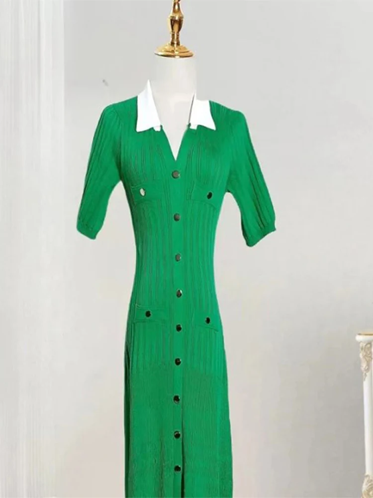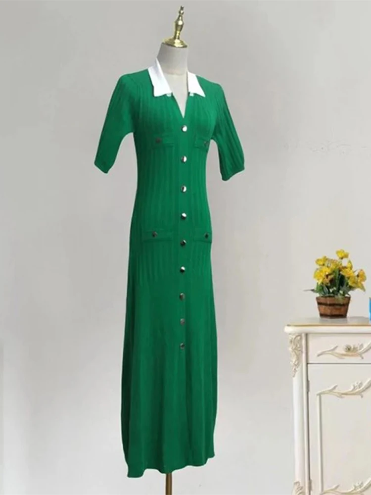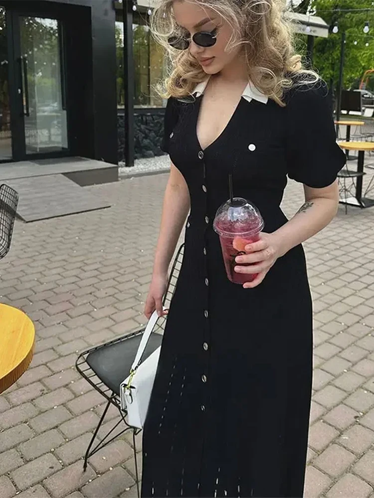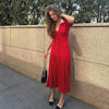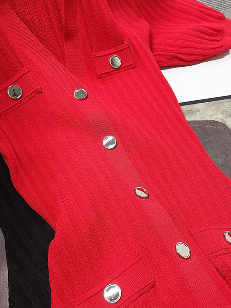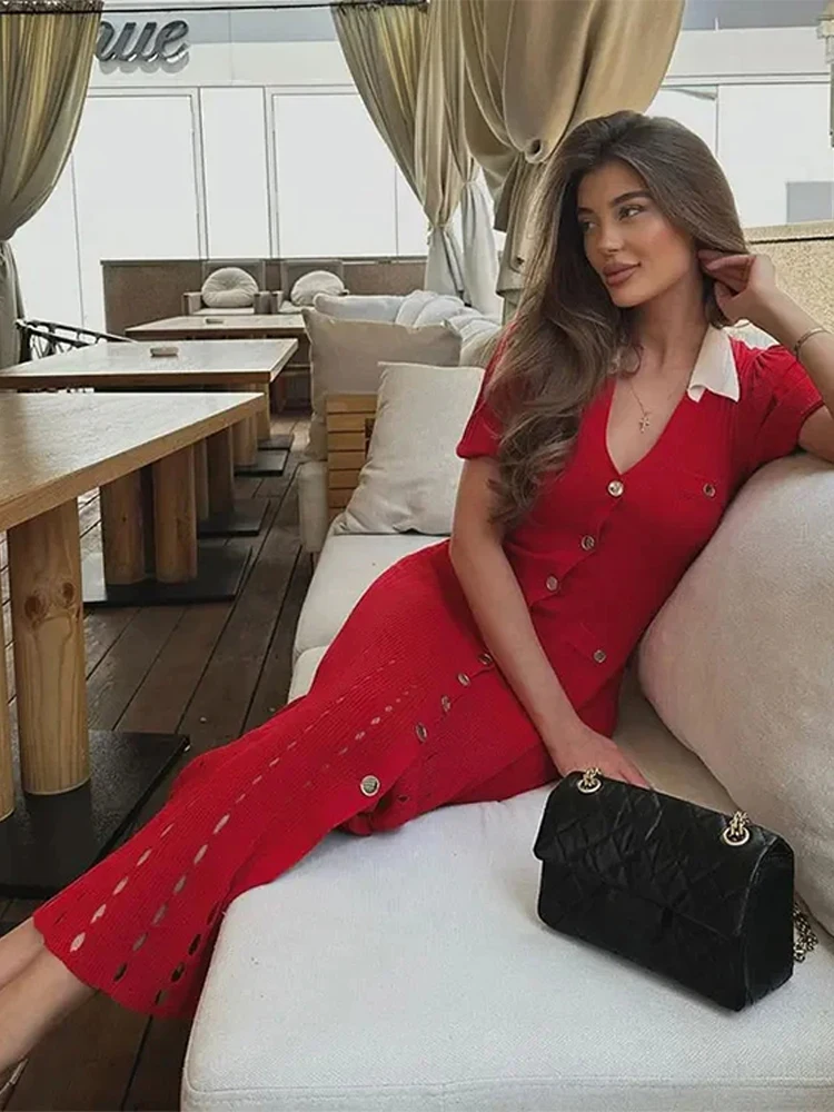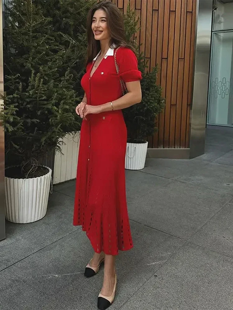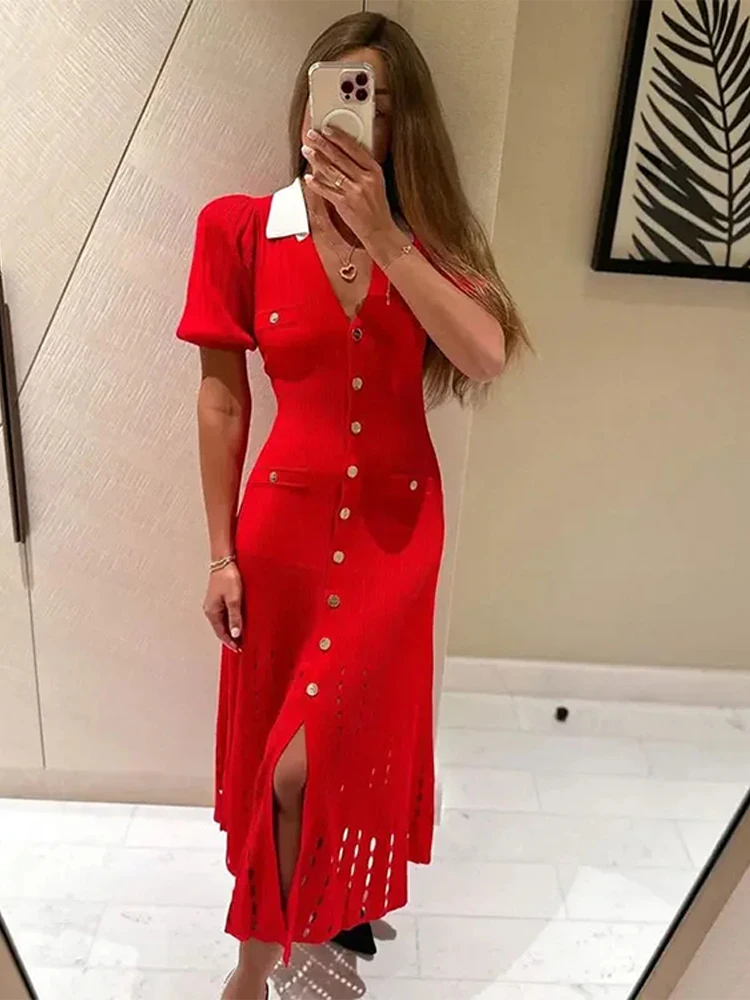 V-Neck Bubble Sleeved Knitted Beach Dresses Waist Cinched Hollowed Out Slimming Red Long Dress Single Breasted Button Women Robe