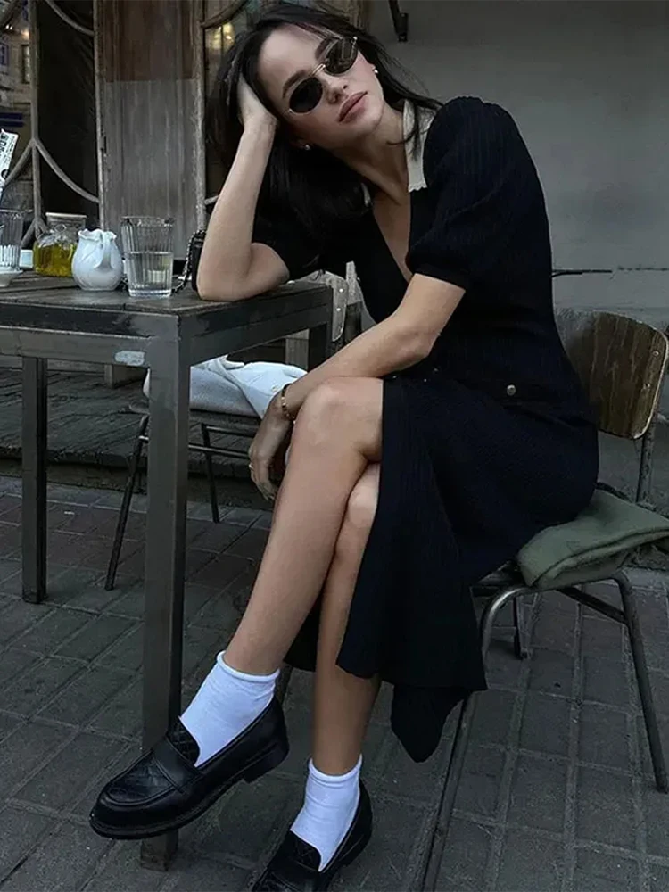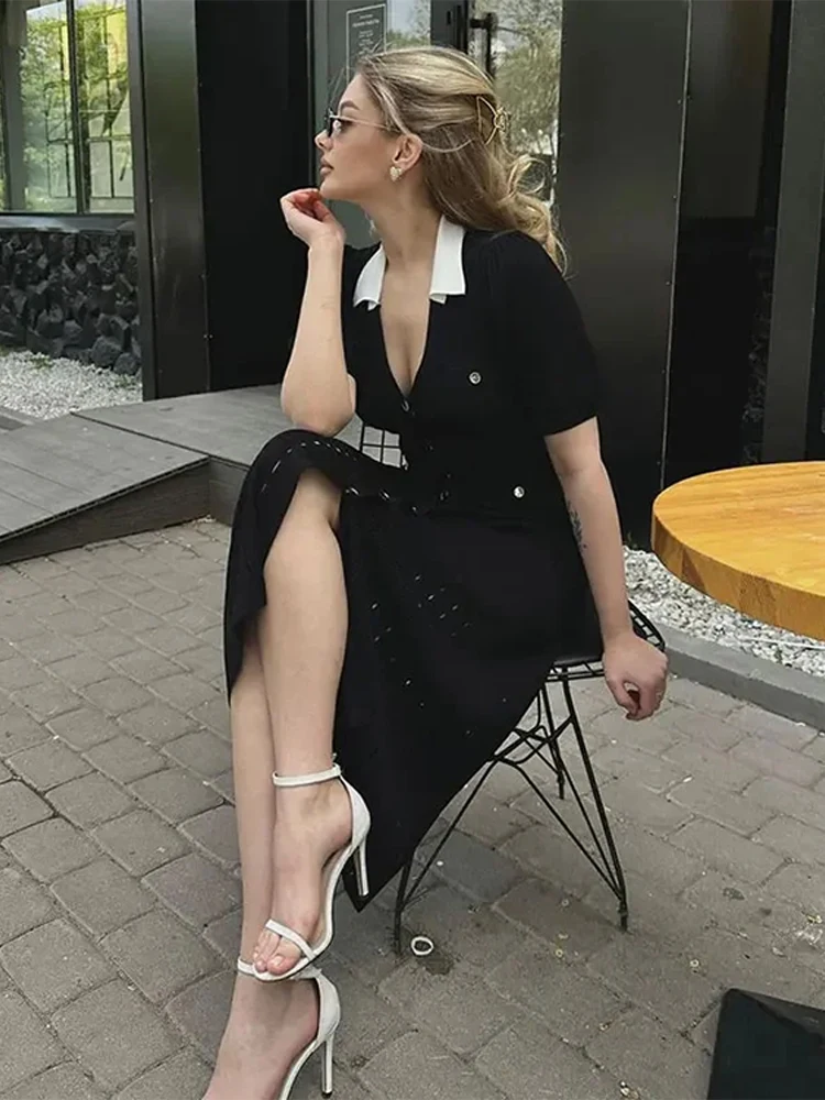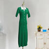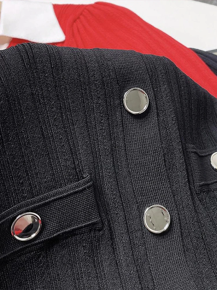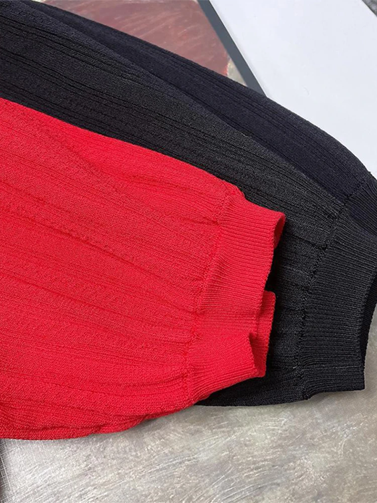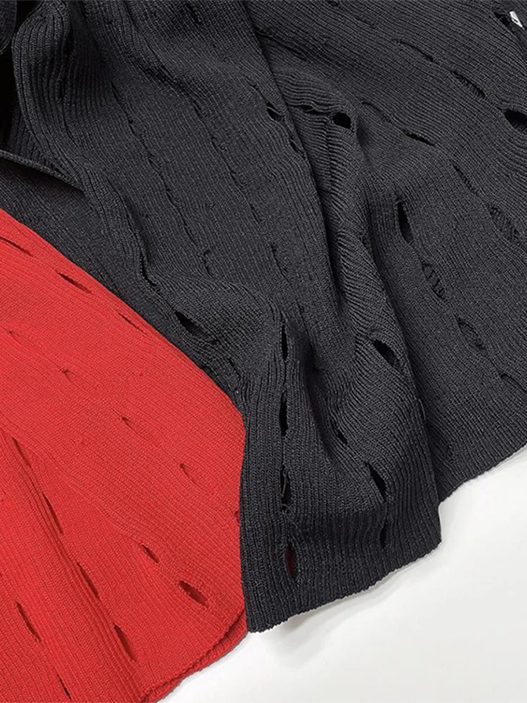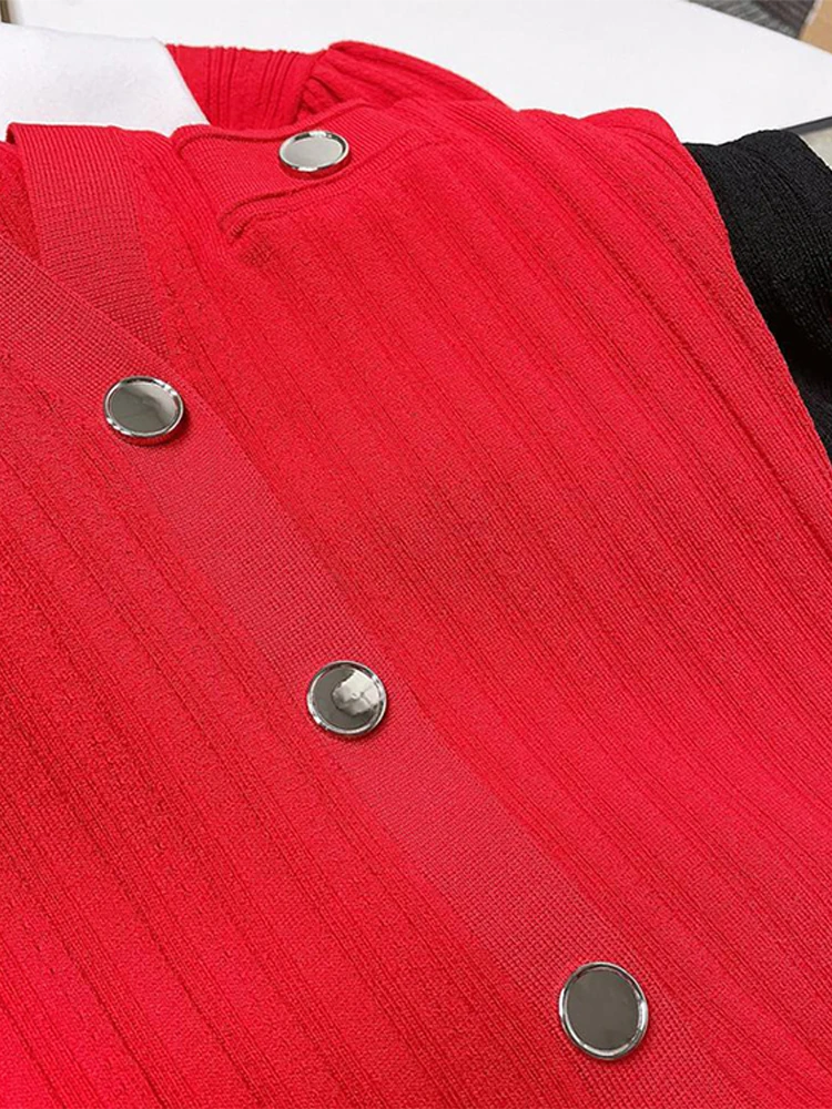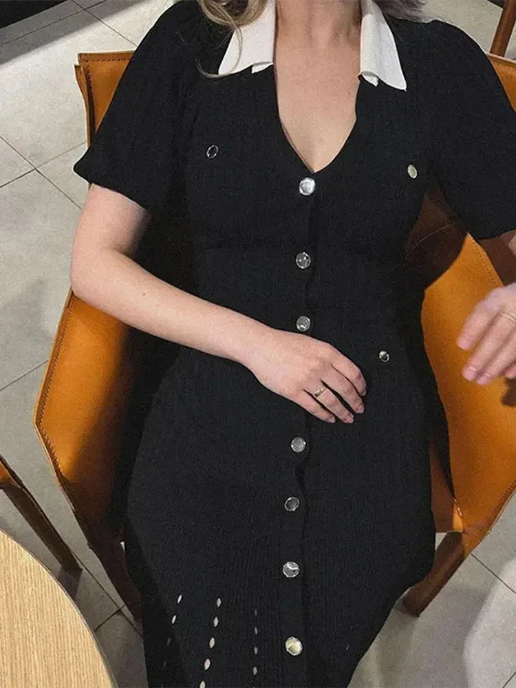 V-Neck Bubble Sleeved Knitted Beach Dresses Waist Cinched Hollowed Out Slimming Red Long Dress Single Breasted Button Women Robe