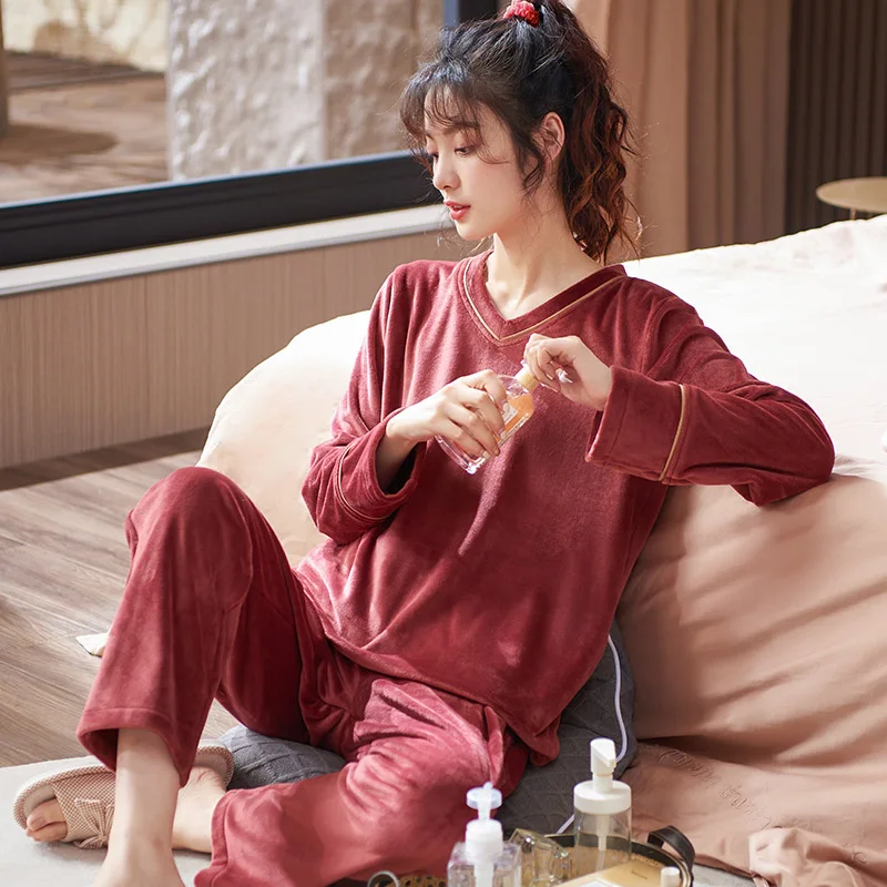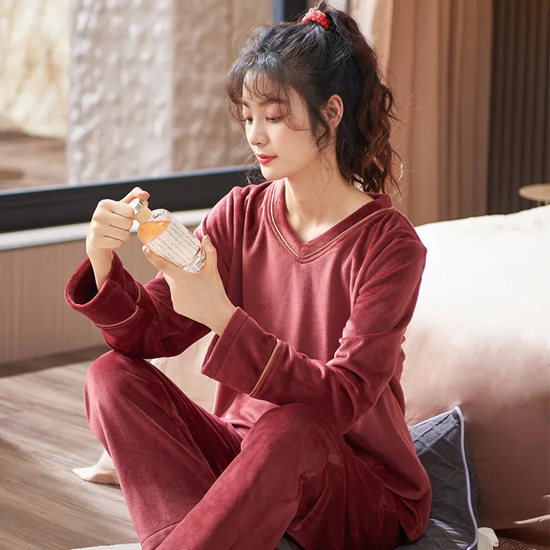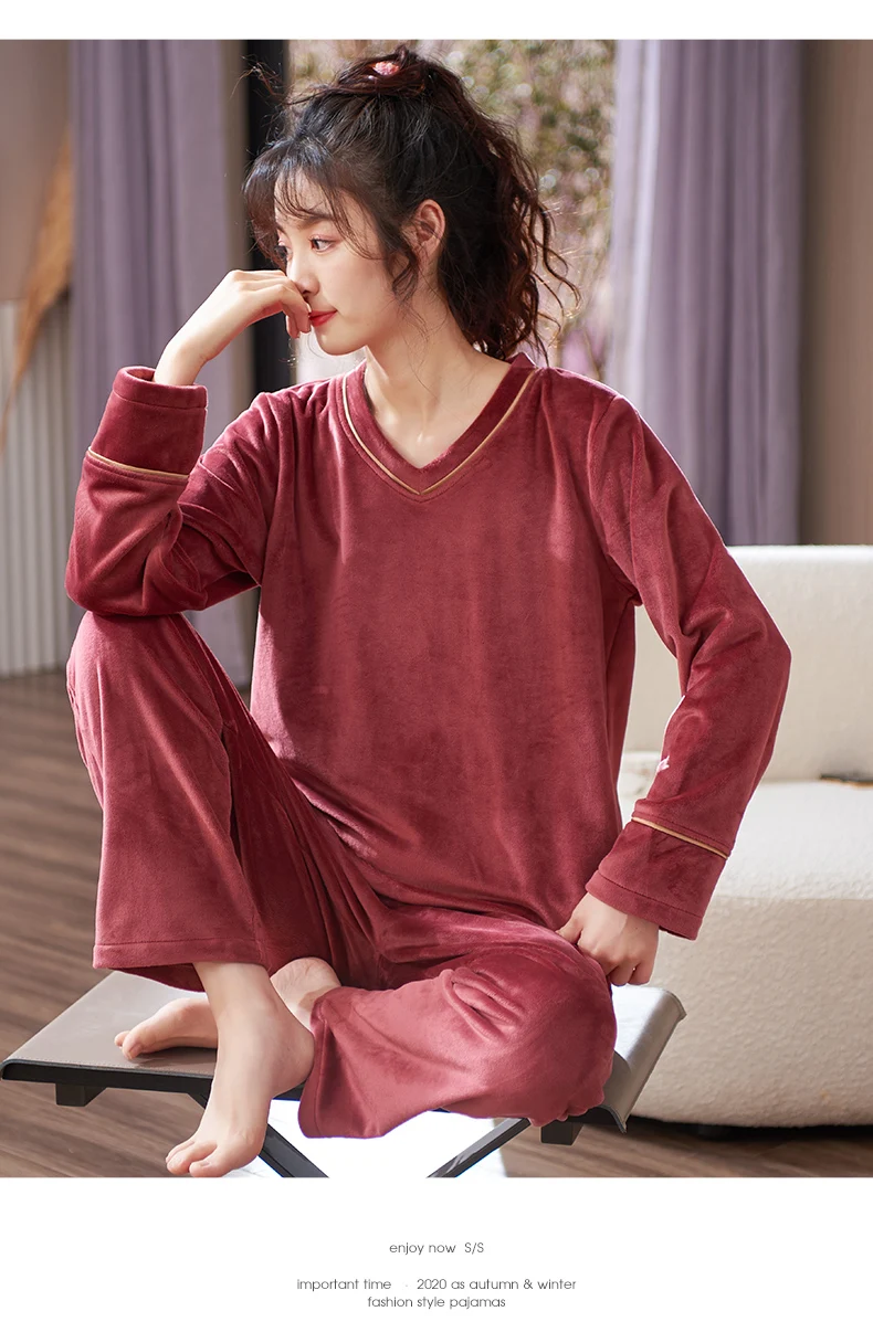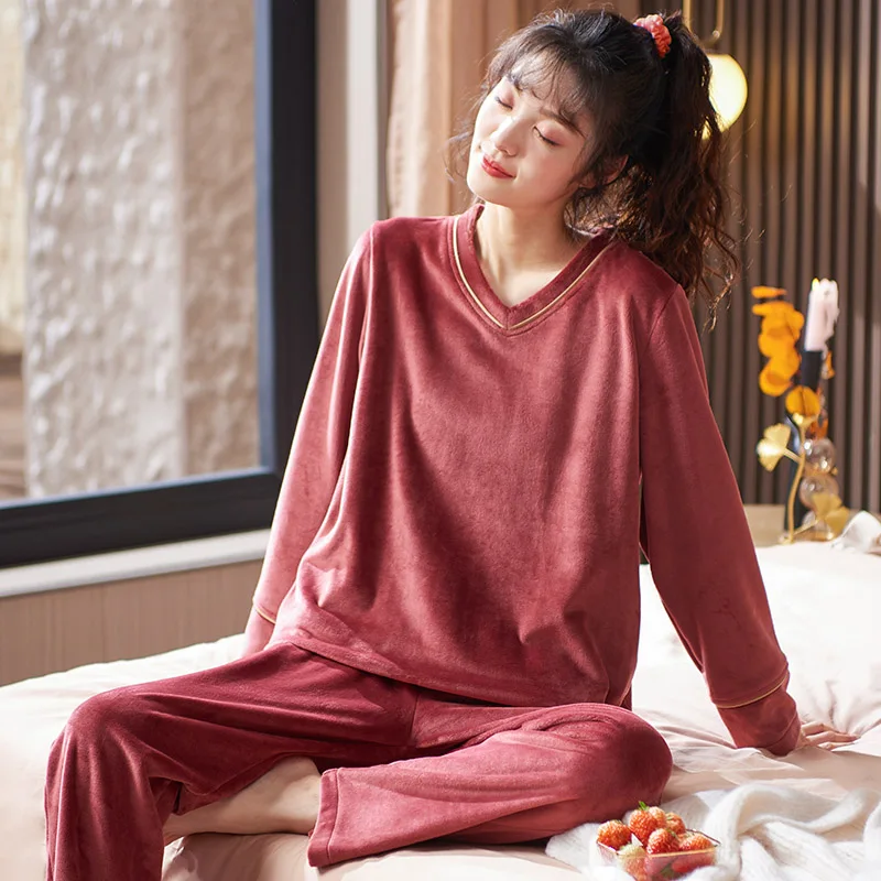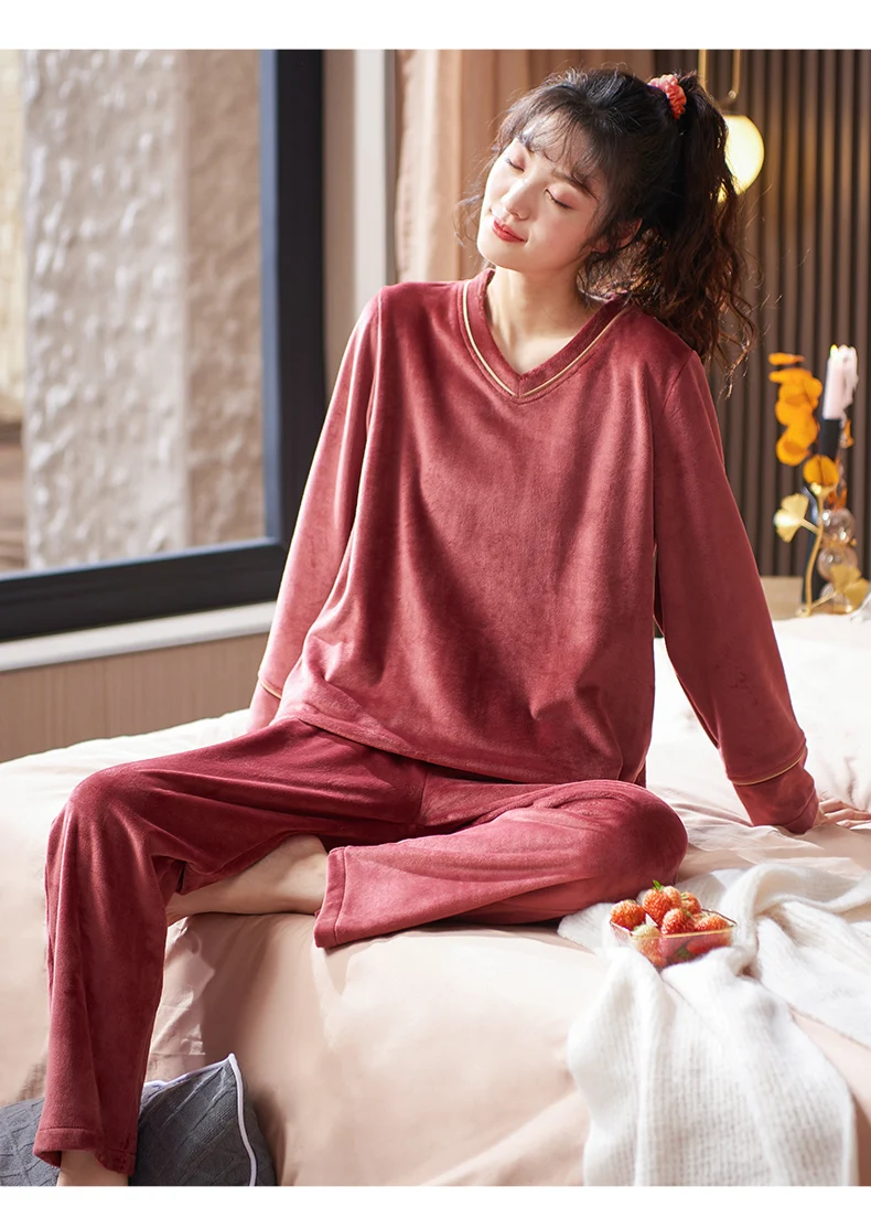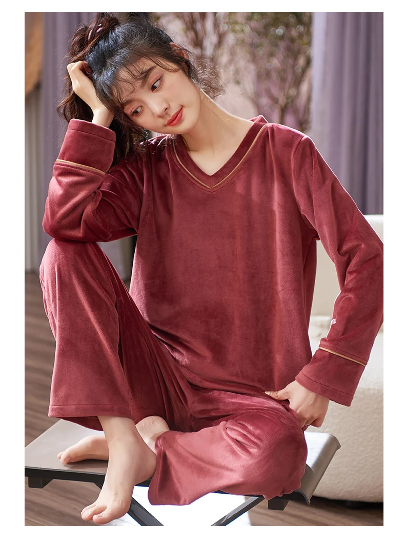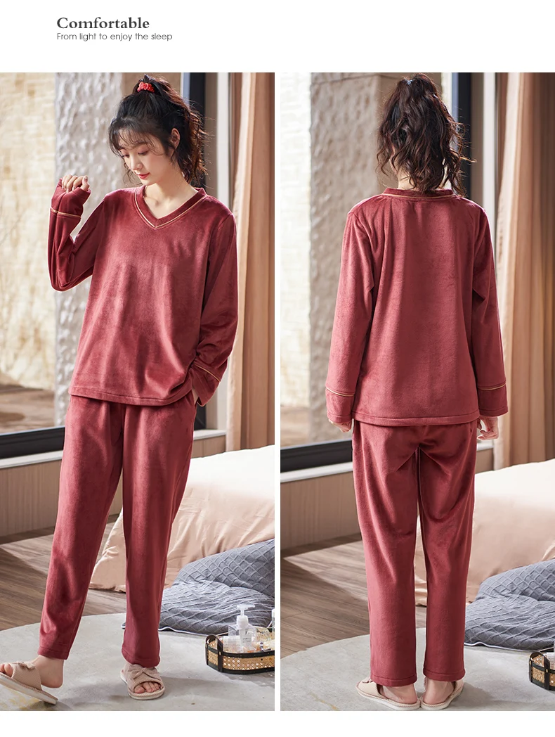 V-Neck Island Velvet Pajamas Winter Women Solid Pajama Set Thick Warm Flannel Female Sleepwear Home Clothes Womens Pajamas Suit