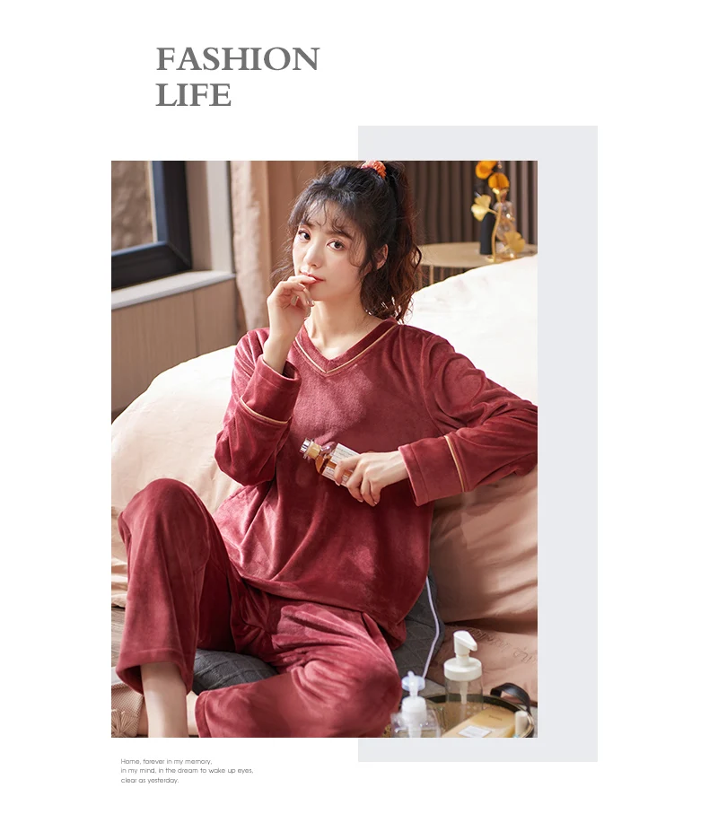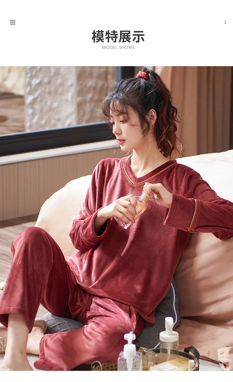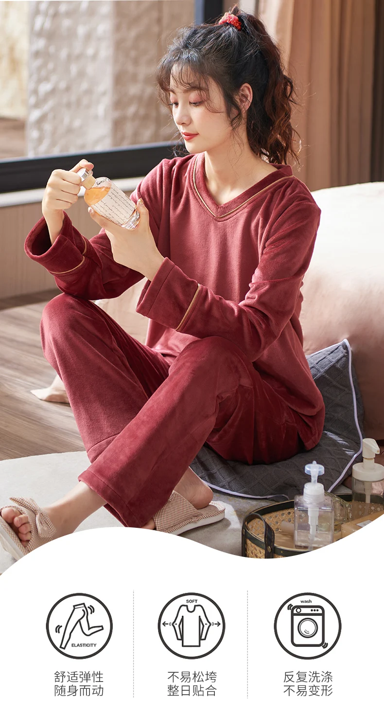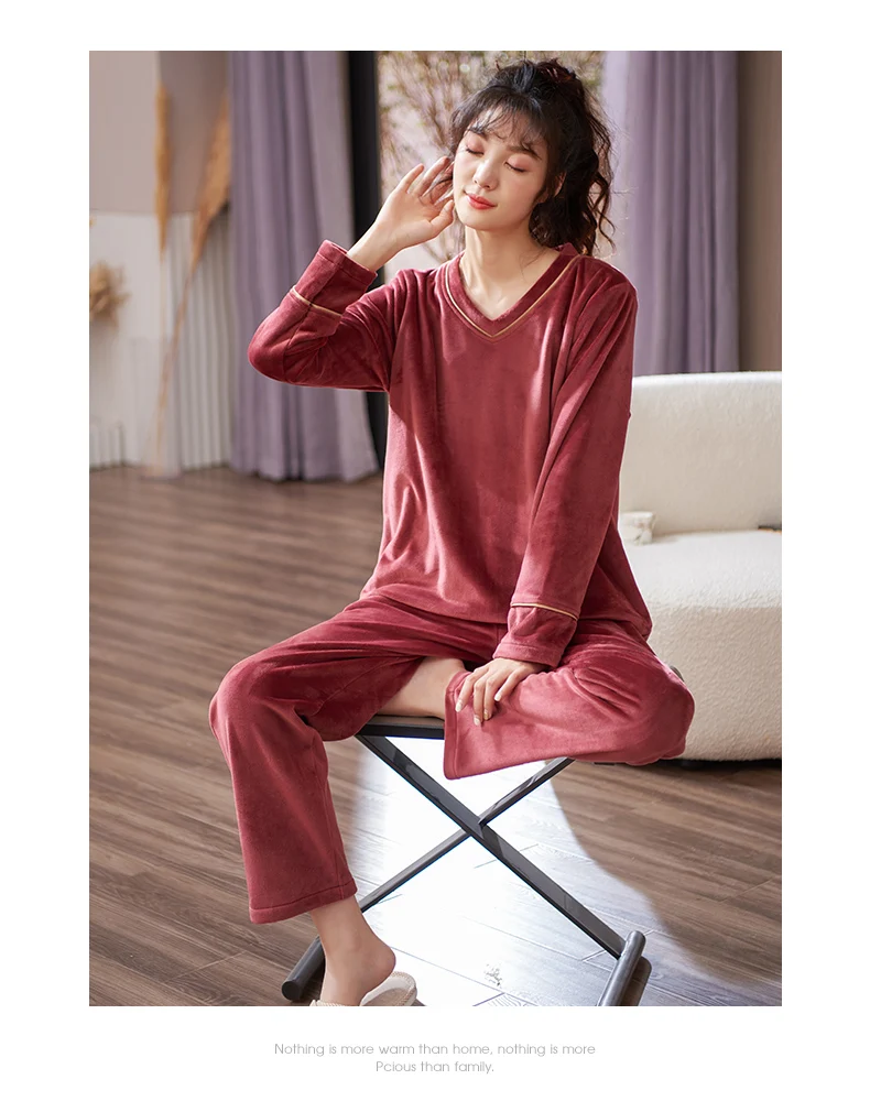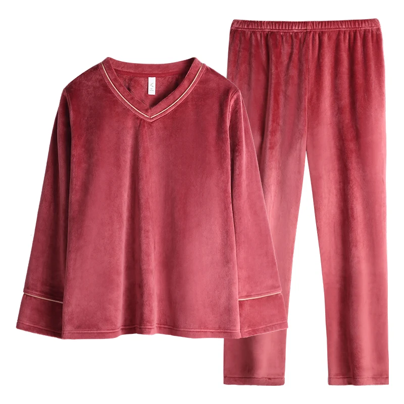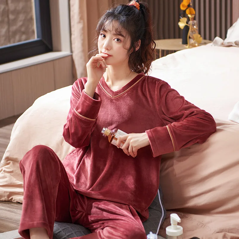 V-Neck Island Velvet Pajamas Winter Women Solid Pajama Set Thick Warm Flannel Female Sleepwear Home Clothes Womens Pajamas Suit