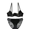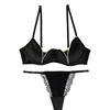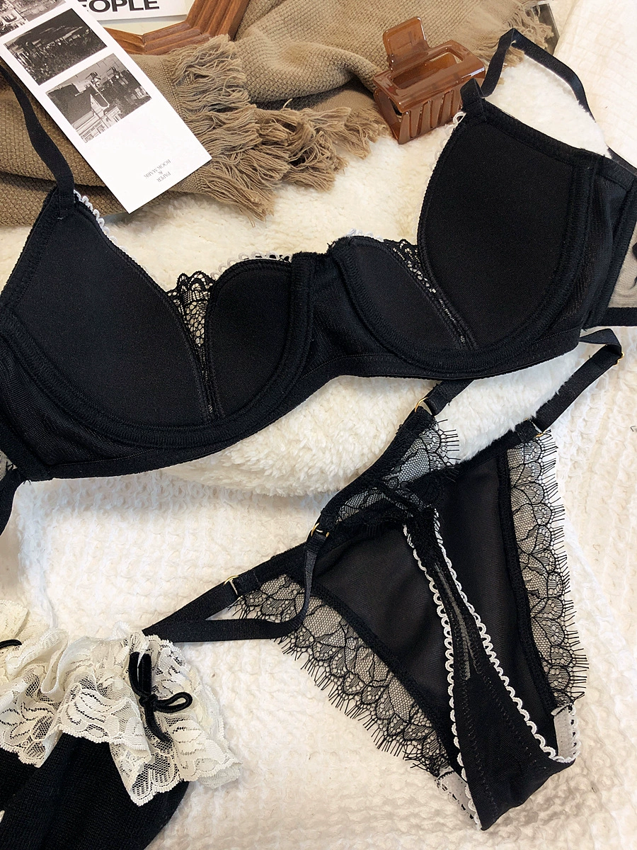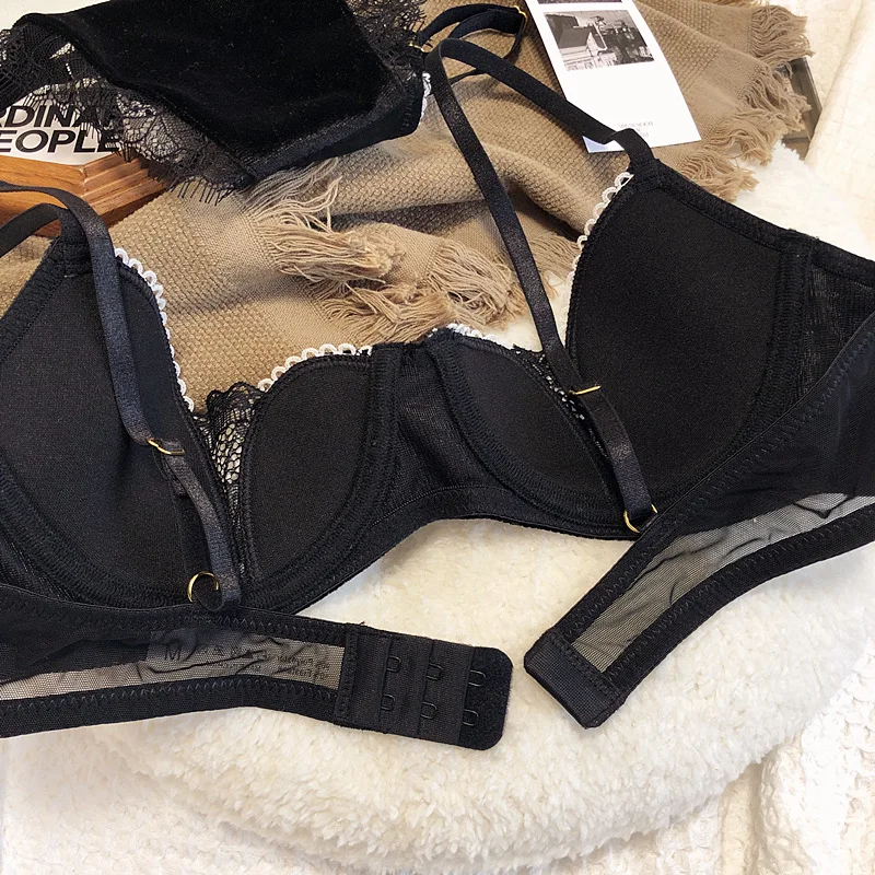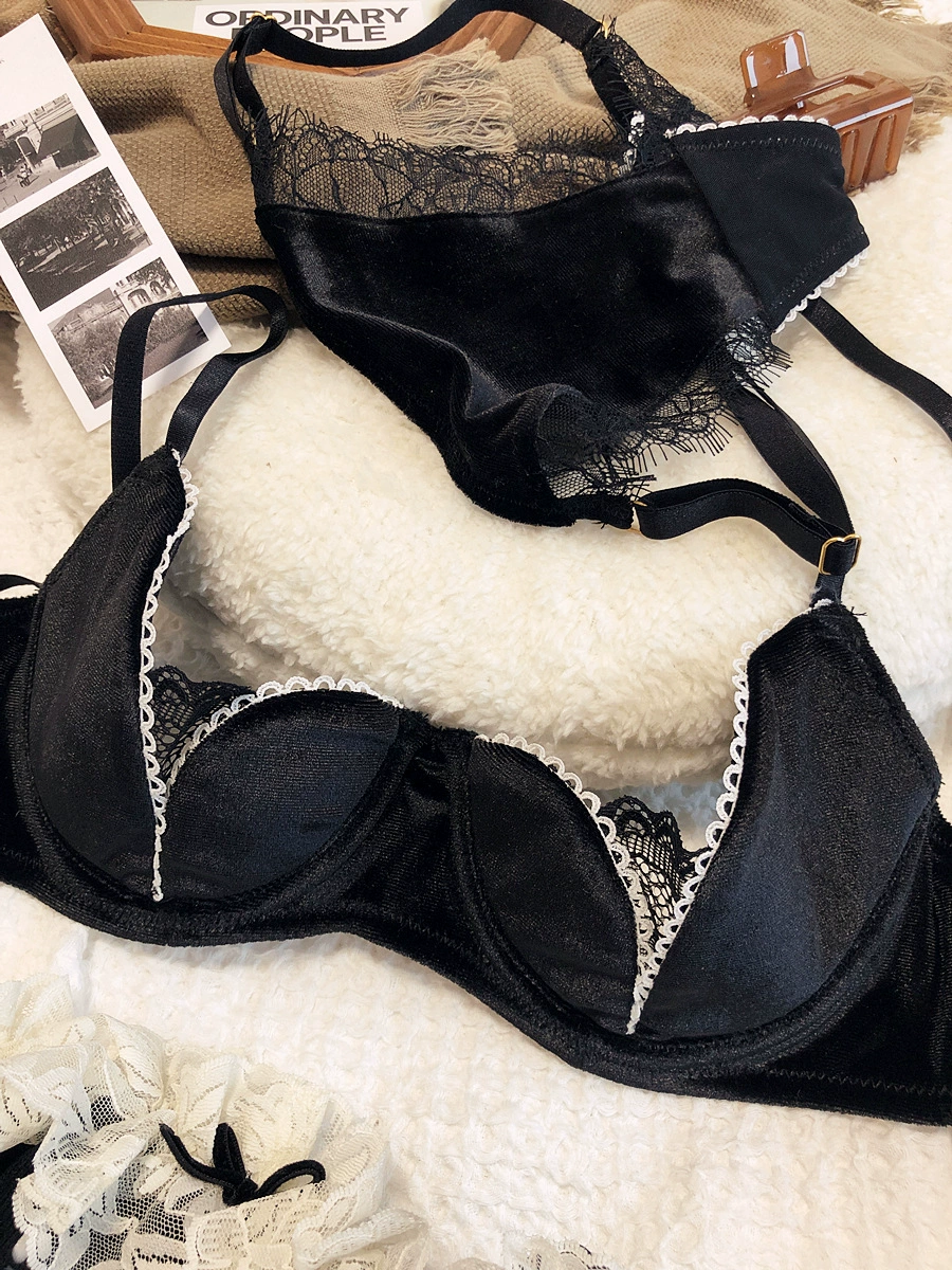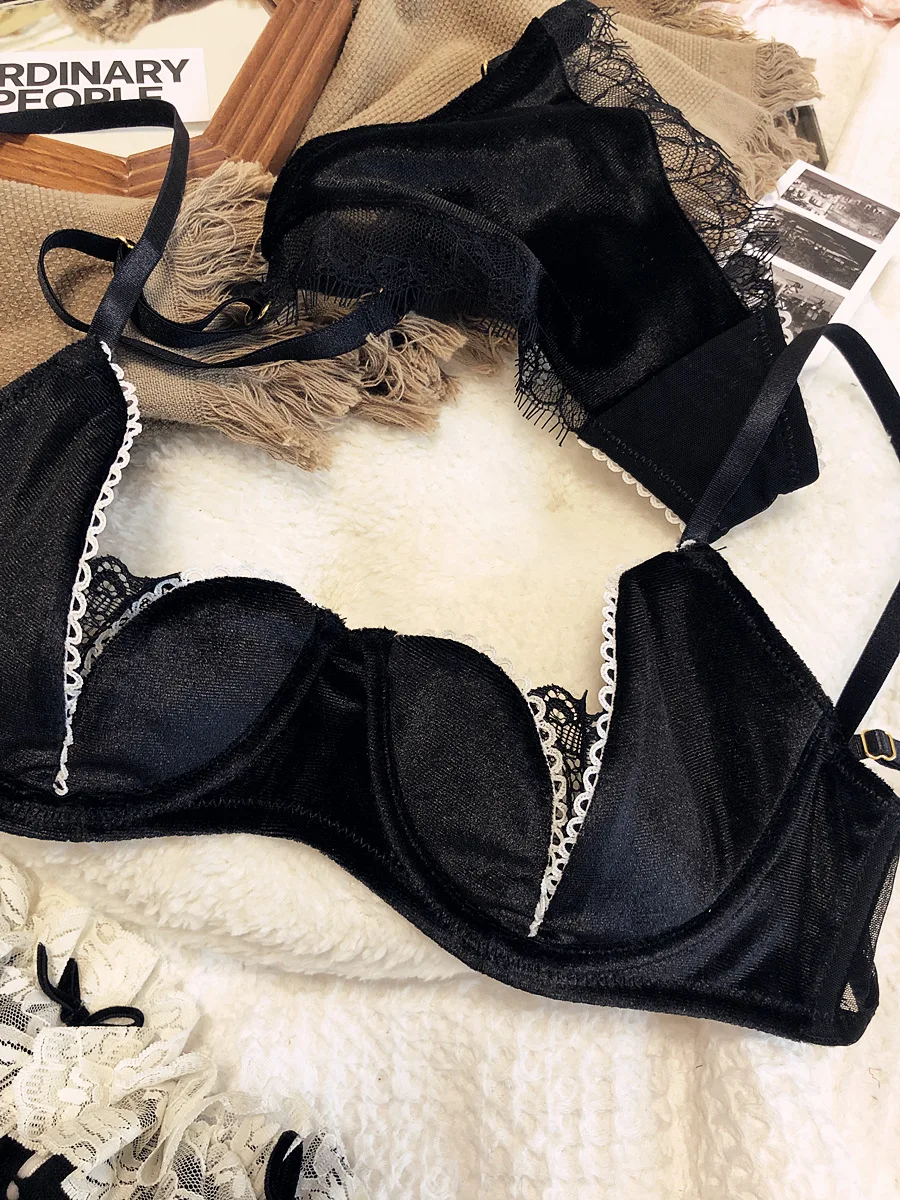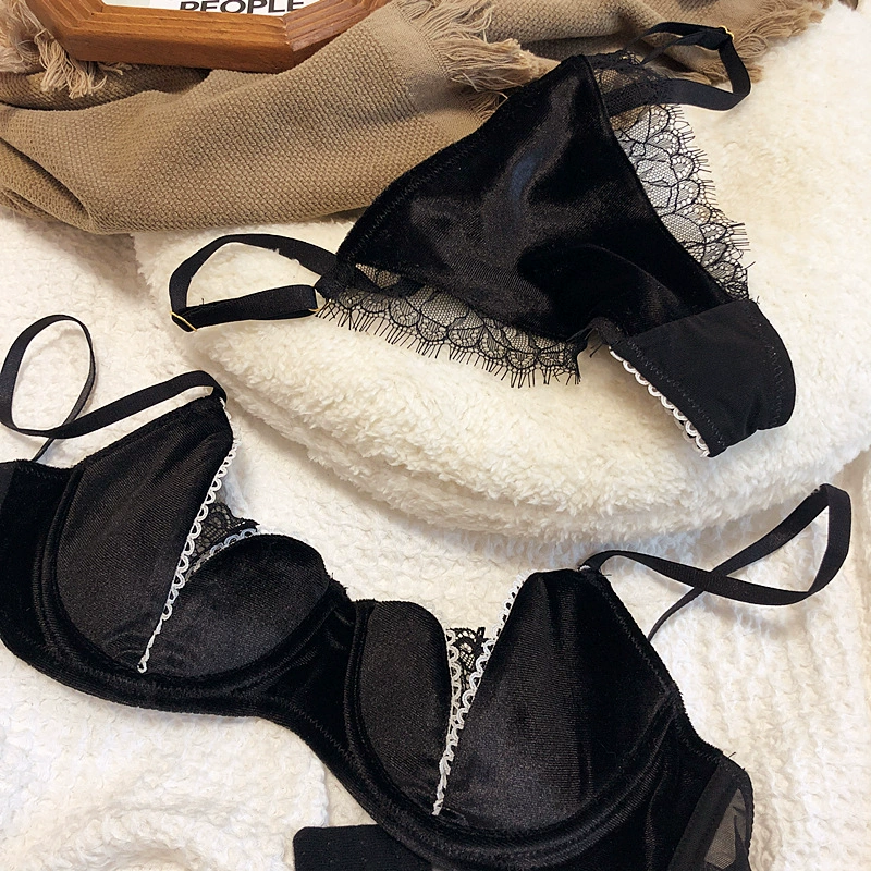 Velvet Lace Black Sexy Elegant Thin Bra Set Soft Steel Ring Large Breasts Show Small Gathering Underwear Women Lingerie Briefs