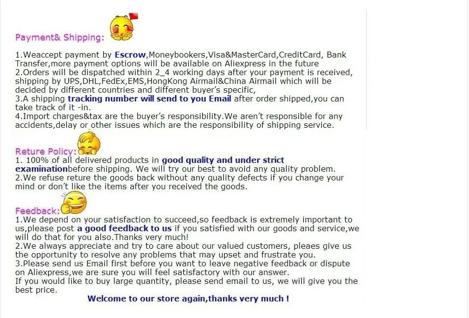 • If you did not receive the product within the guaranteed time( 45 days not including 2-5 day processing) you can request a refund or a reshipment.