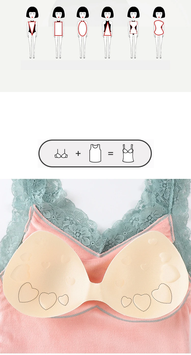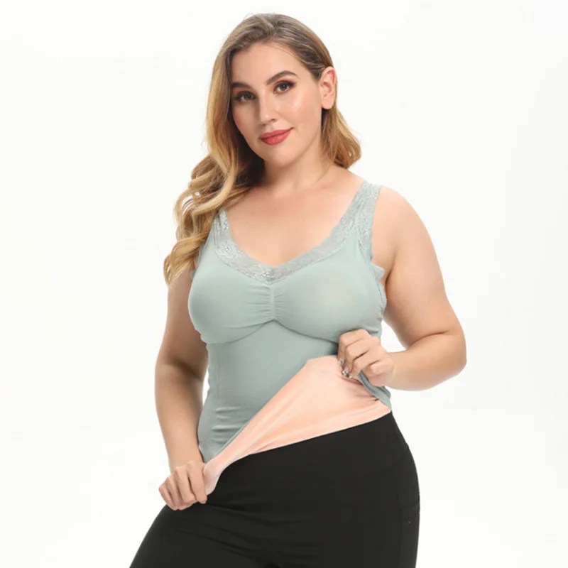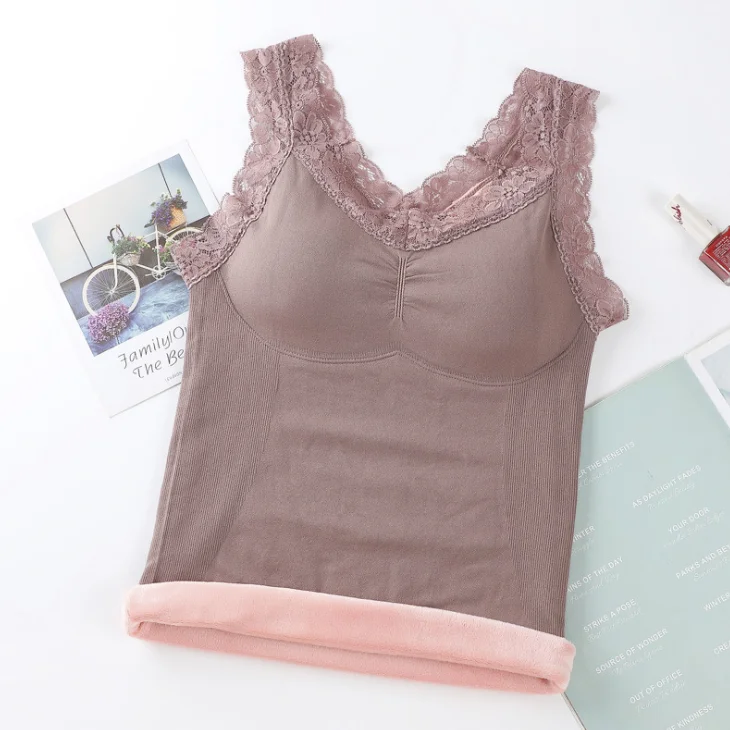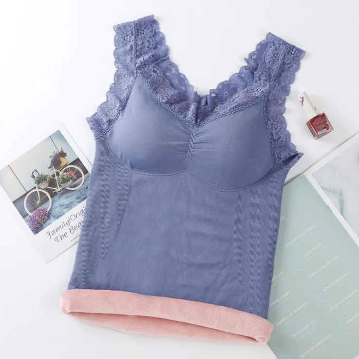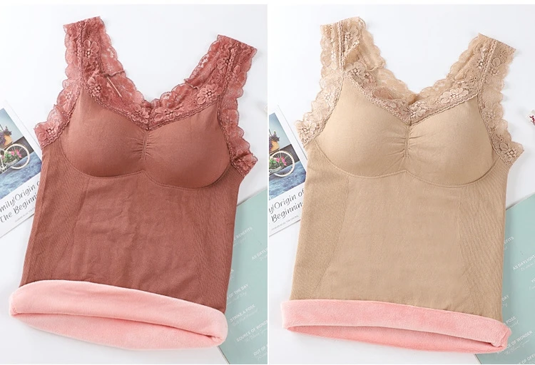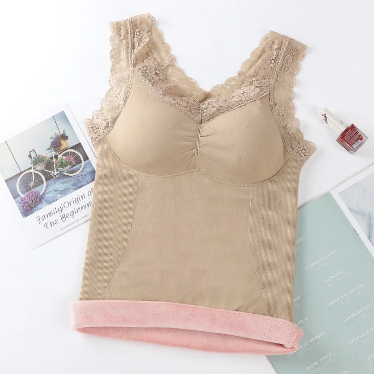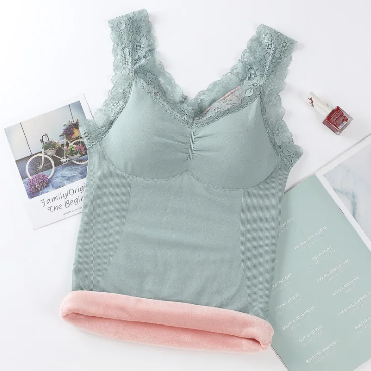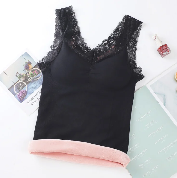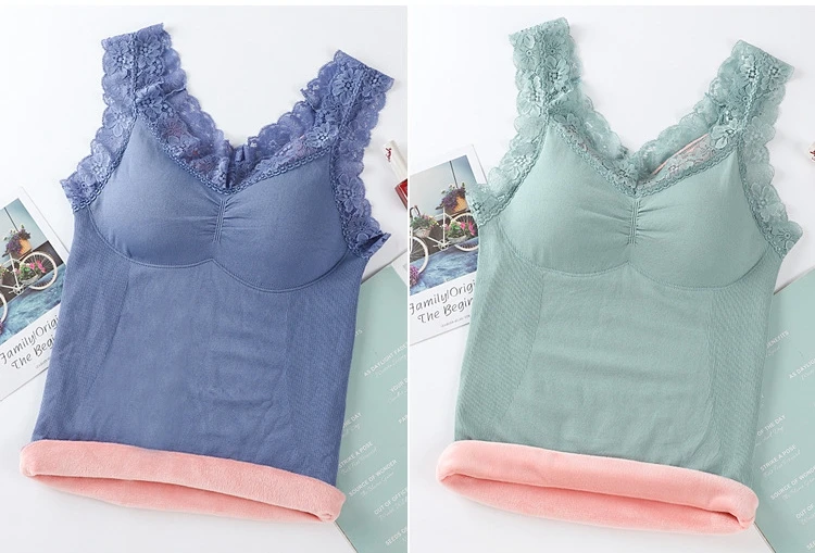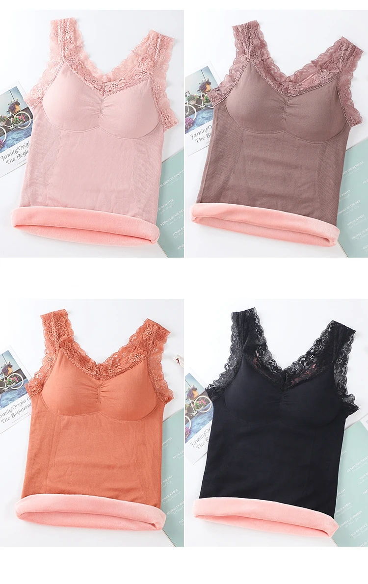 Winter Autumn Plus Velvet Thick Warm Thermal Vest Underwear Lace Soft Elastic Slim Fleece Tank Tops With Chest Pad