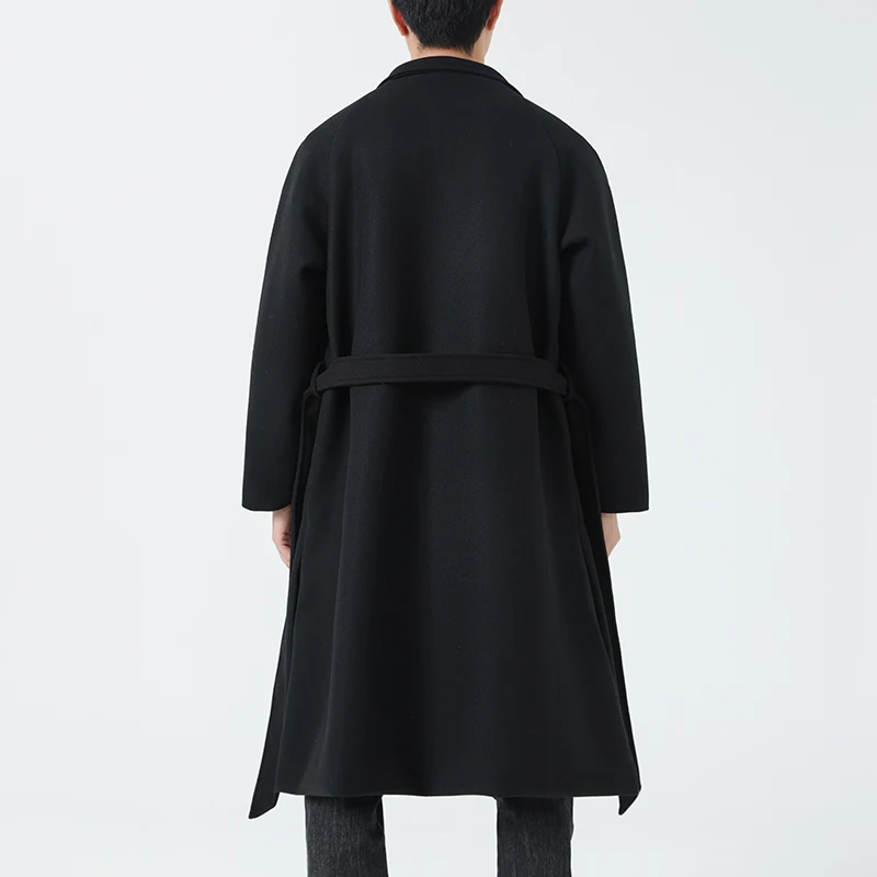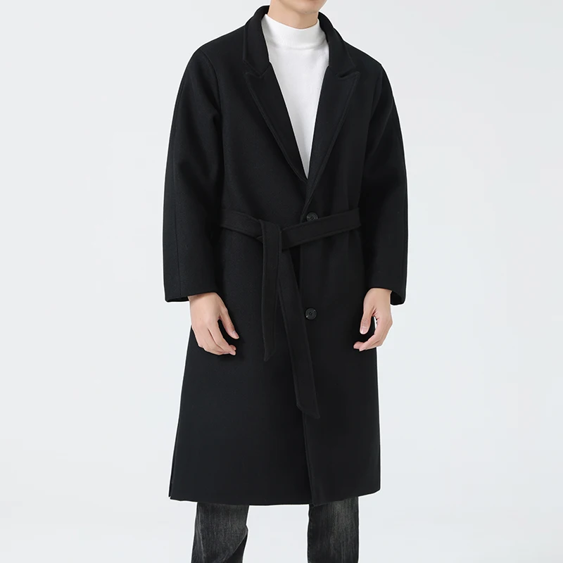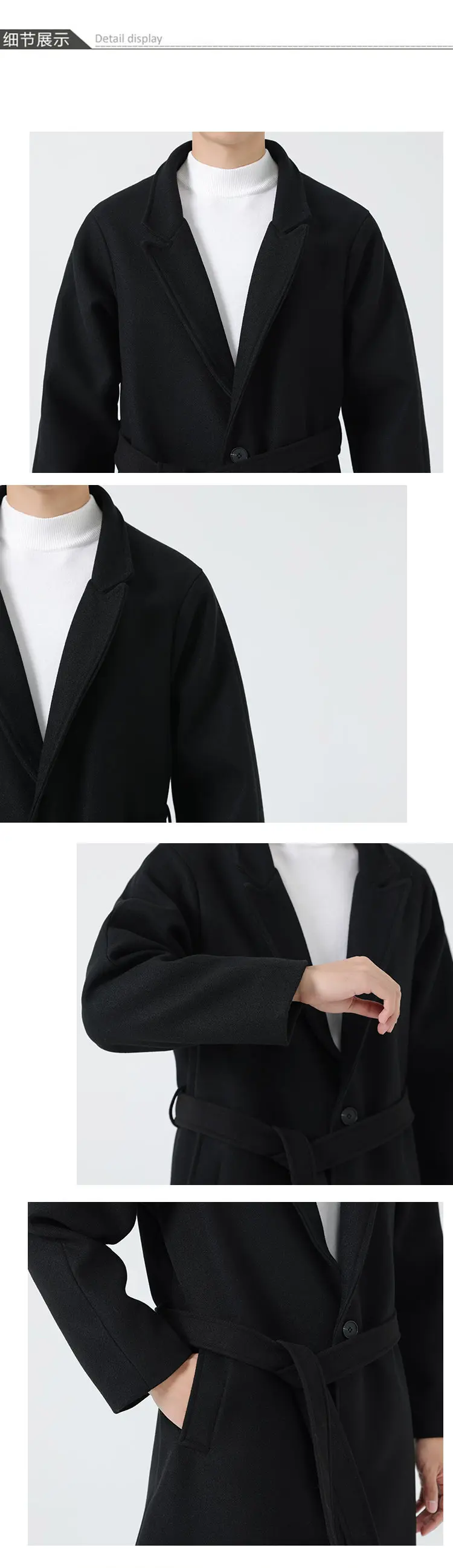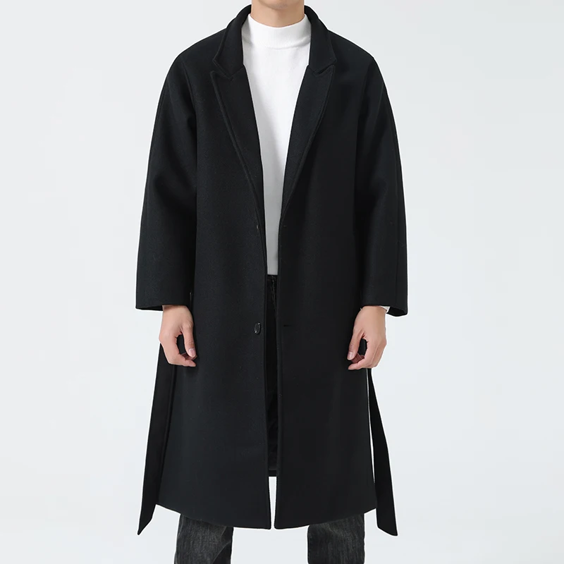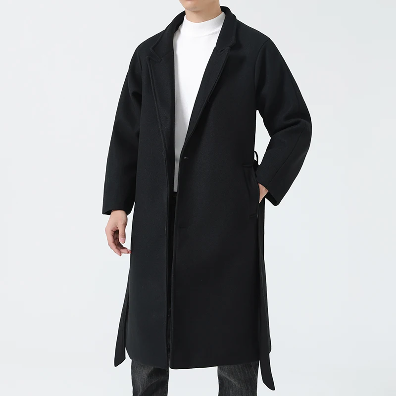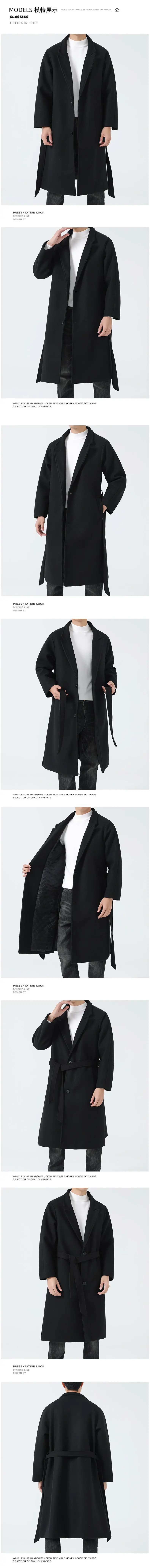 Winter Black Gentleman Overcoats With Belt Mens Elegant Long Jackets Loose Woolen Trench Coats For Cold Fleece-lined Clothing