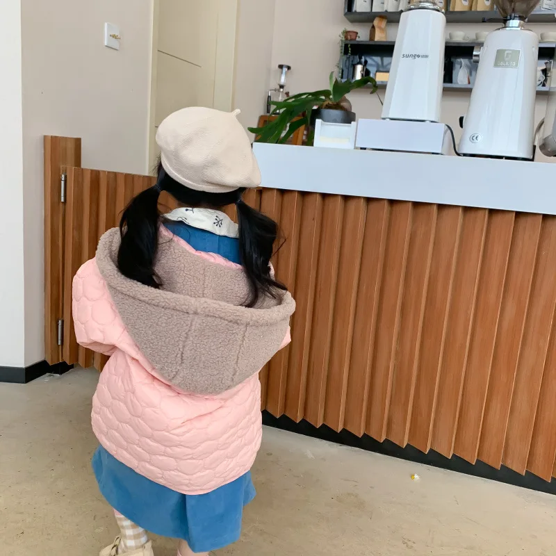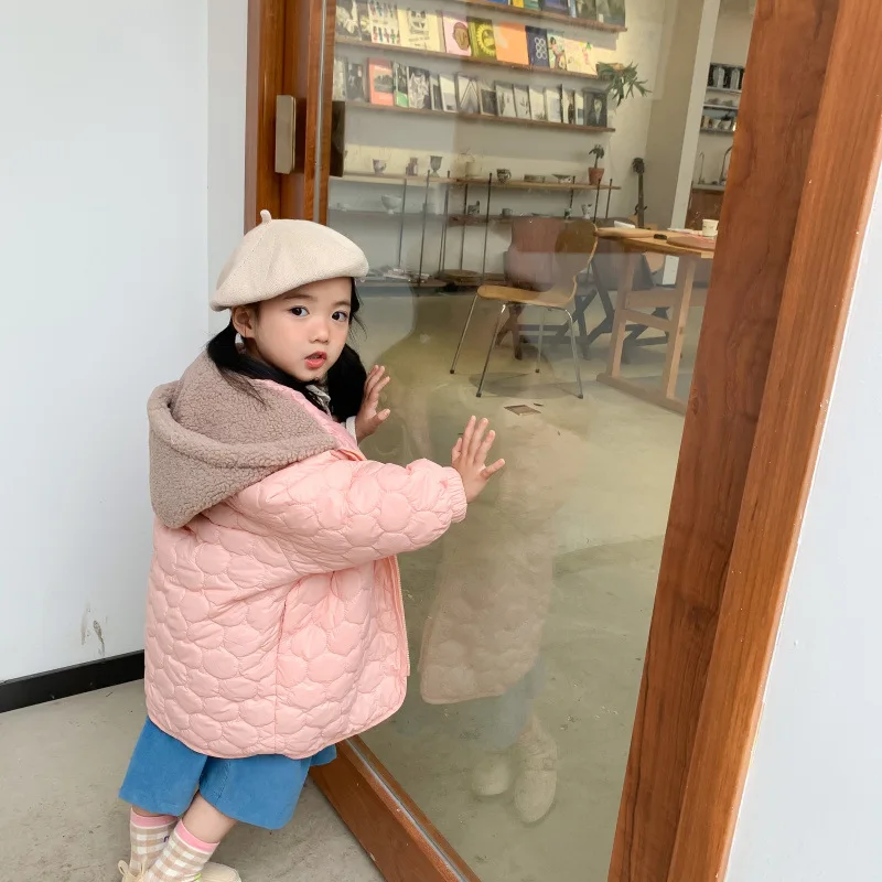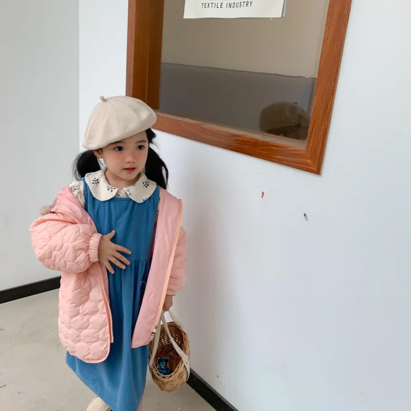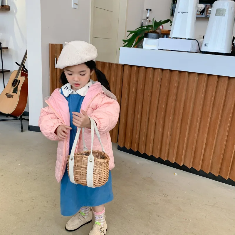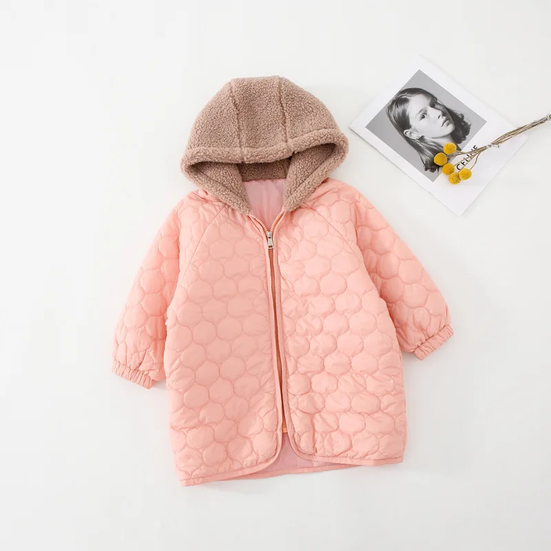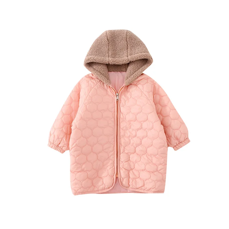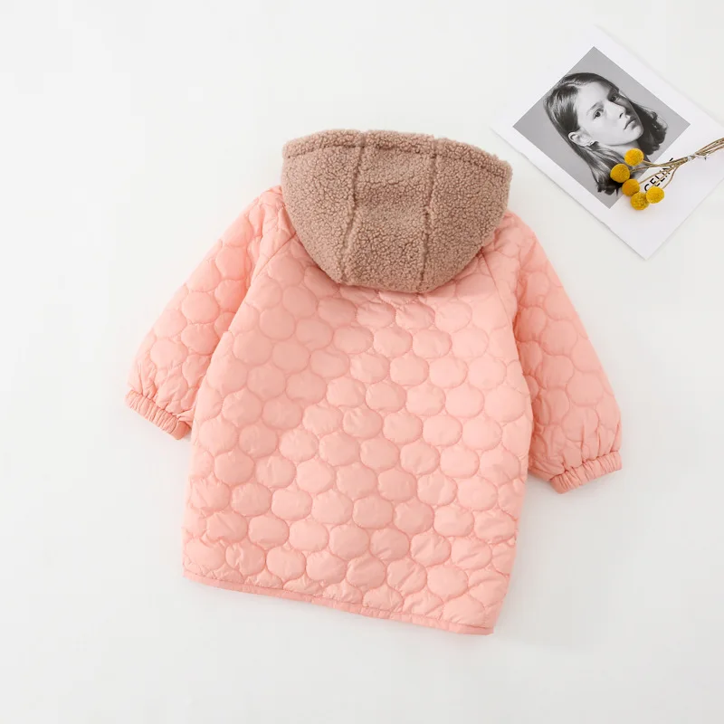 Winter cute girls pink light thin hooded Parkas children long style cotton-padded loose pink coats