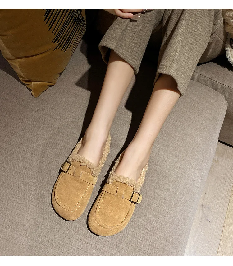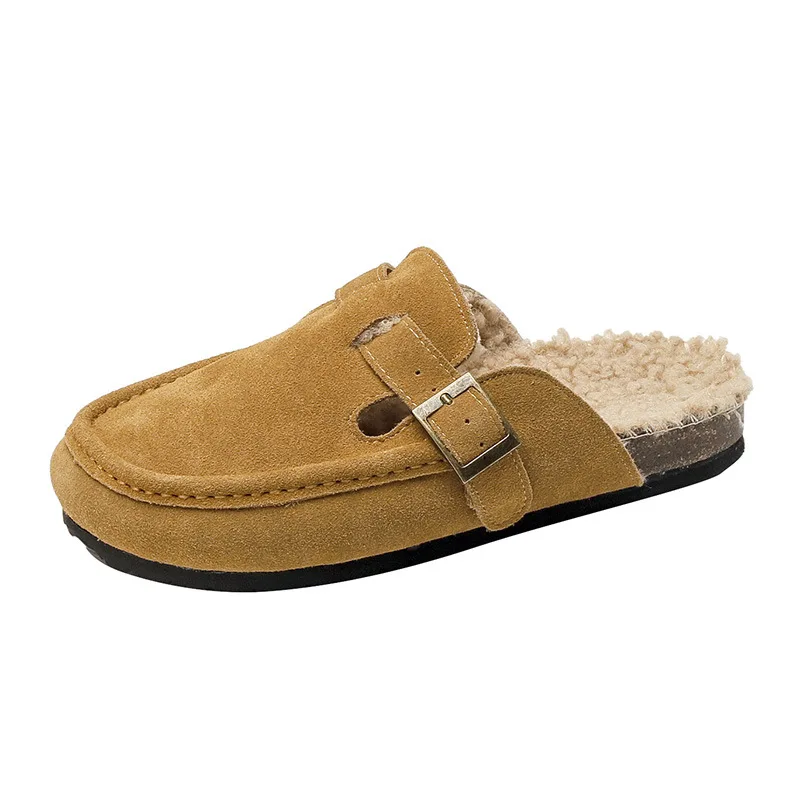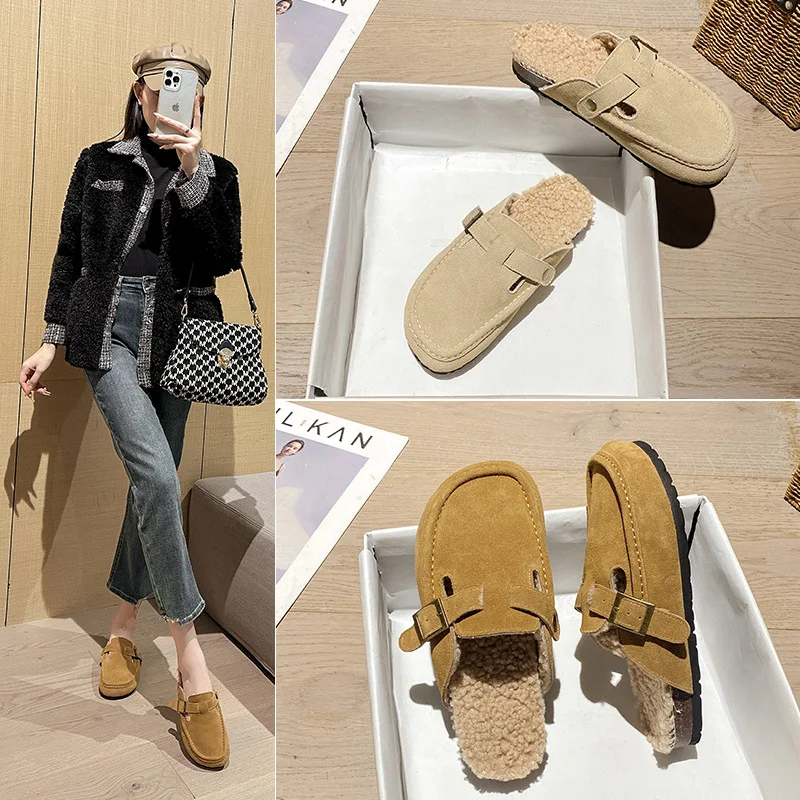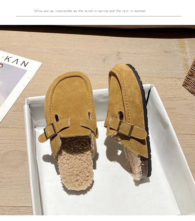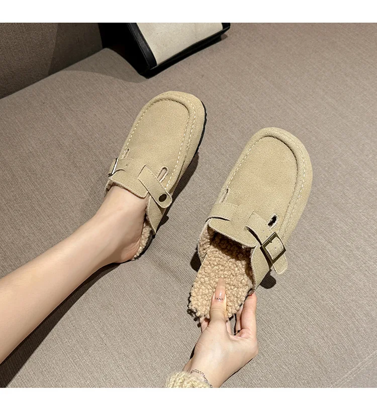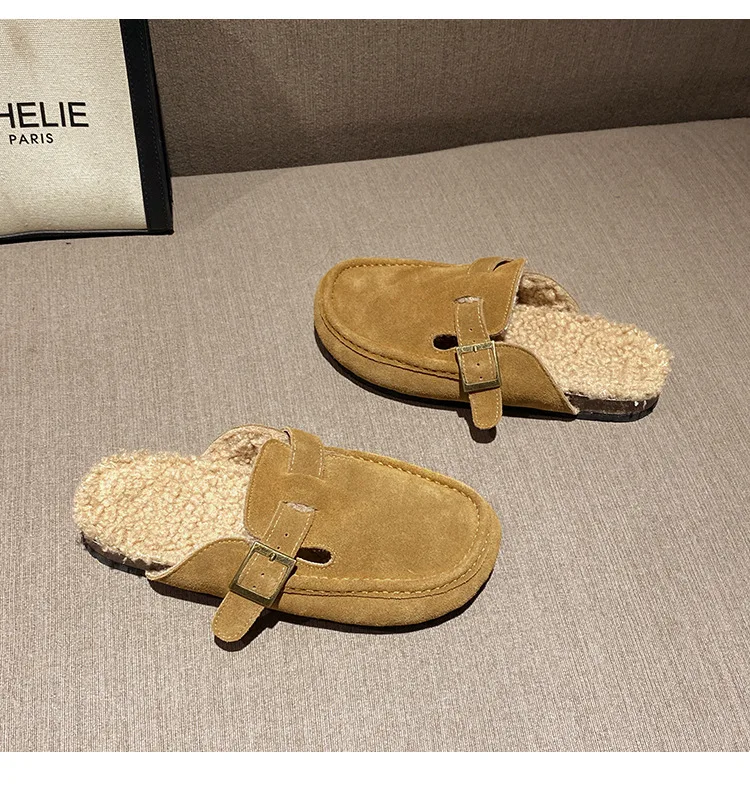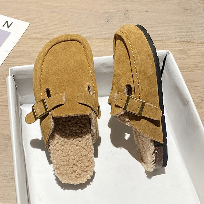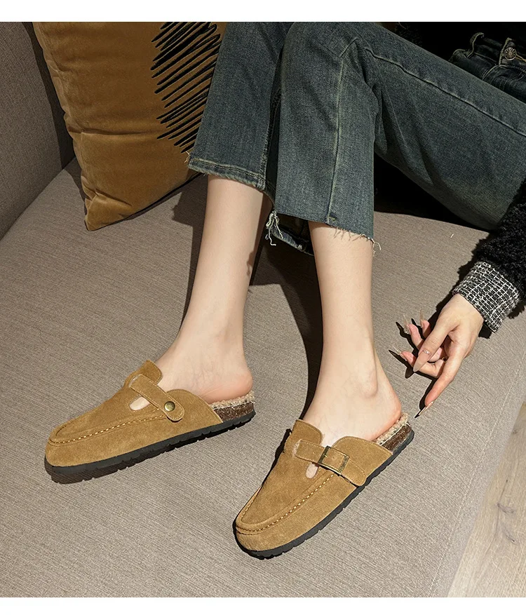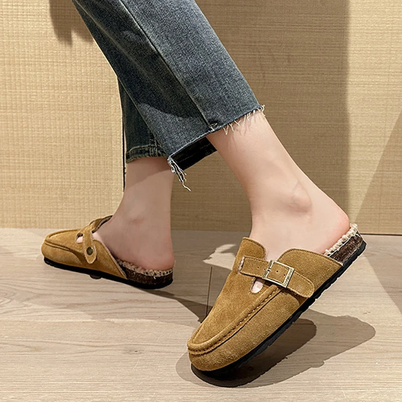 Winter Genuine Leather Pantuflas Shoes Woman Cover Toe Wool Fur Slides Femme Cork Slippers Home Slip On Warm Loafers Furry Mules