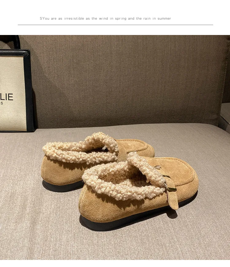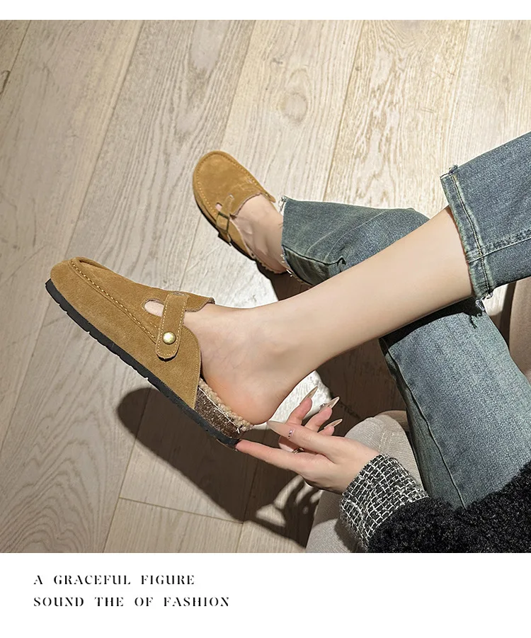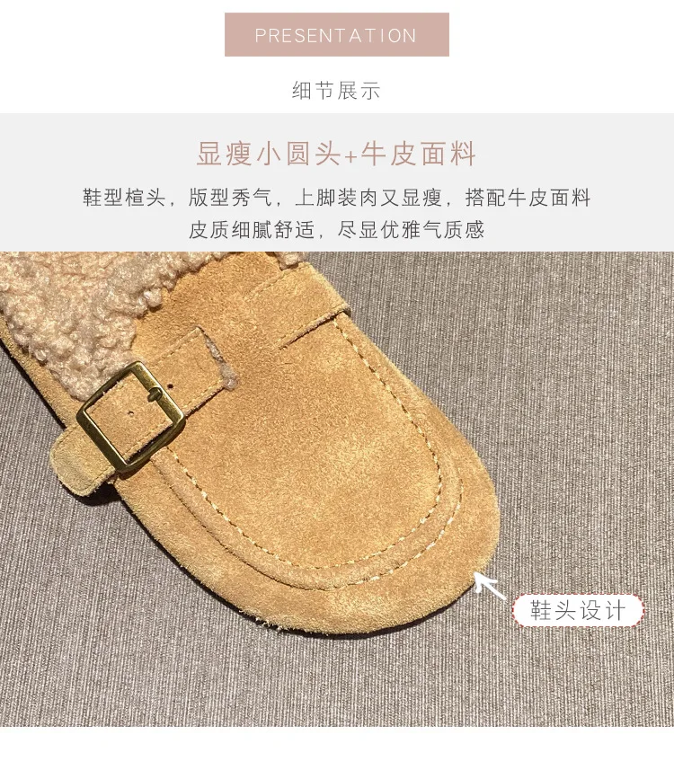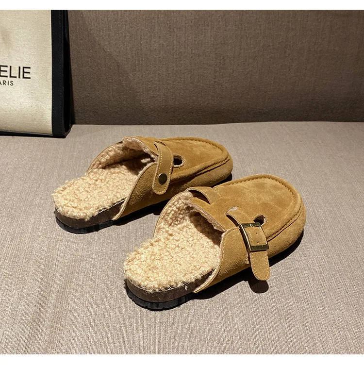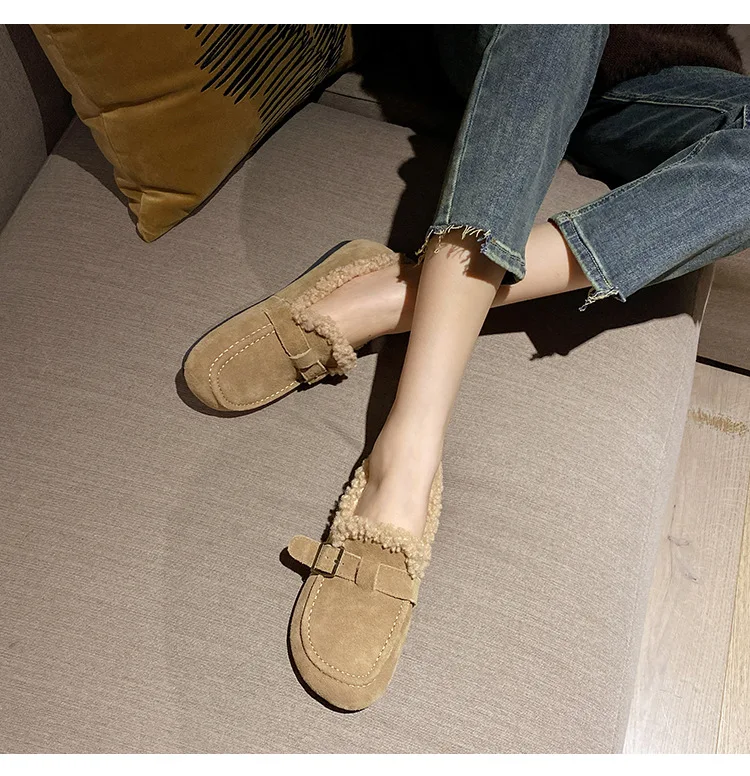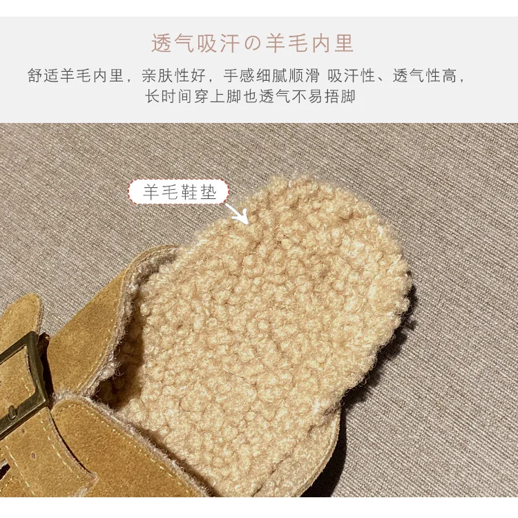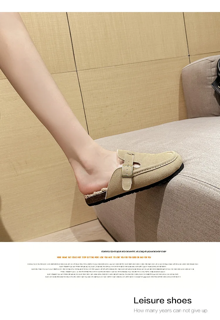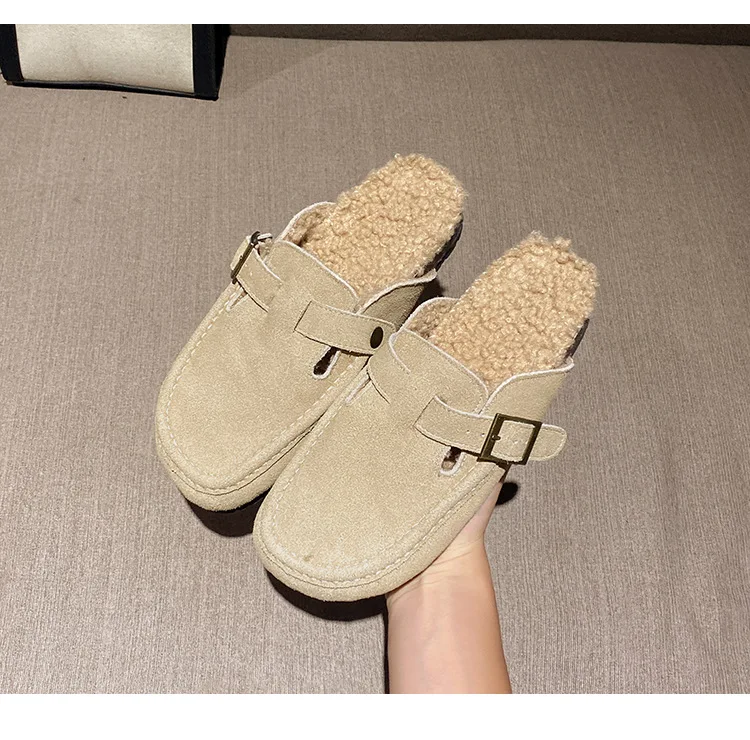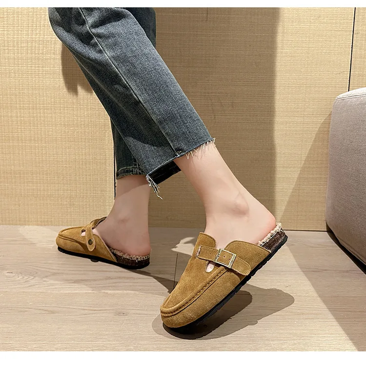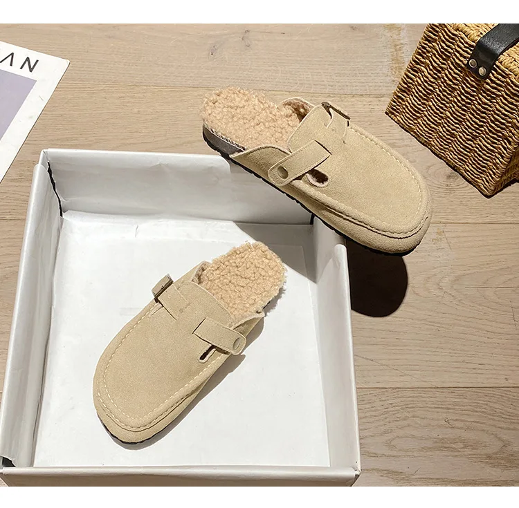 Winter Genuine Leather Pantuflas Shoes Woman Cover Toe Wool Fur Slides Femme Cork Slippers Home Slip On Warm Loafers Furry Mules