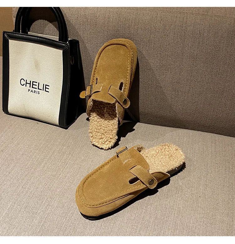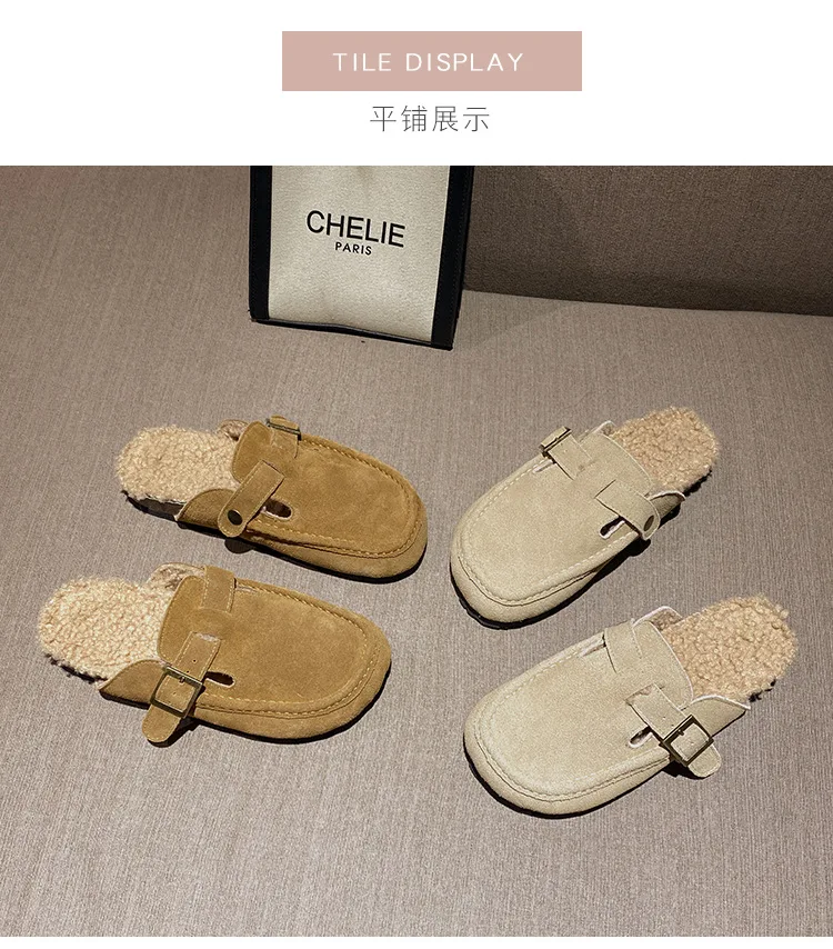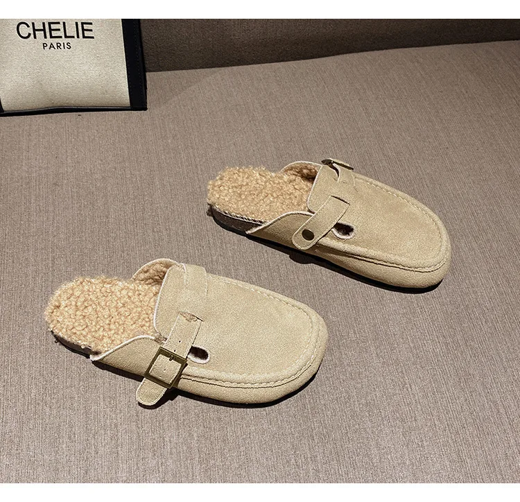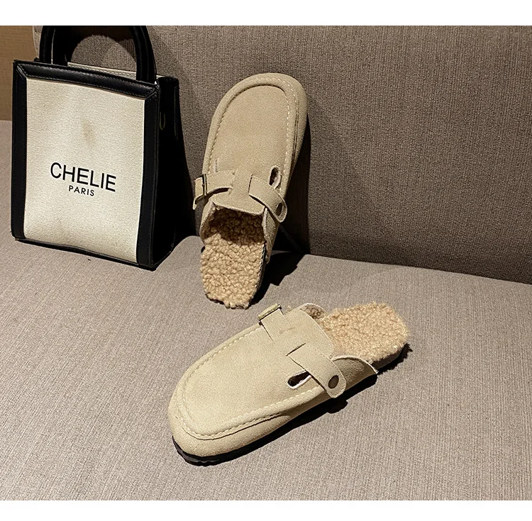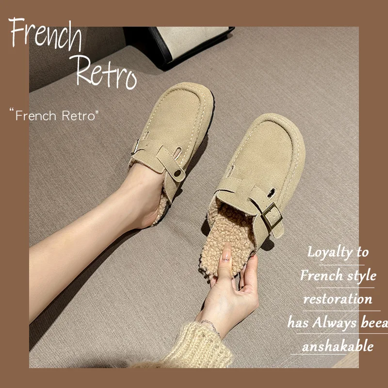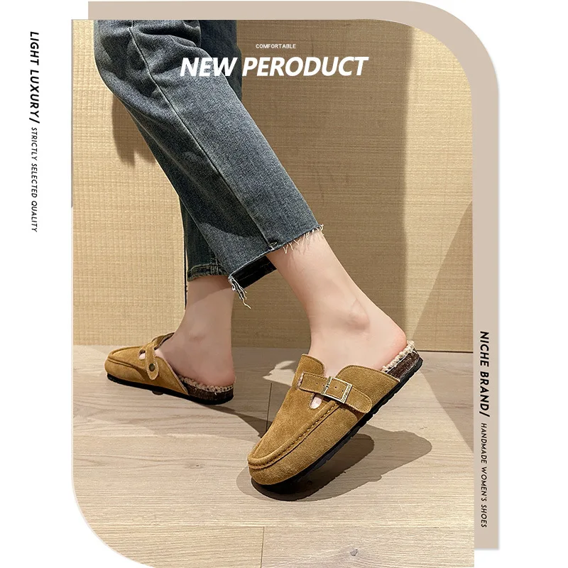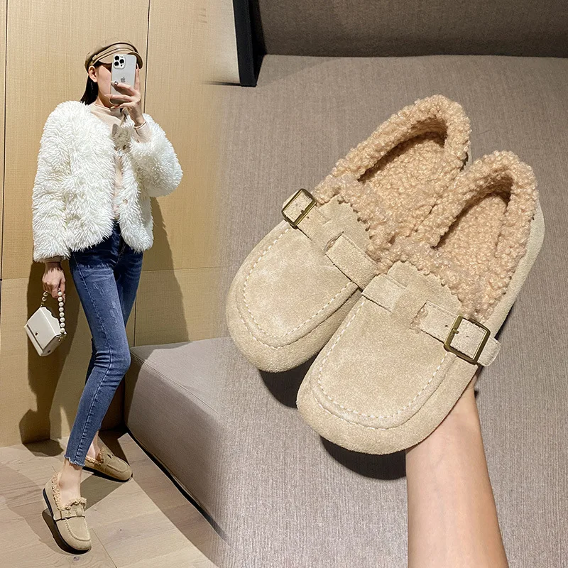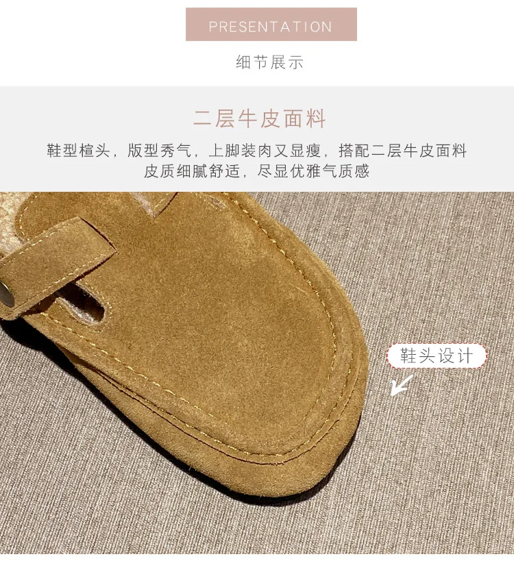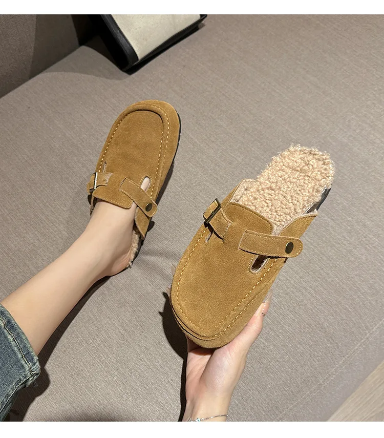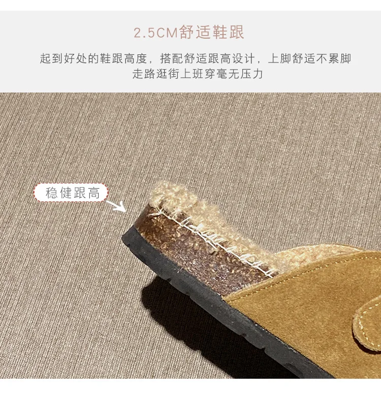 Winter Genuine Leather Pantuflas Shoes Woman Cover Toe Wool Fur Slides Femme Cork Slippers Home Slip On Warm Loafers Furry Mules