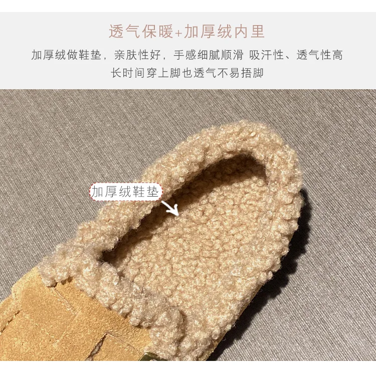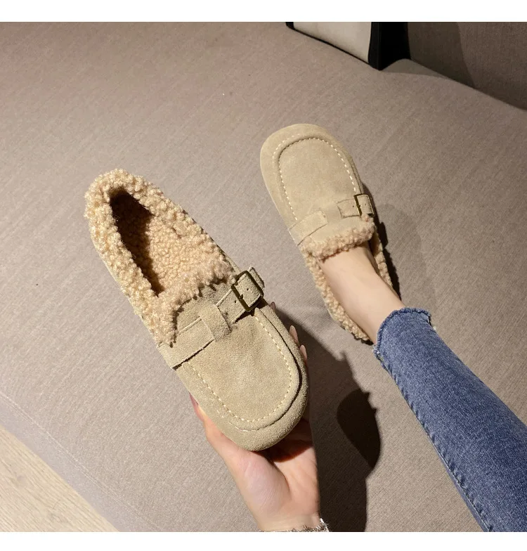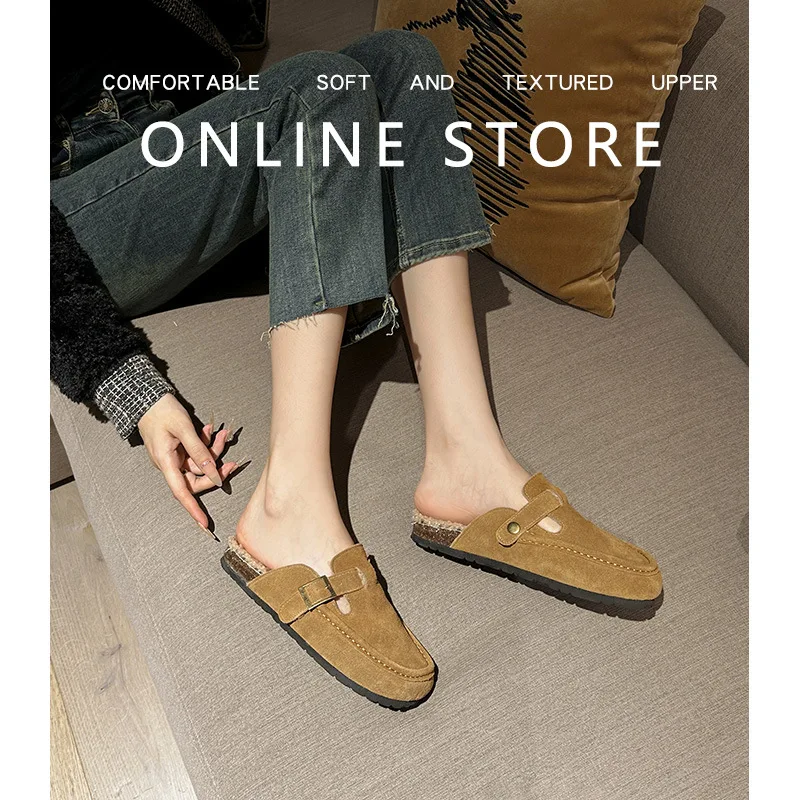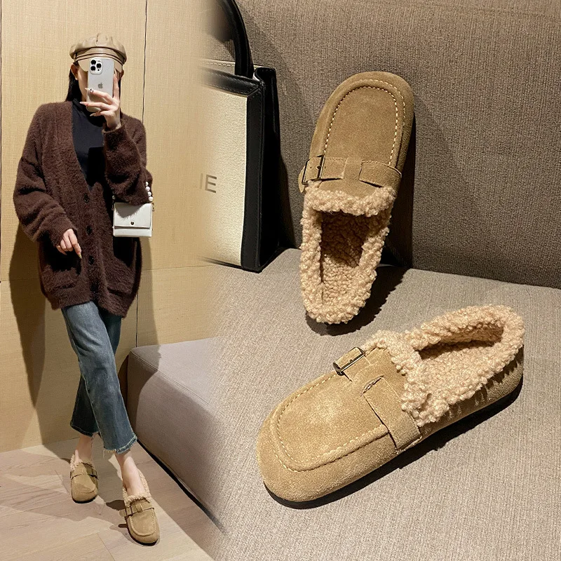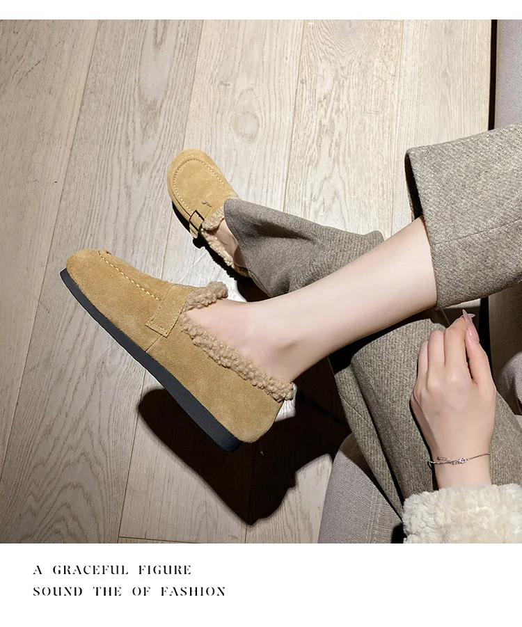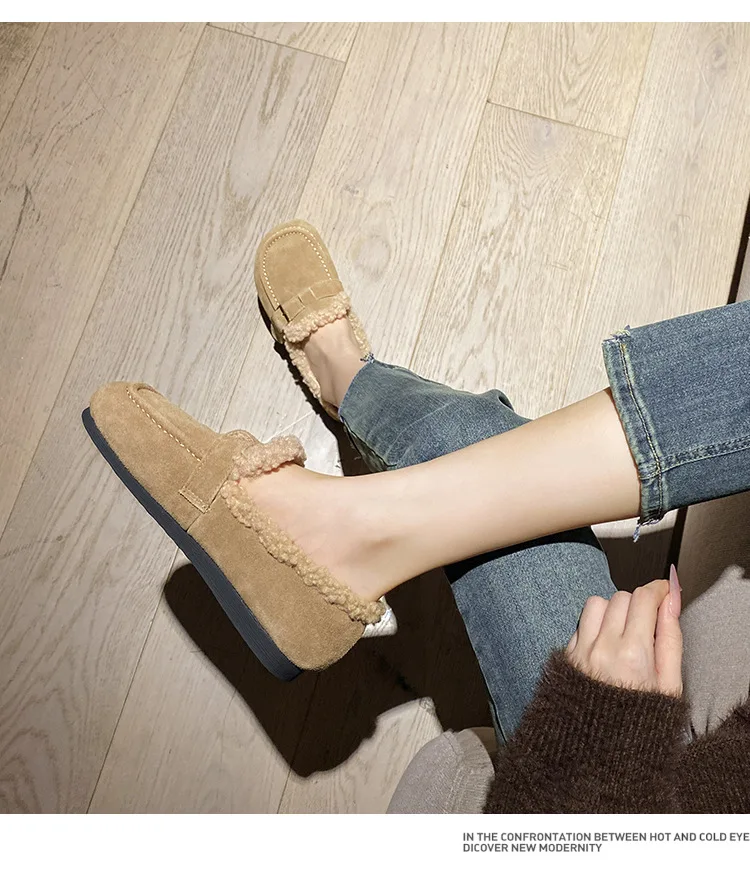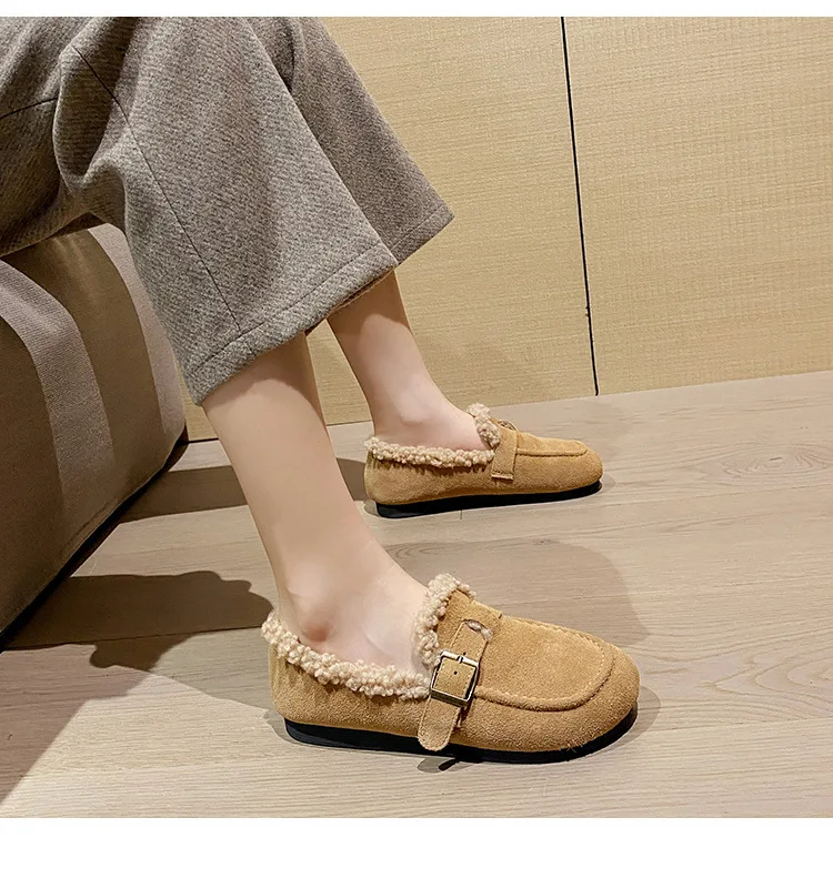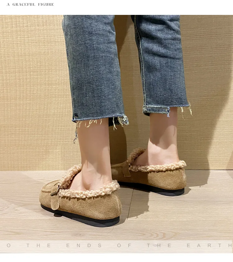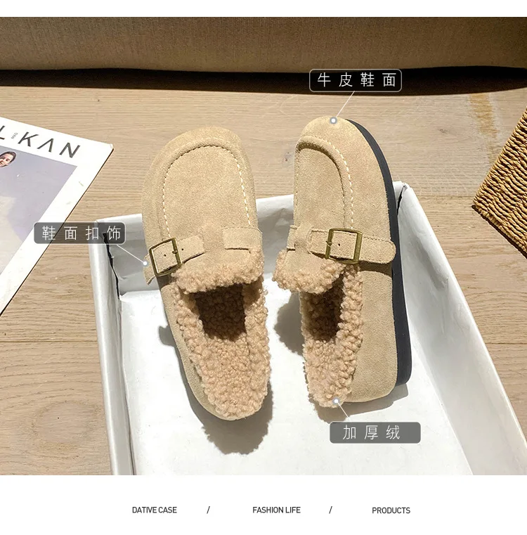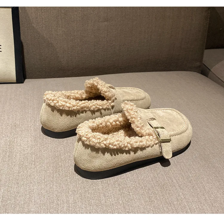 Winter Genuine Leather Pantuflas Shoes Woman Cover Toe Wool Fur Slides Femme Cork Slippers Home Slip On Warm Loafers Furry Mules