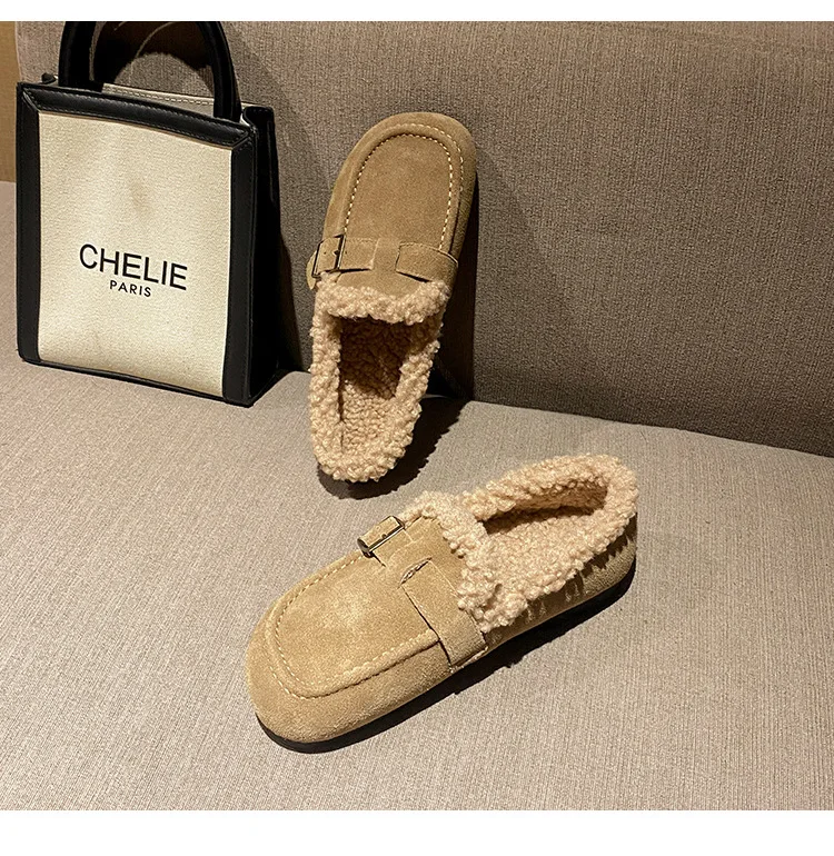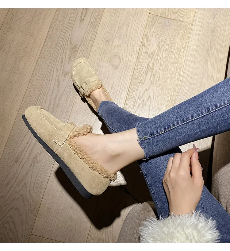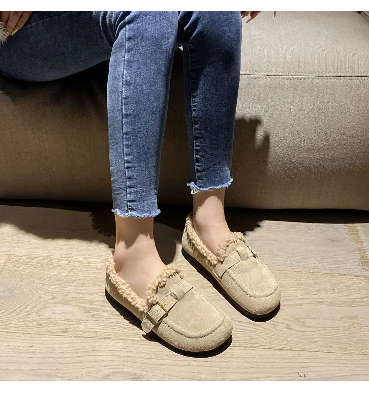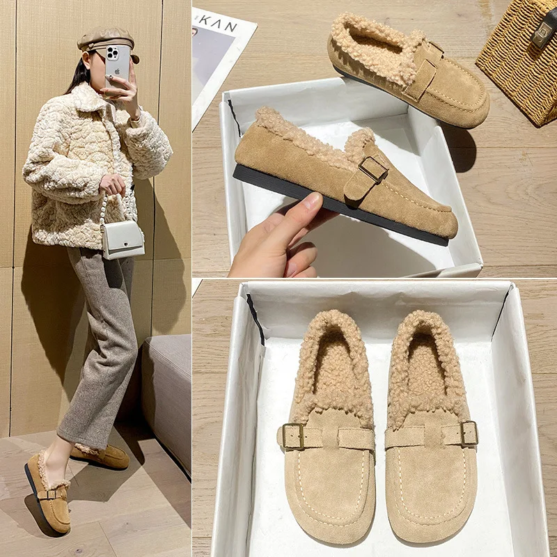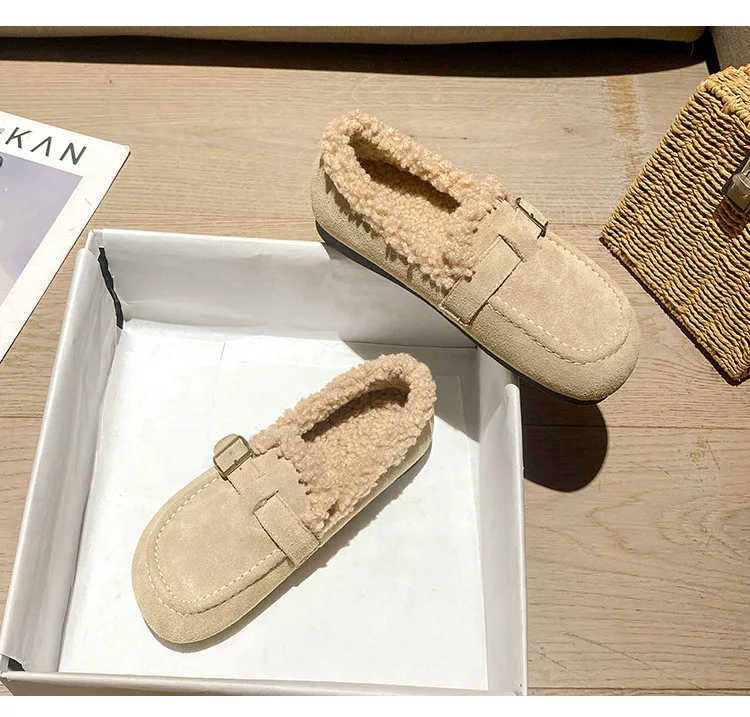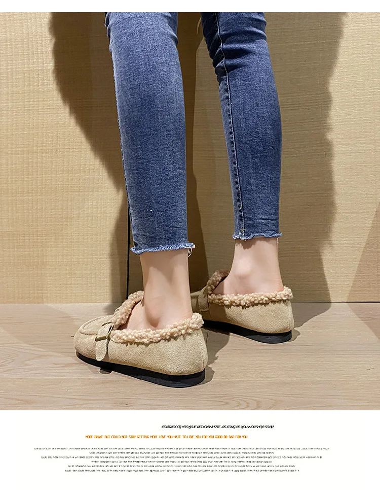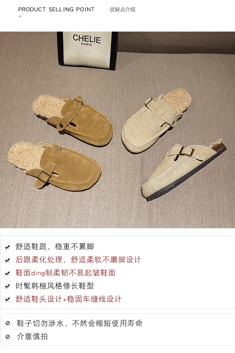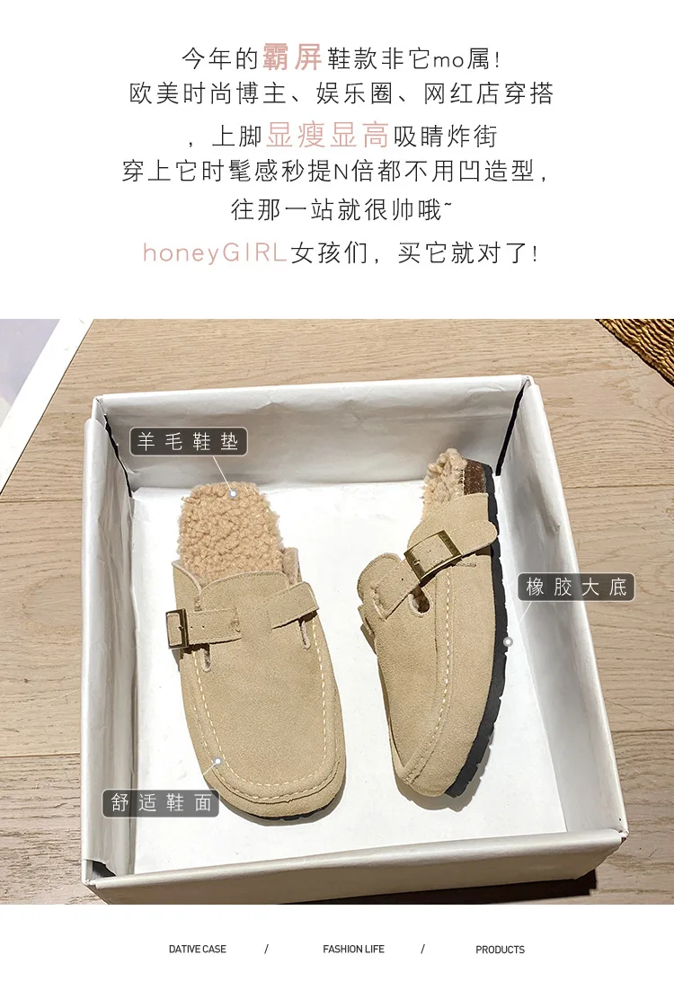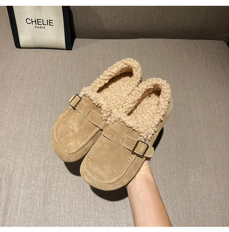 Winter Genuine Leather Pantuflas Shoes Woman Cover Toe Wool Fur Slides Femme Cork Slippers Home Slip On Warm Loafers Furry Mules