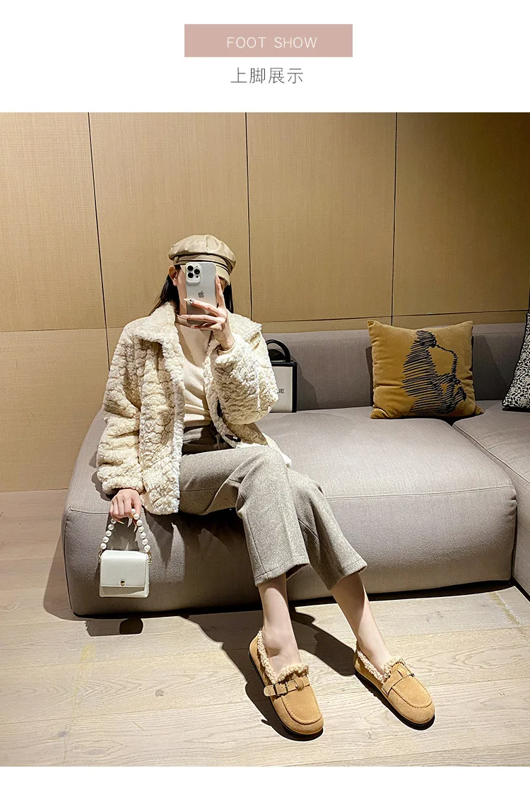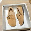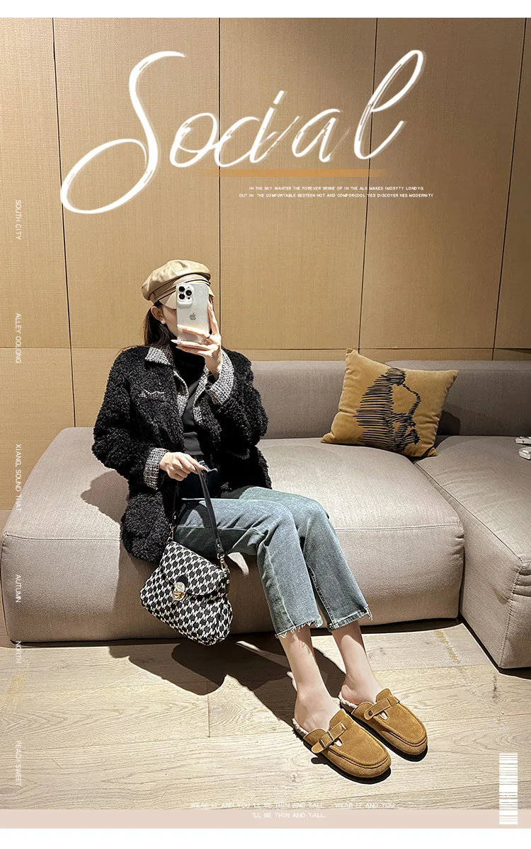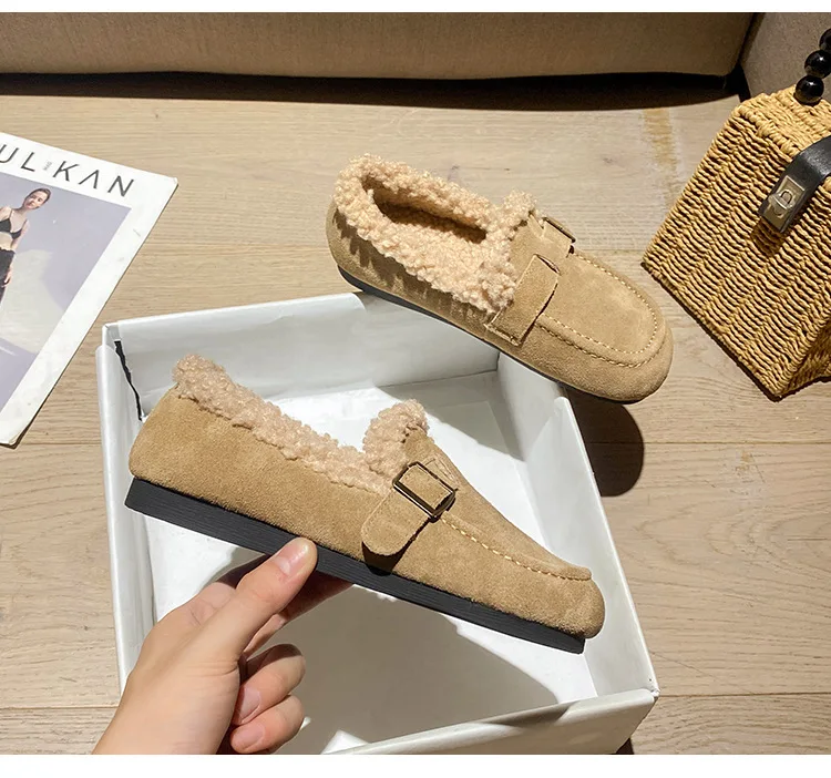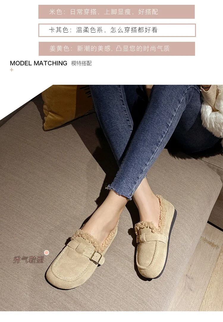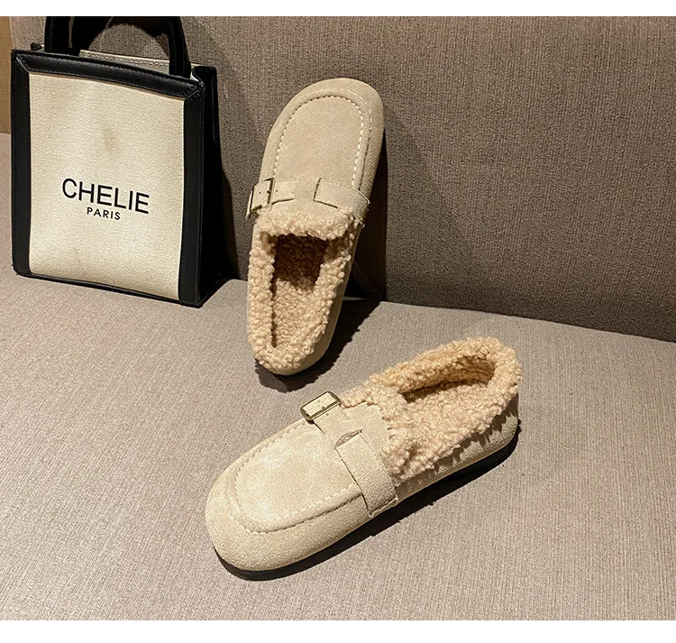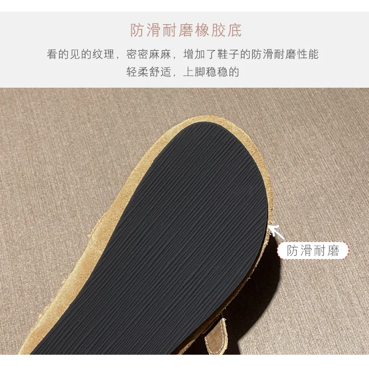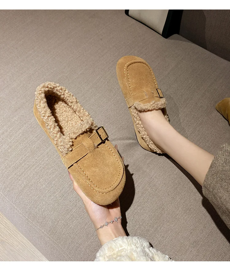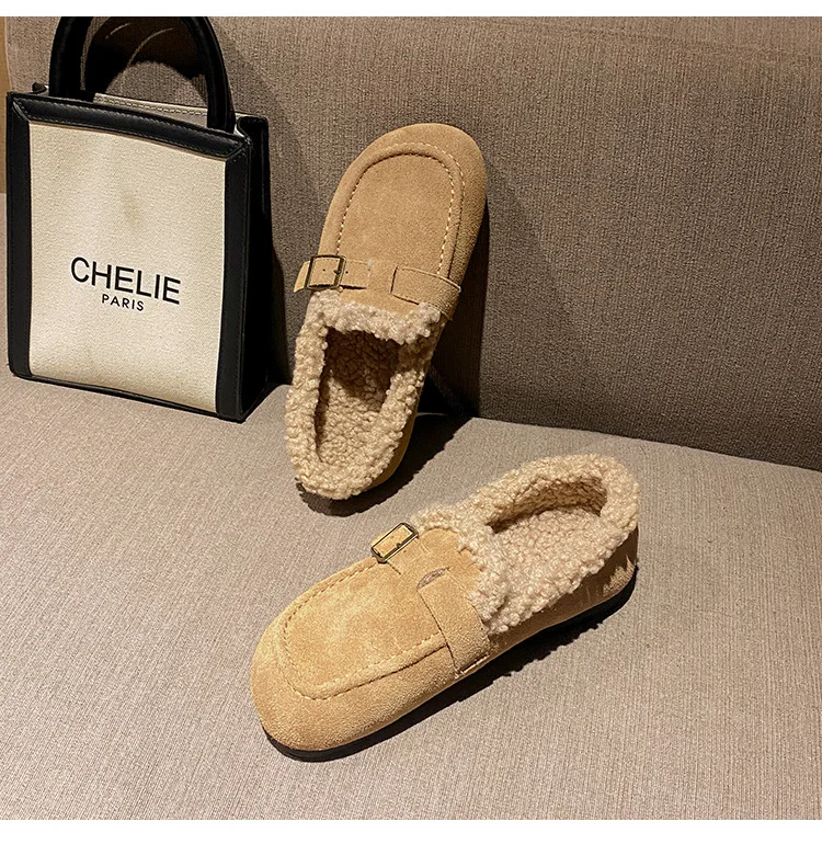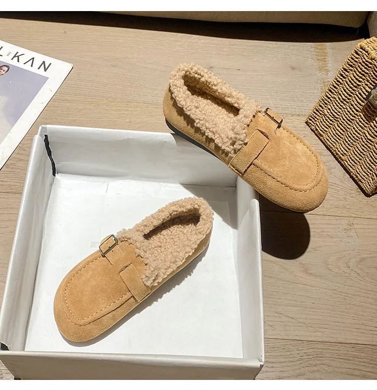 Winter Genuine Leather Pantuflas Shoes Woman Cover Toe Wool Fur Slides Femme Cork Slippers Home Slip On Warm Loafers Furry Mules