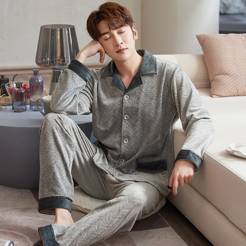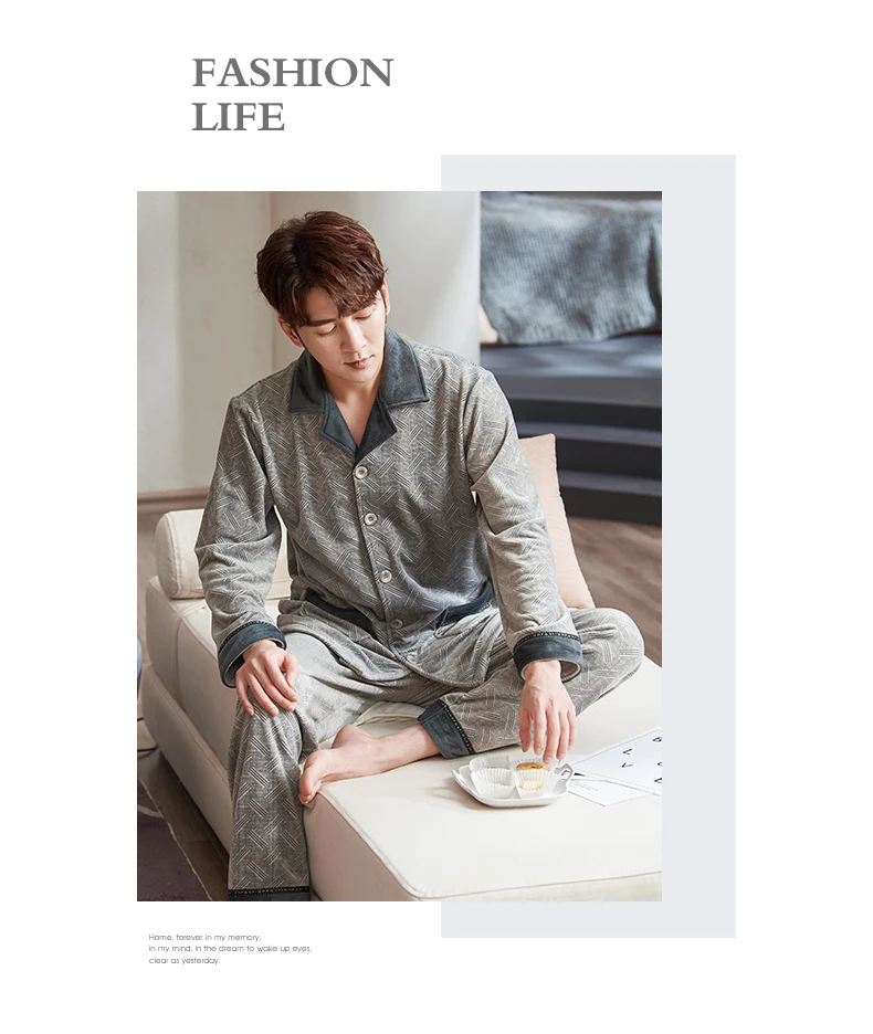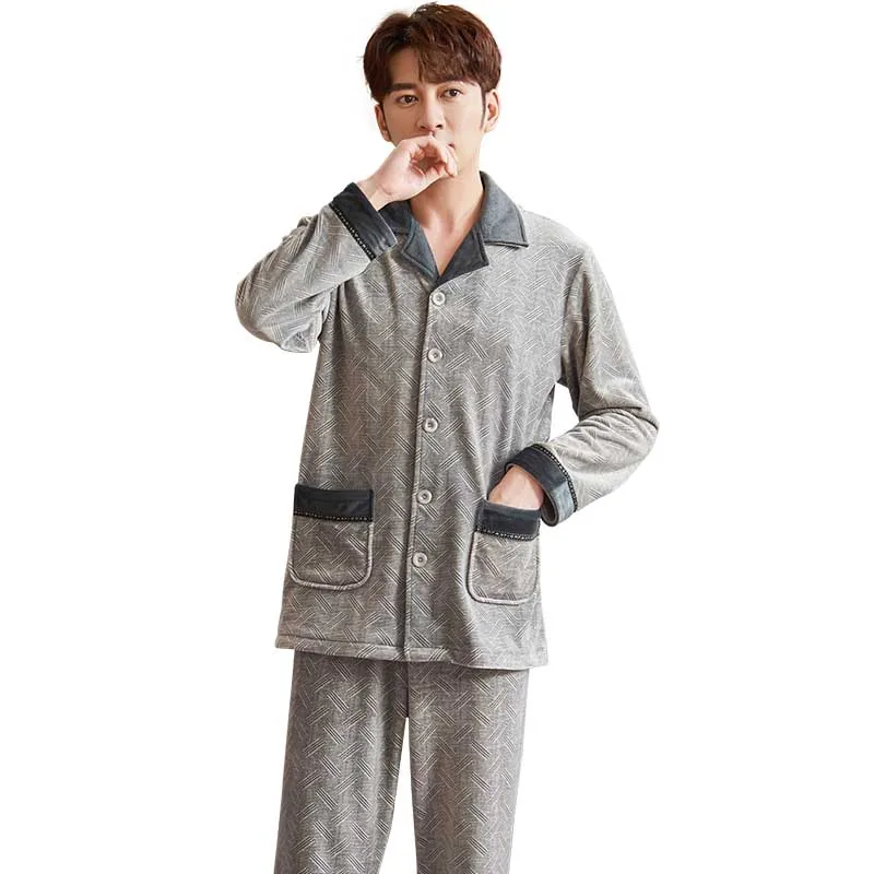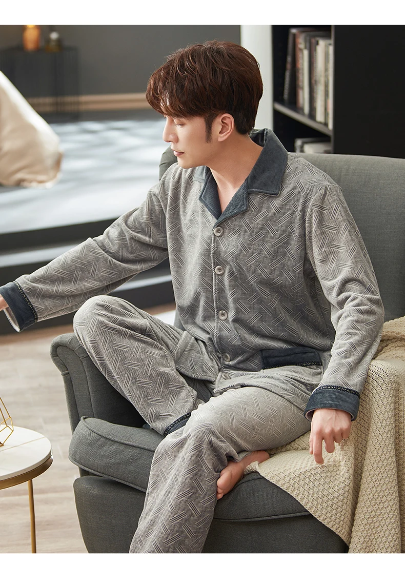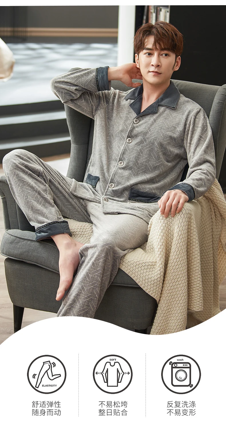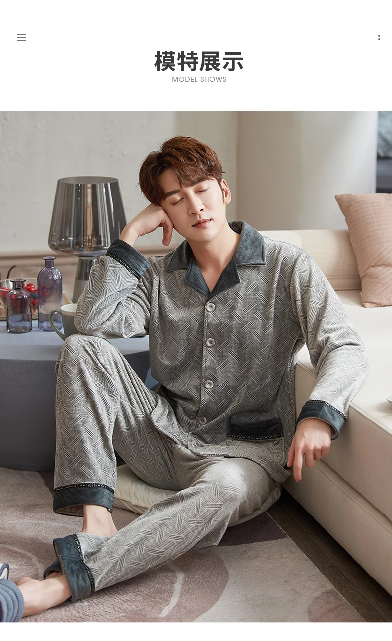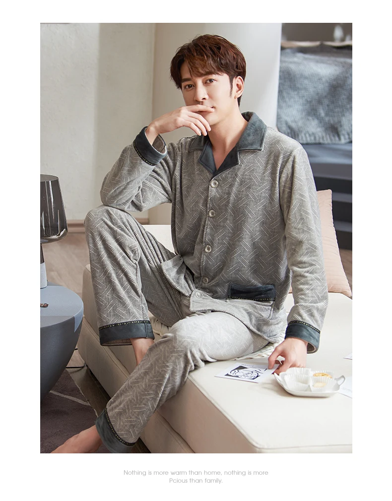 Winter Island Fleece Mens Pajamas Warm Velvet Pyjamas Geometric Patterns Homme Clothes Set Sleepwear Tops + Pants Pijamas Hombre