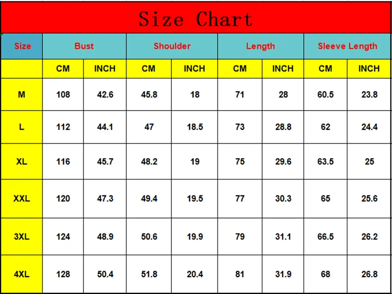 (There are 1-3cm margin of error, If you are not sure the size, Please send the information of your Height, Weight and Chest to me, I will help you choose the correct size. )