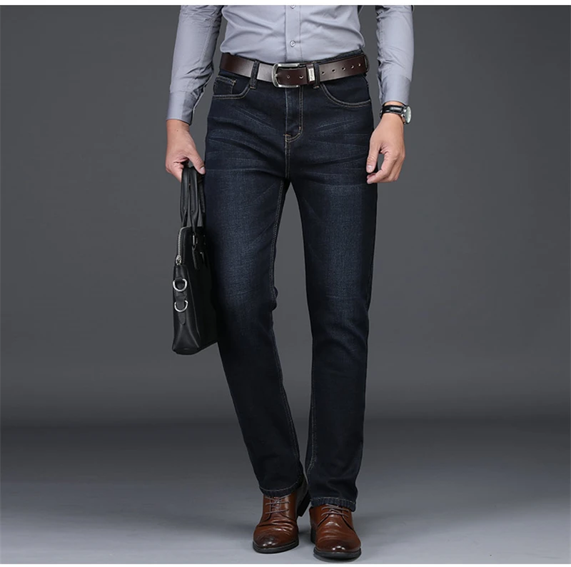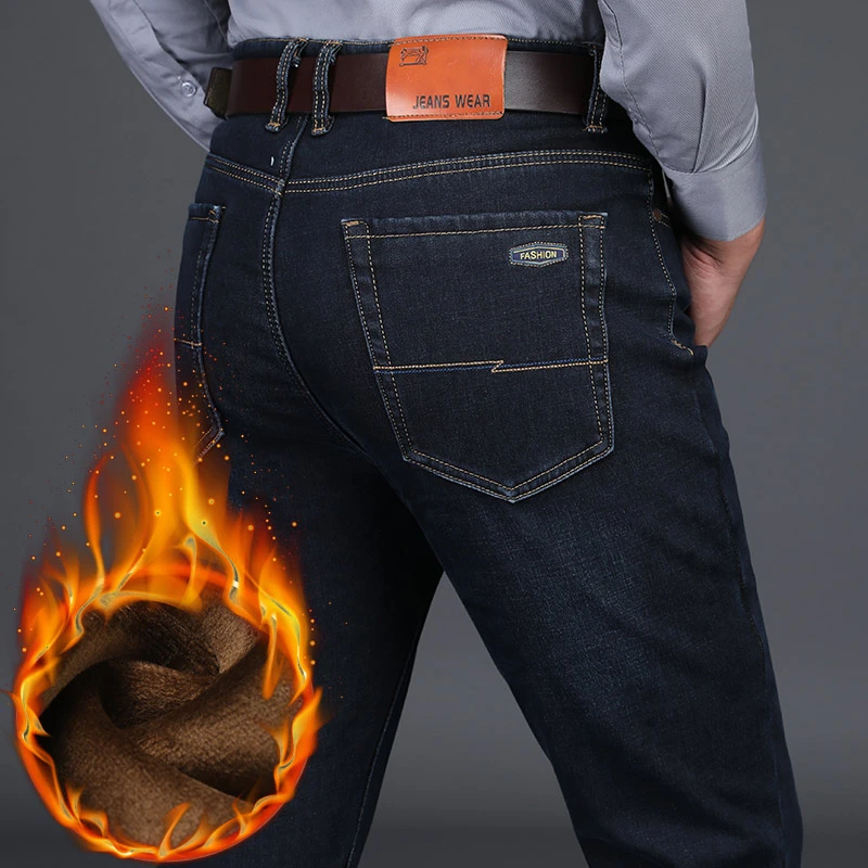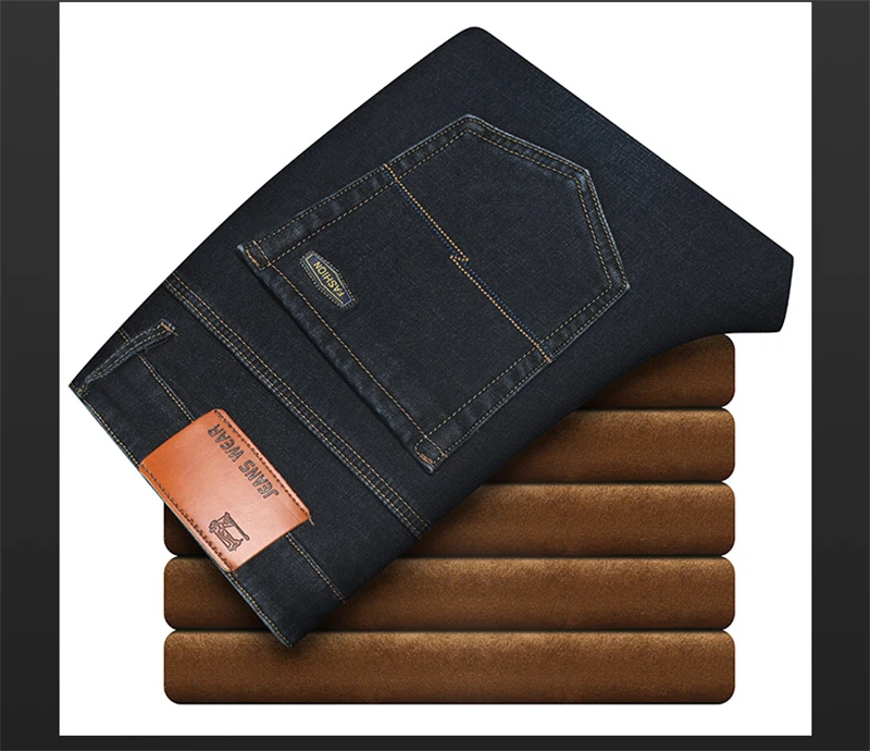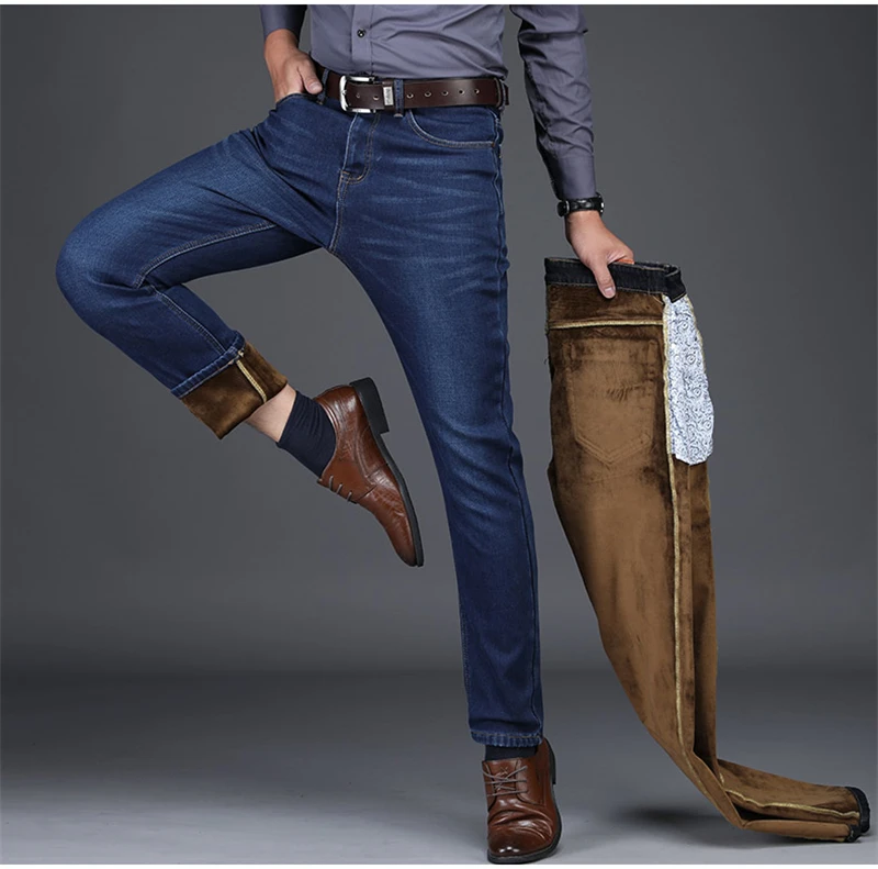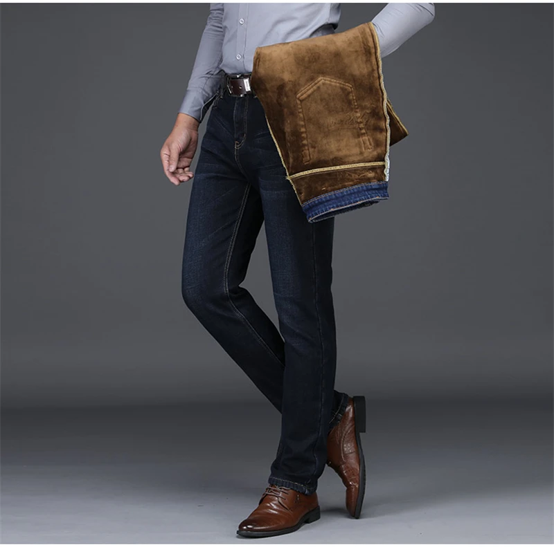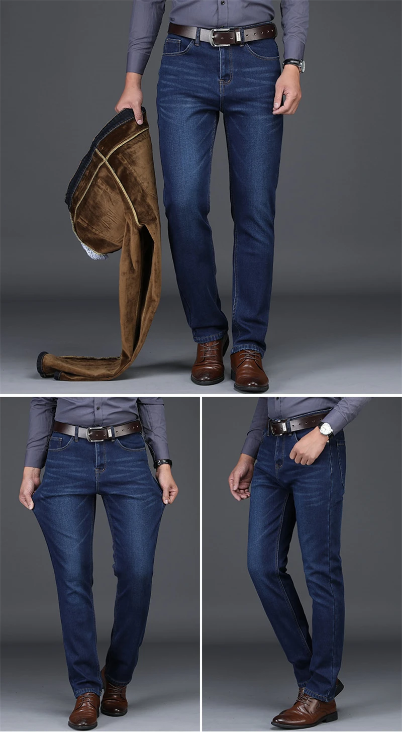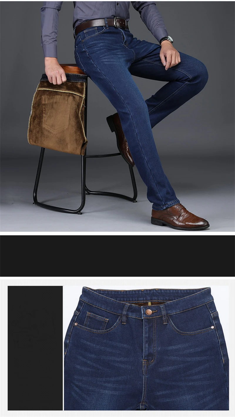 Winter Men’s Fleece Baggy Jeans Business Casual Straight Thick Warm Denim Pants Stretch Black Blue Trousers Male Clothing