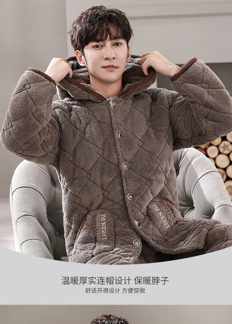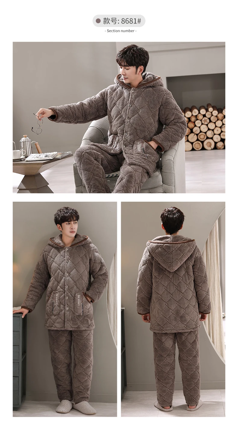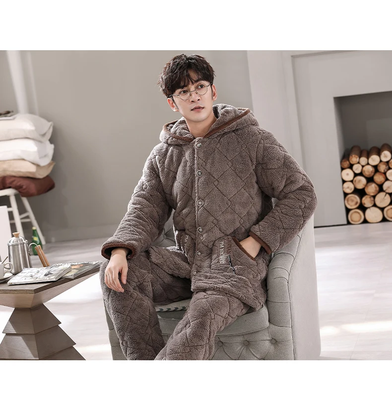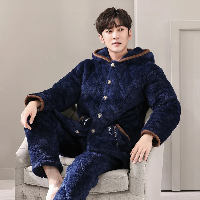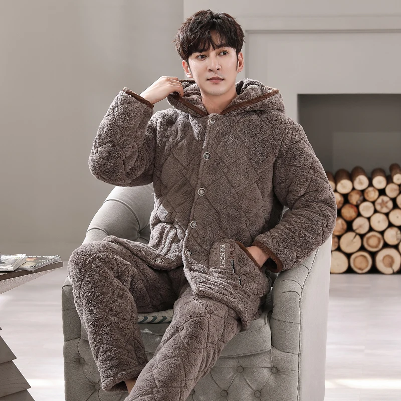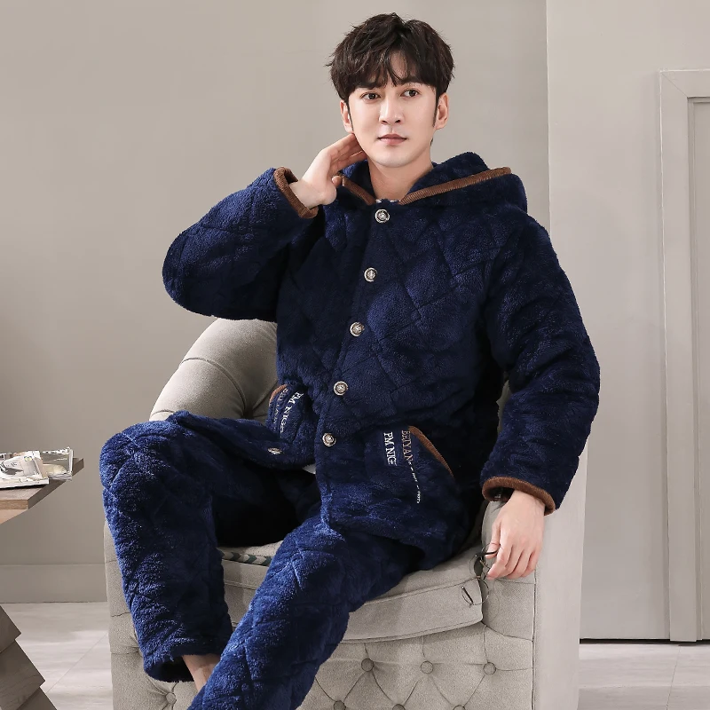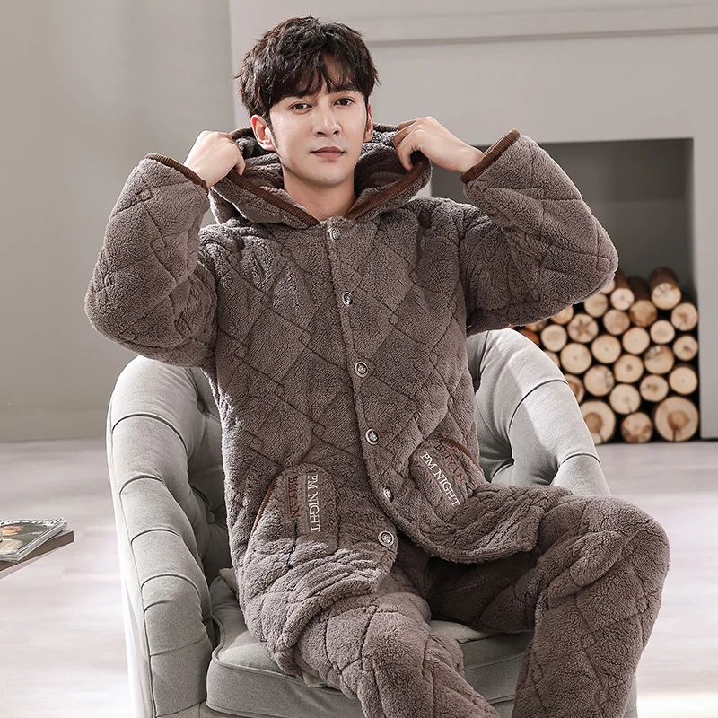 Winter Pajamas With Hooded For Men Thick Three-layer Quilted Sleepwear Suit Pyjama Homme Warm Casual Home Clothing Pijama Hombre