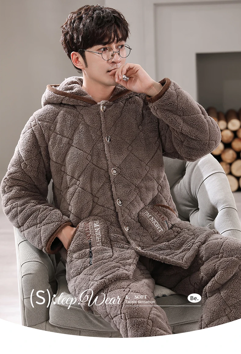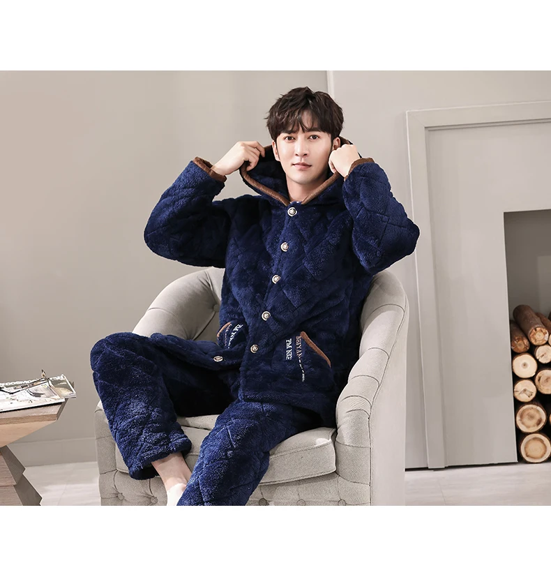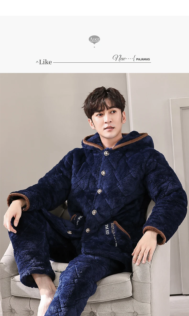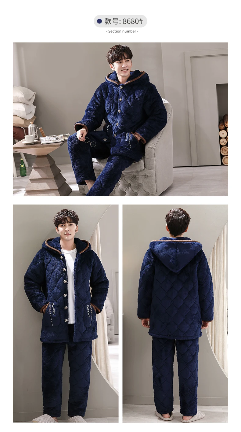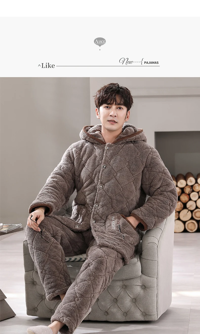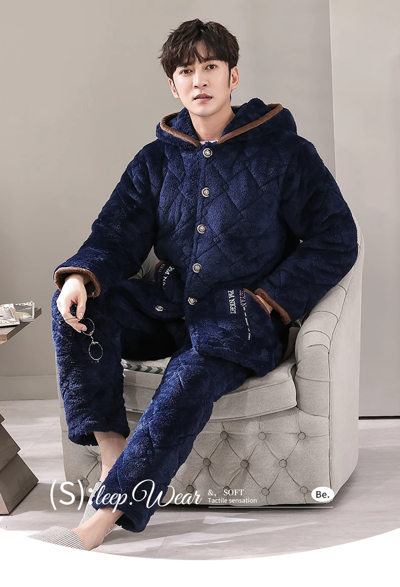 Winter Pajamas With Hooded For Men Thick Three-layer Quilted Sleepwear Suit Pyjama Homme Warm Casual Home Clothing Pijama Hombre