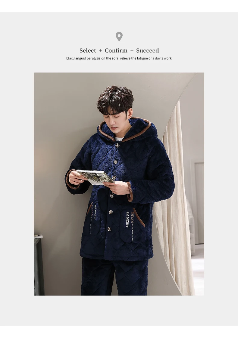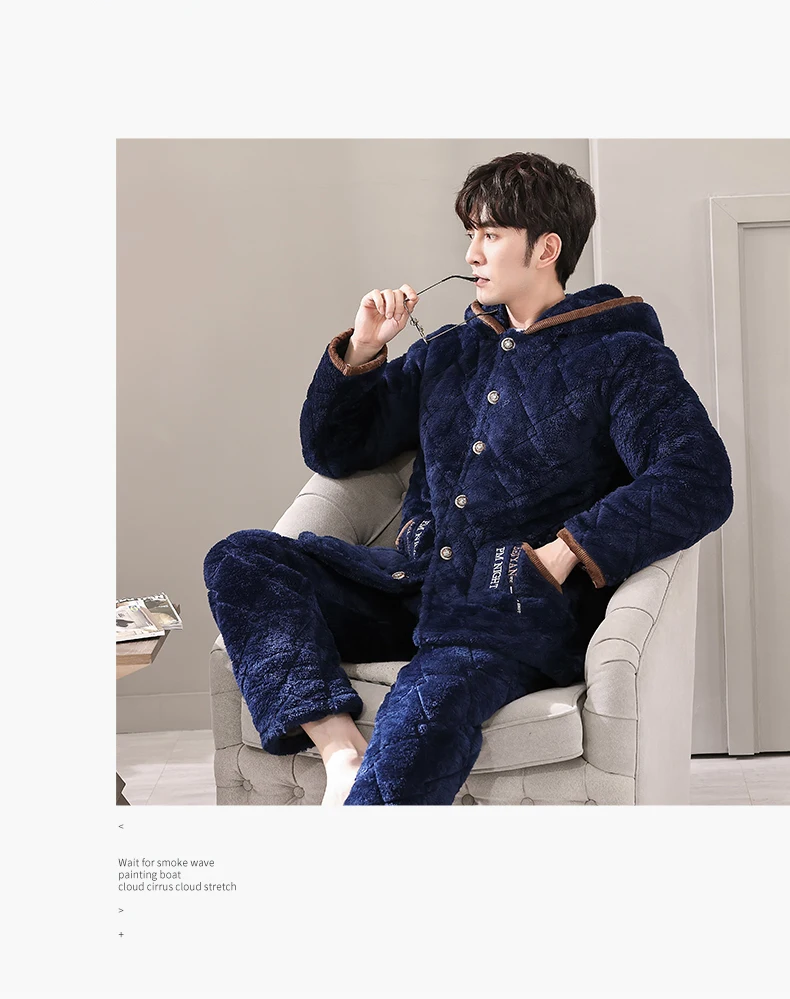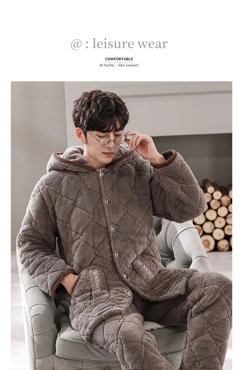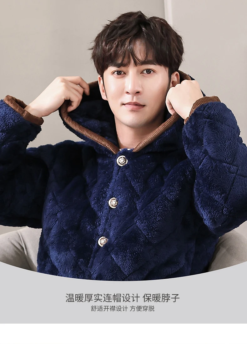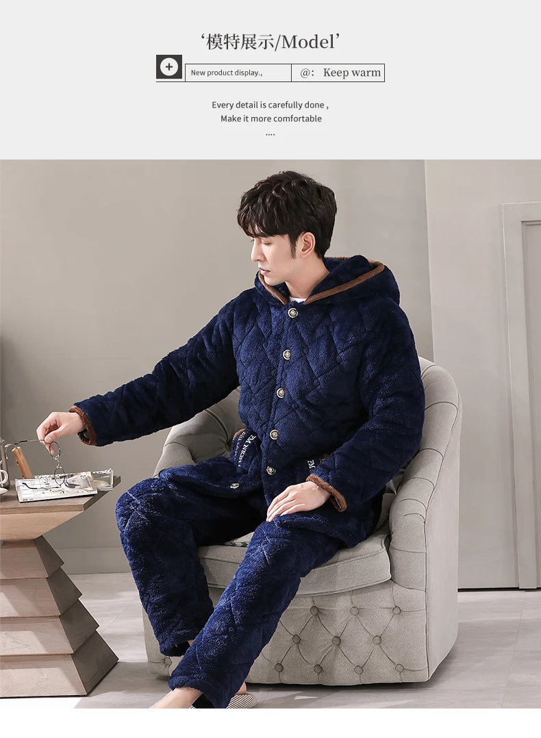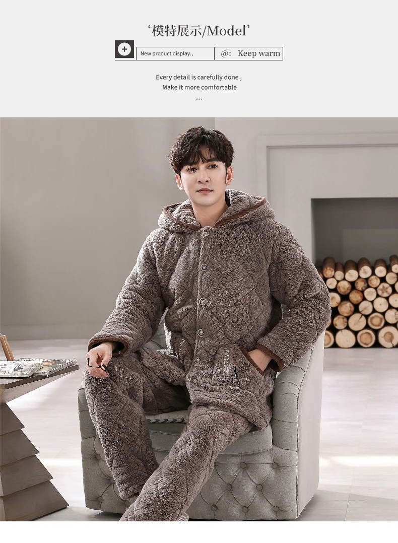 Winter Pajamas With Hooded For Men Thick Three-layer Quilted Sleepwear Suit Pyjama Homme Warm Casual Home Clothing Pijama Hombre