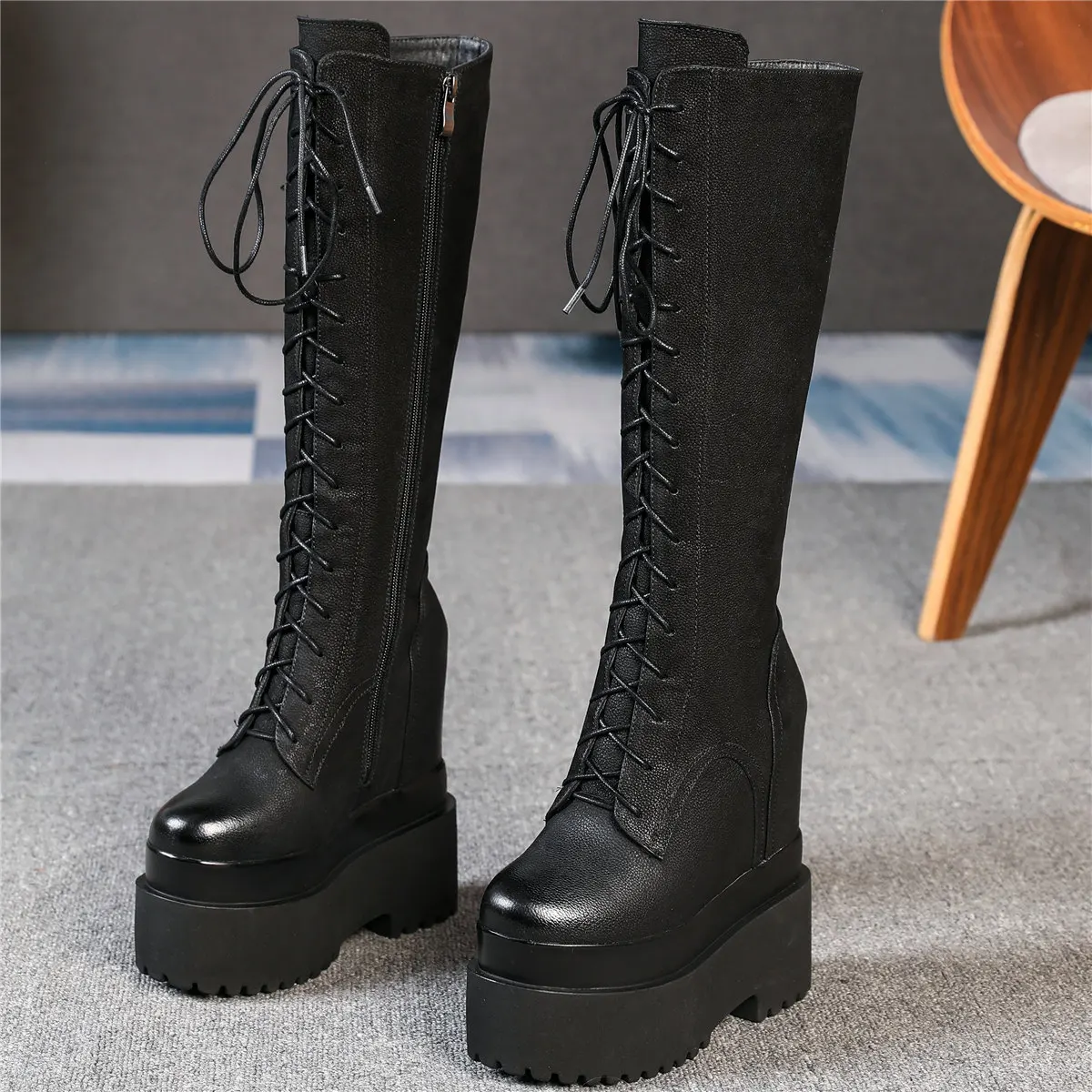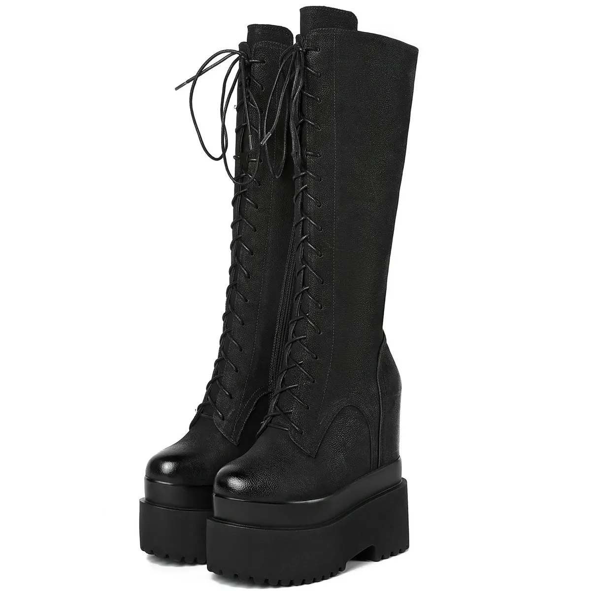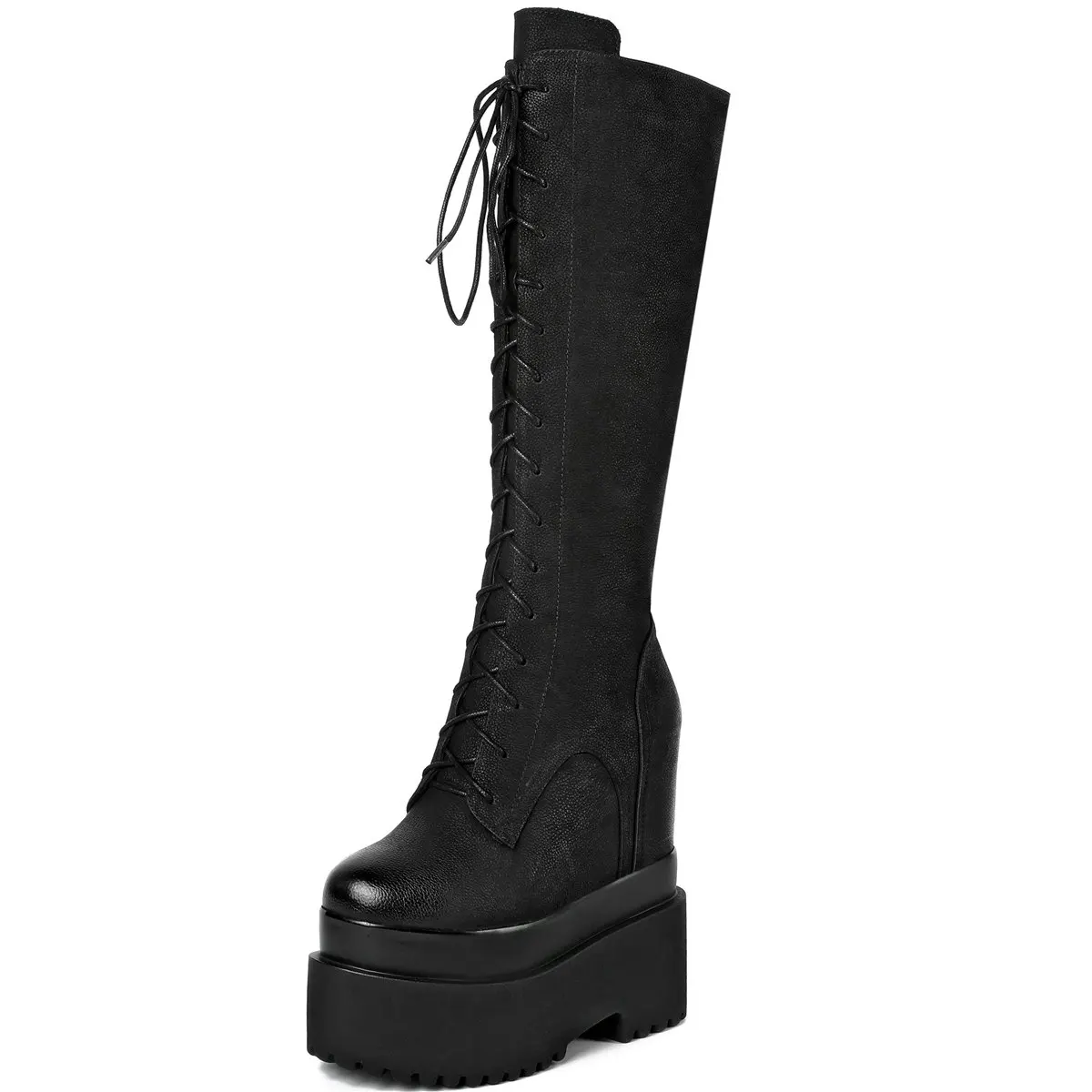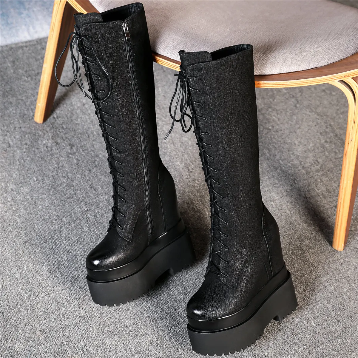 Winter Platform Pumps Shoes Women Lace Up Genuine Leather High Heel Snow Boots Female Round Toe Fashion Sneakers Casual Shoes