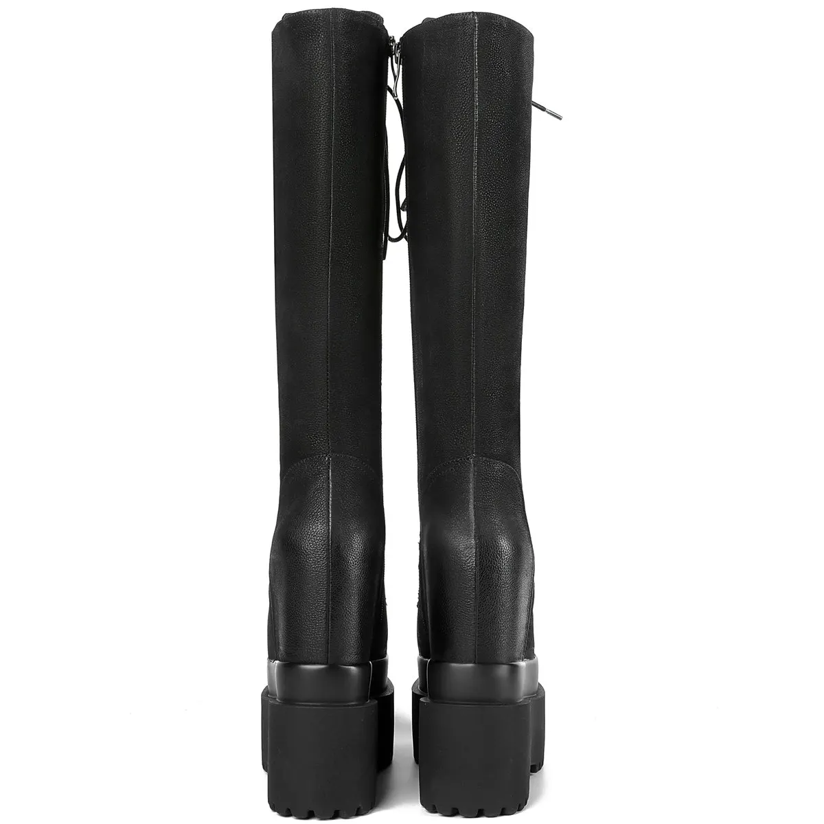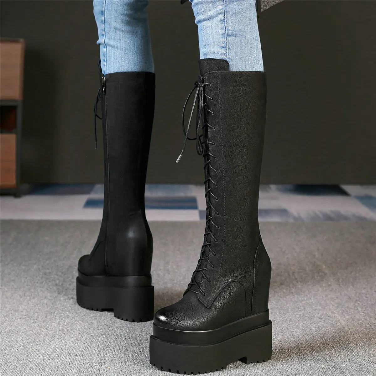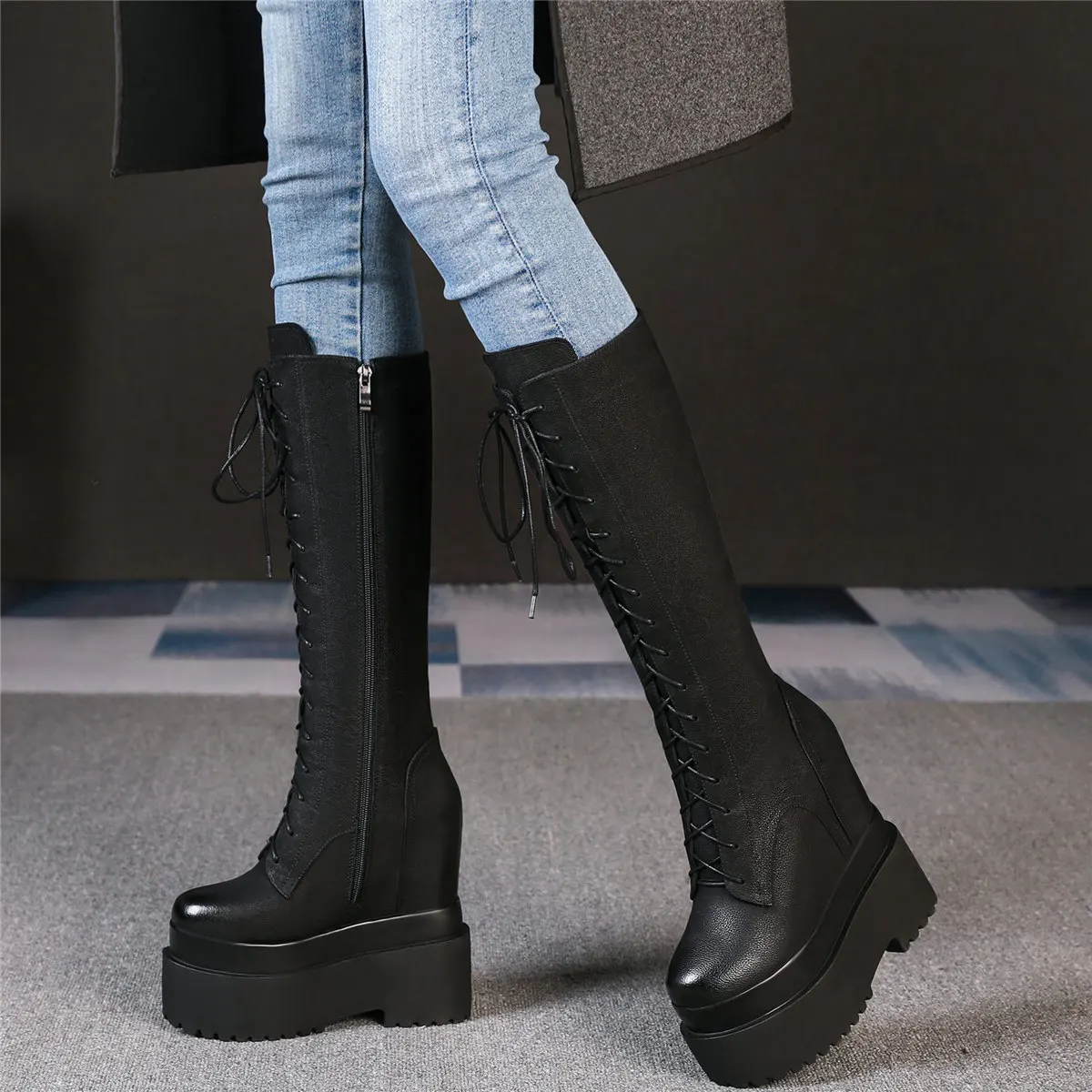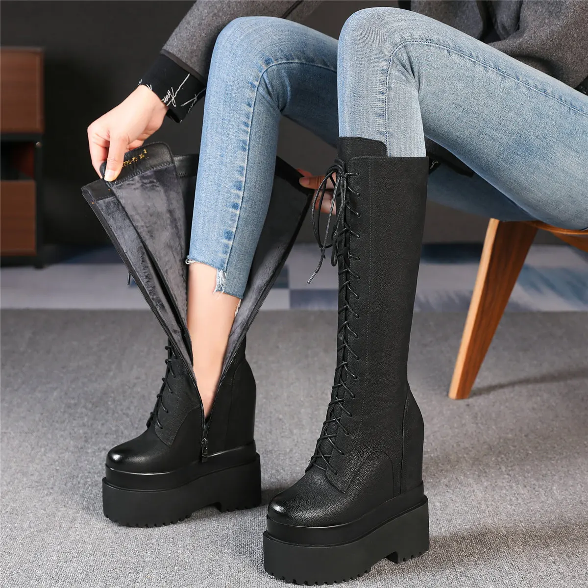 Winter Platform Pumps Shoes Women Lace Up Genuine Leather High Heel Snow Boots Female Round Toe Fashion Sneakers Casual Shoes