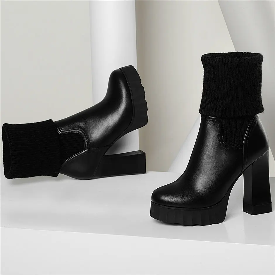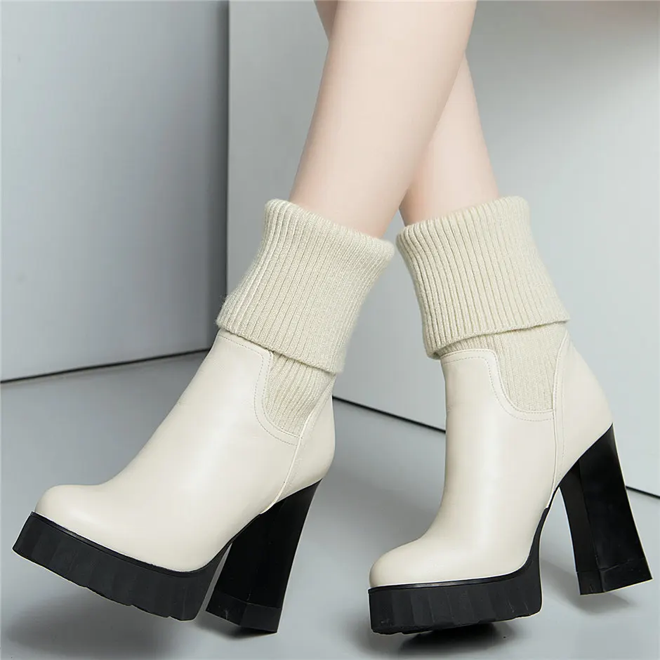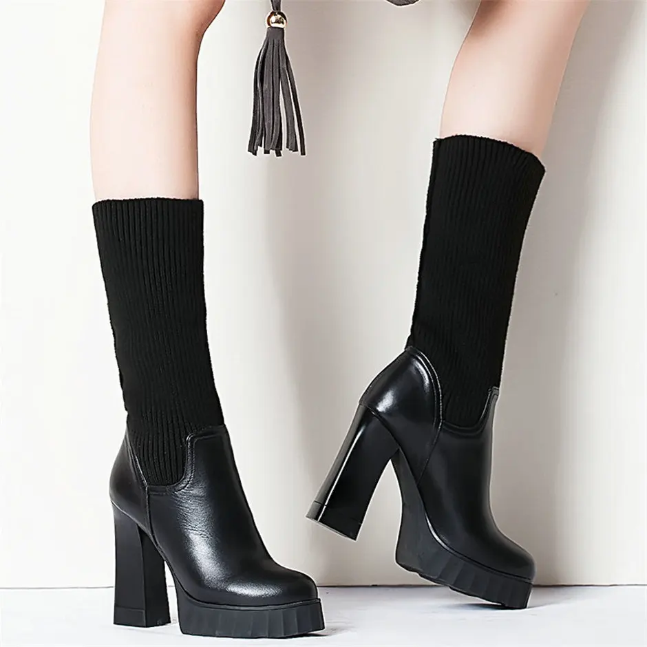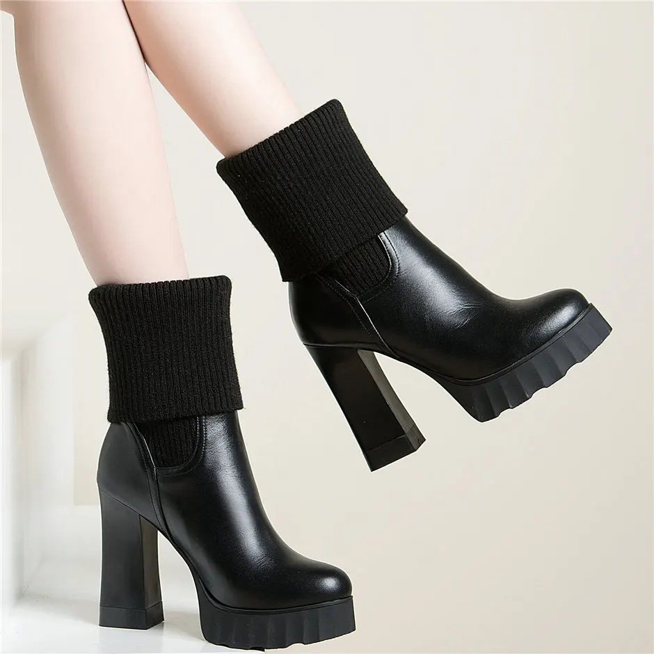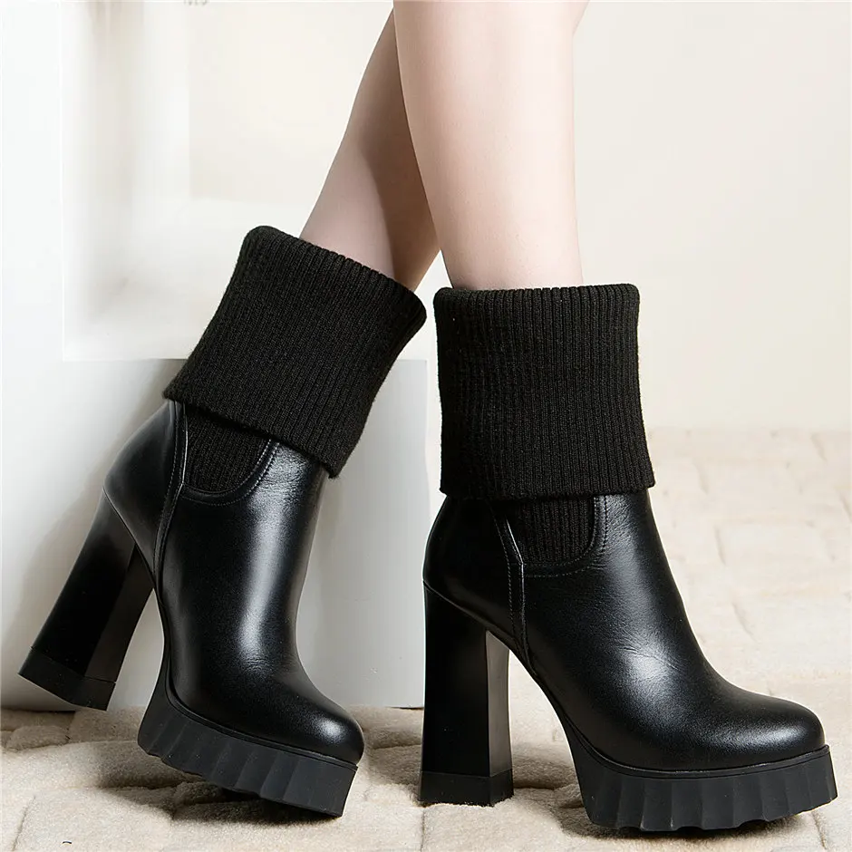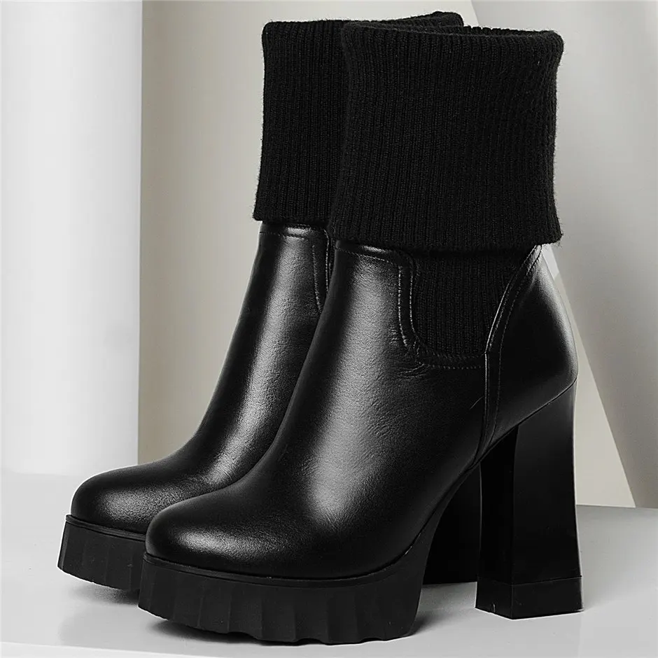 Winter Pumps Shoe Women Genuine Leather High Heel Motorcycle Boots Female Knitting High Top Round Toe Chunky Platform Snow Boots