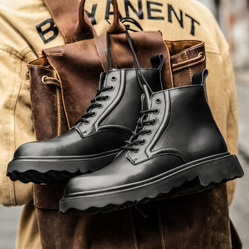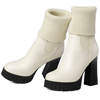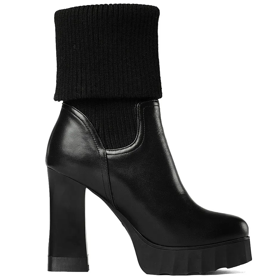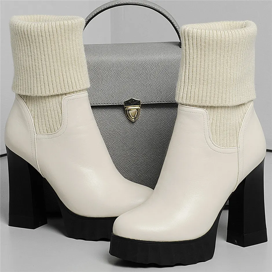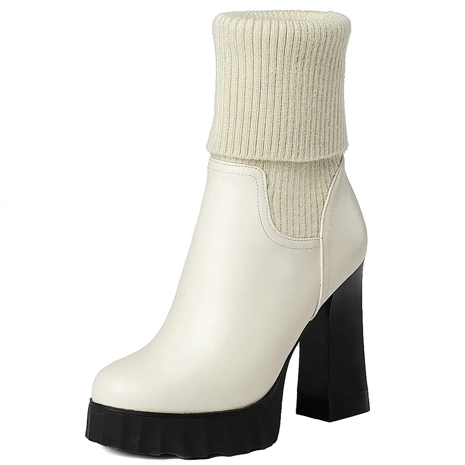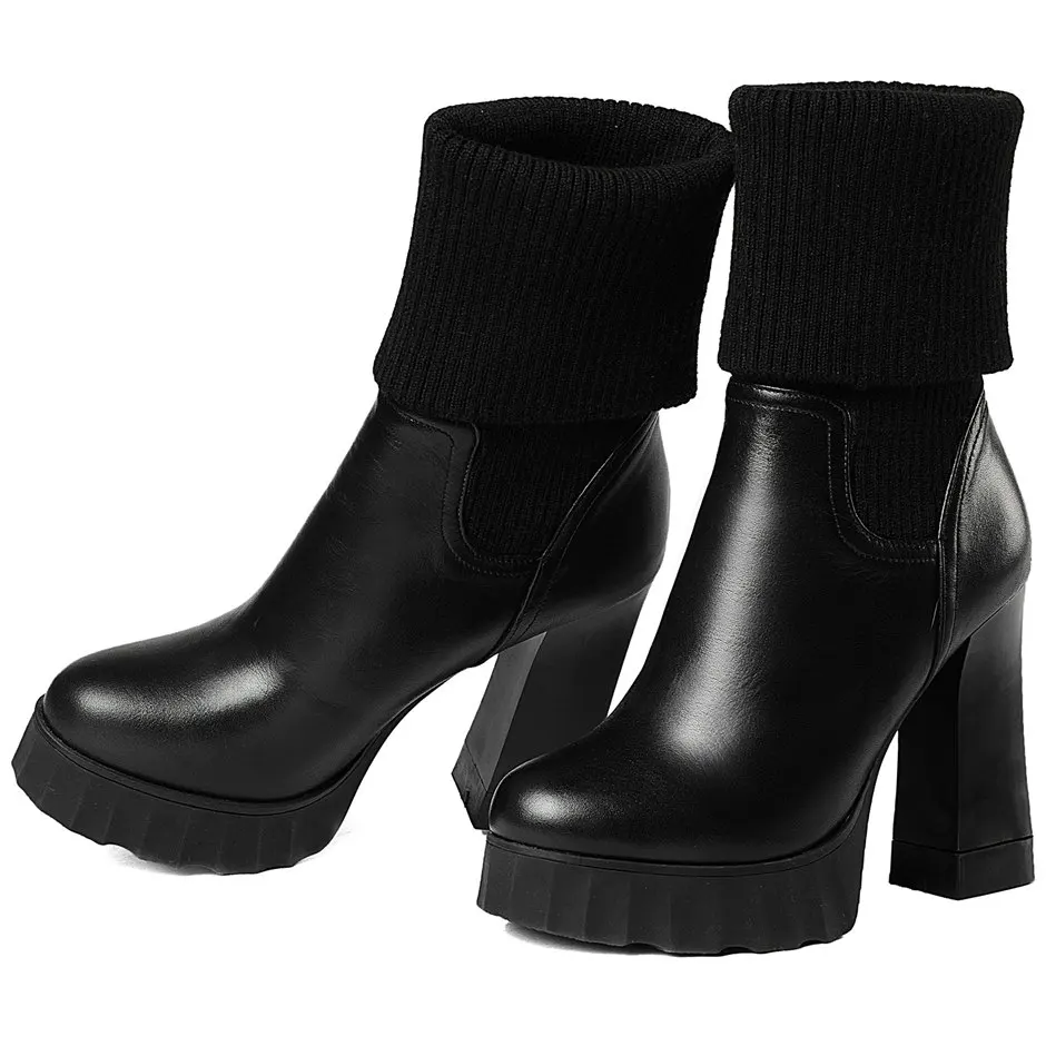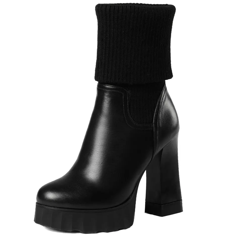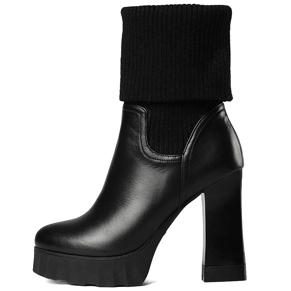 Winter Pumps Shoe Women Genuine Leather High Heel Motorcycle Boots Female Knitting High Top Round Toe Chunky Platform Snow Boots