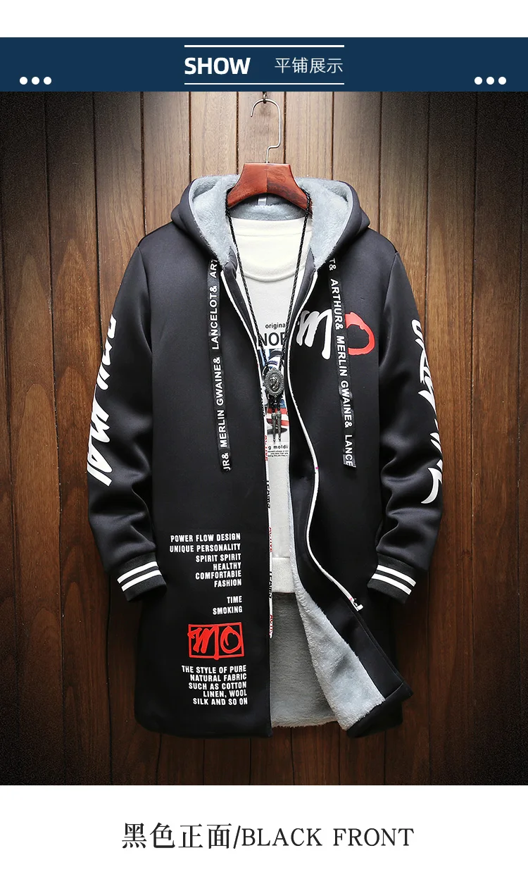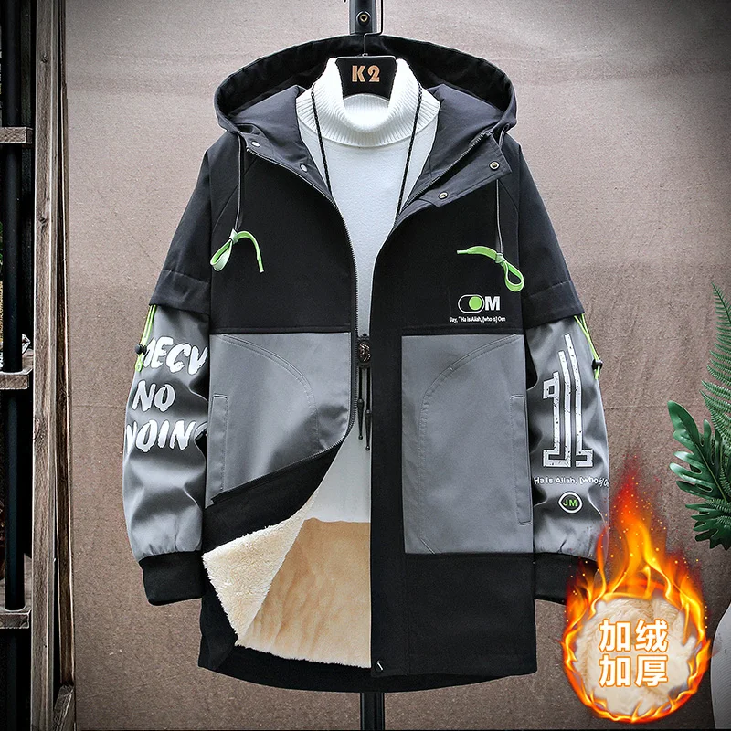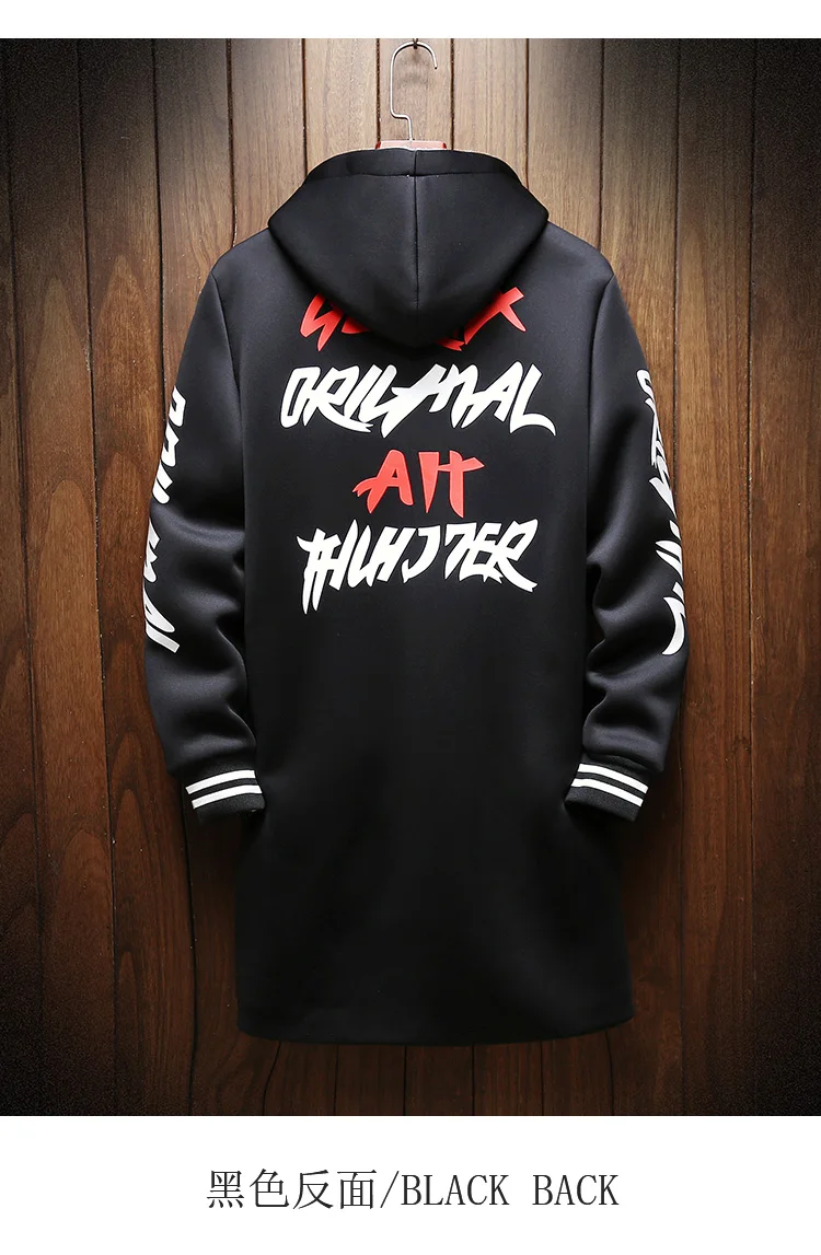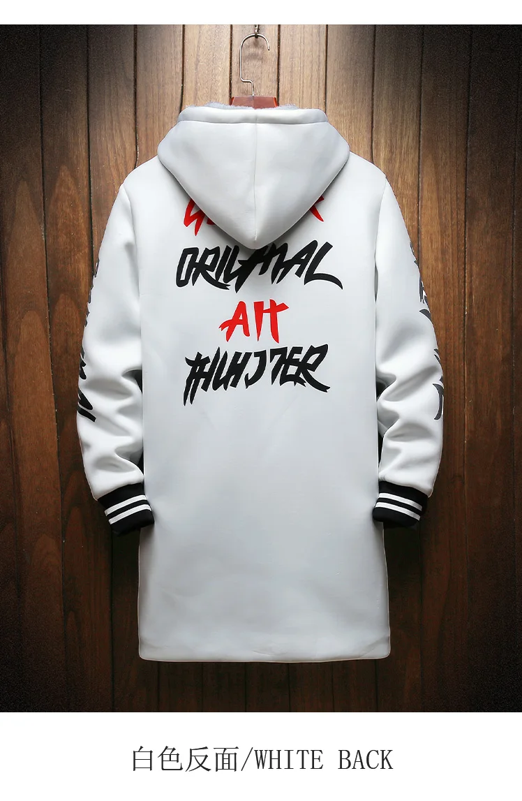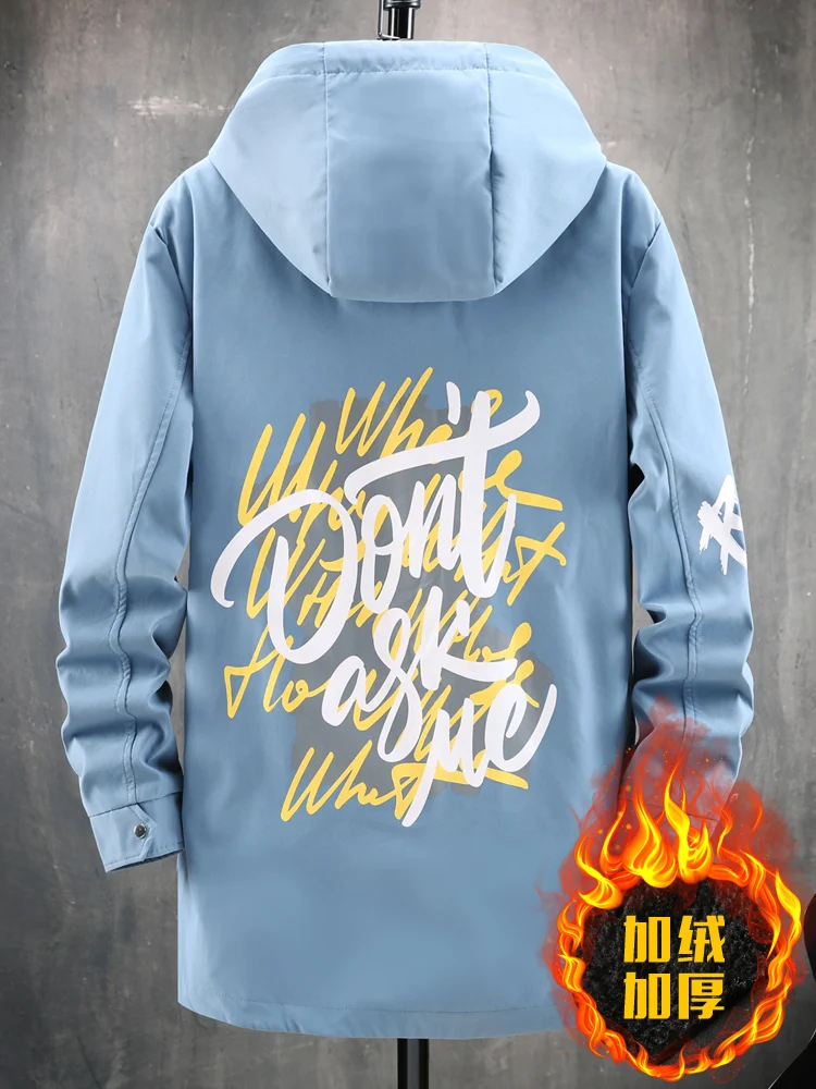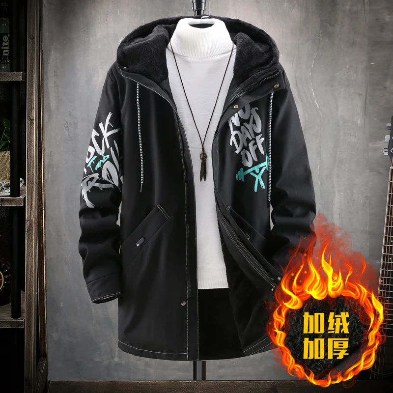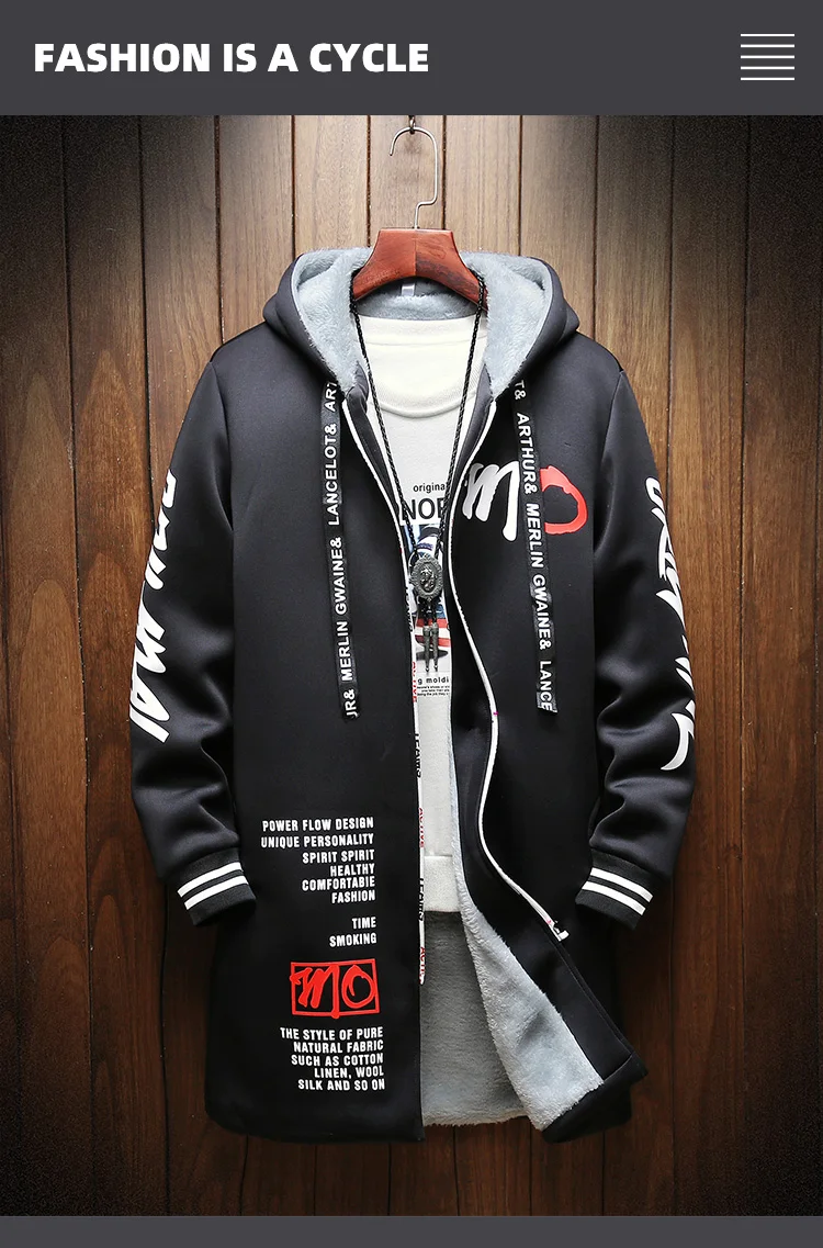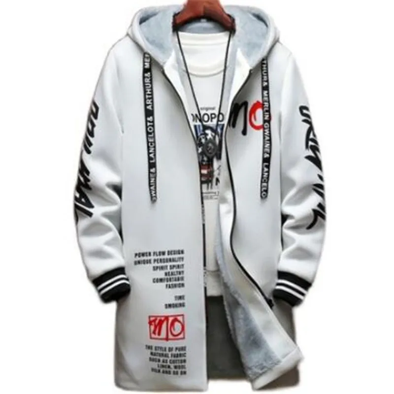Winter Slim Long Trench Coat Men Letter Print Style Hooded Overcoat Black Hip Hop Streetwear Autumn Korean Mens Jacket