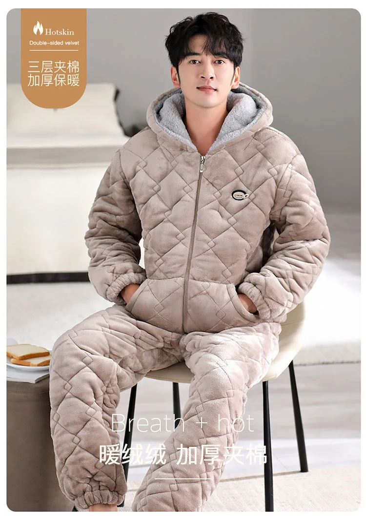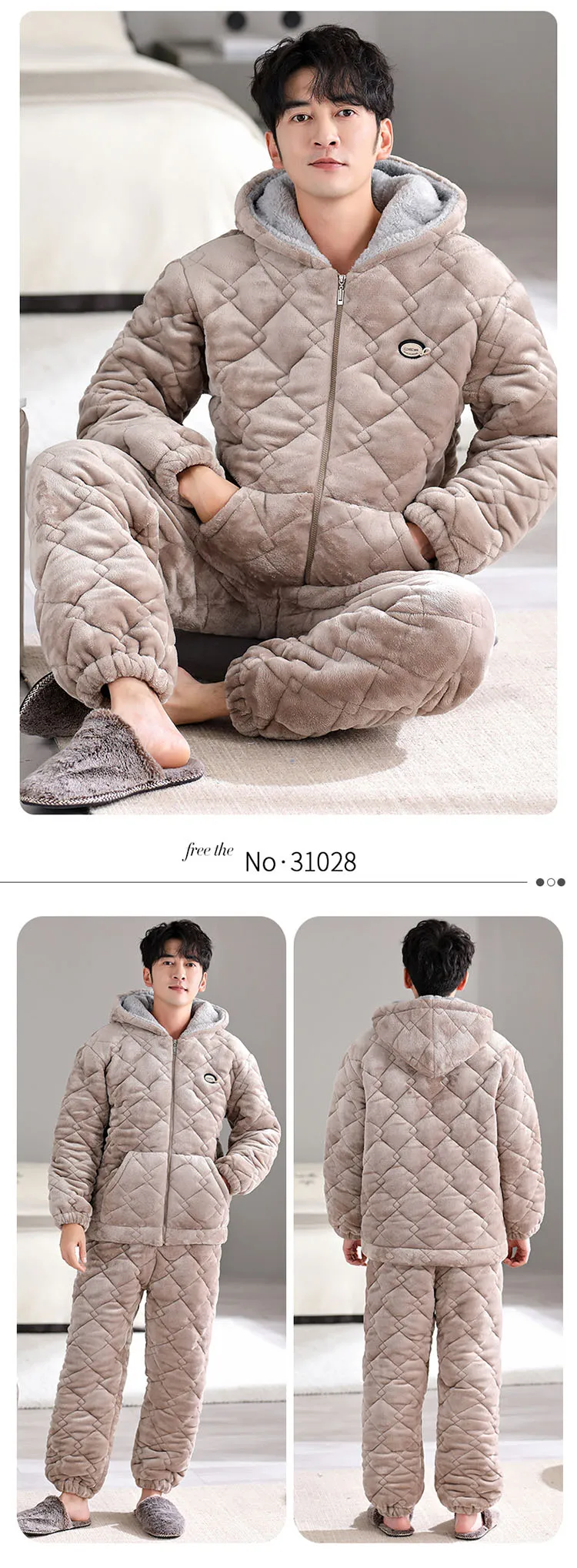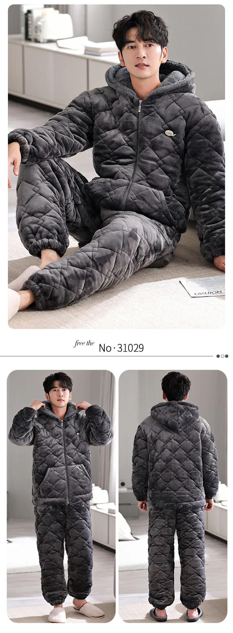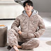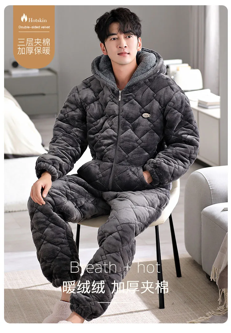 Winter Thick Warm Pajamas Set Men Three Layer Clip Cotton Pyjamas Casual Comfortable Men Hooded Sleepwear
