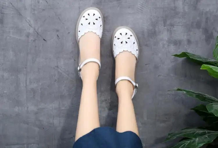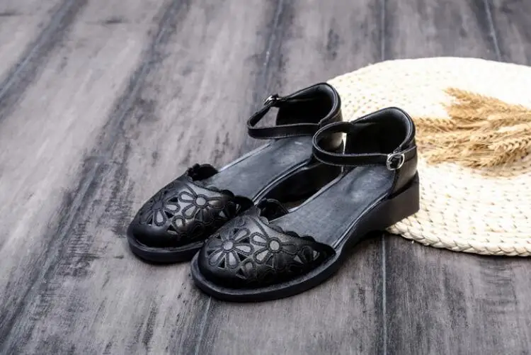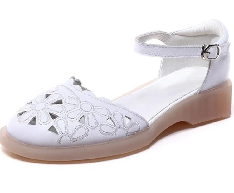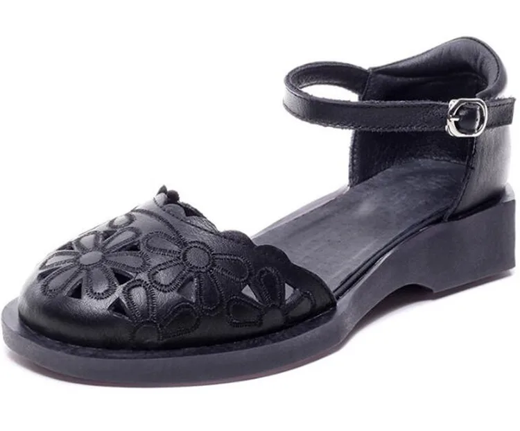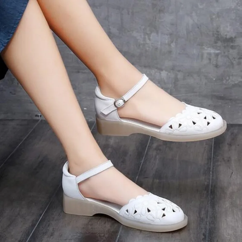 Women Genuine Leather Closed Toe Sandal Hollow Out Flat Heeled Ladies Sandals Ankle Strap Cover Heel Woman Summer Casual Flats