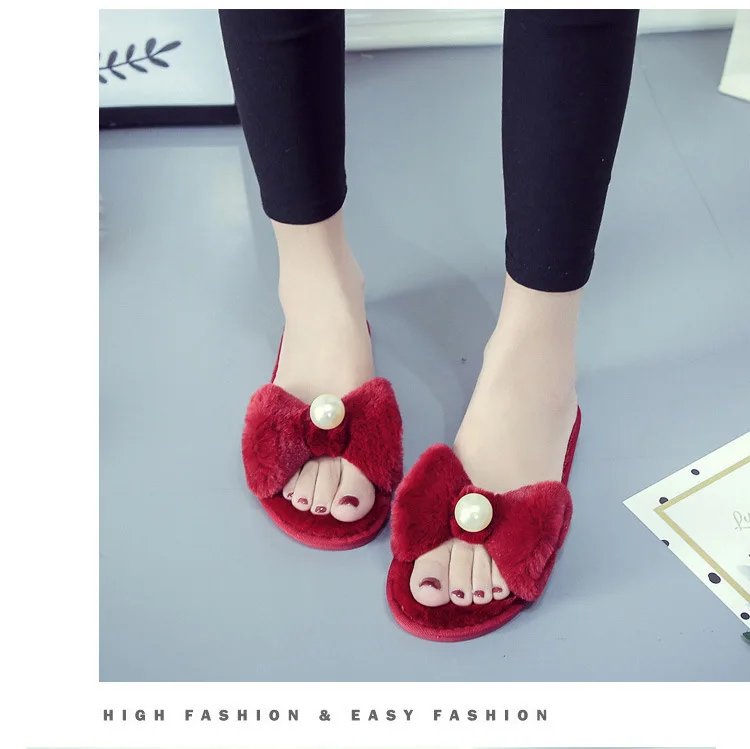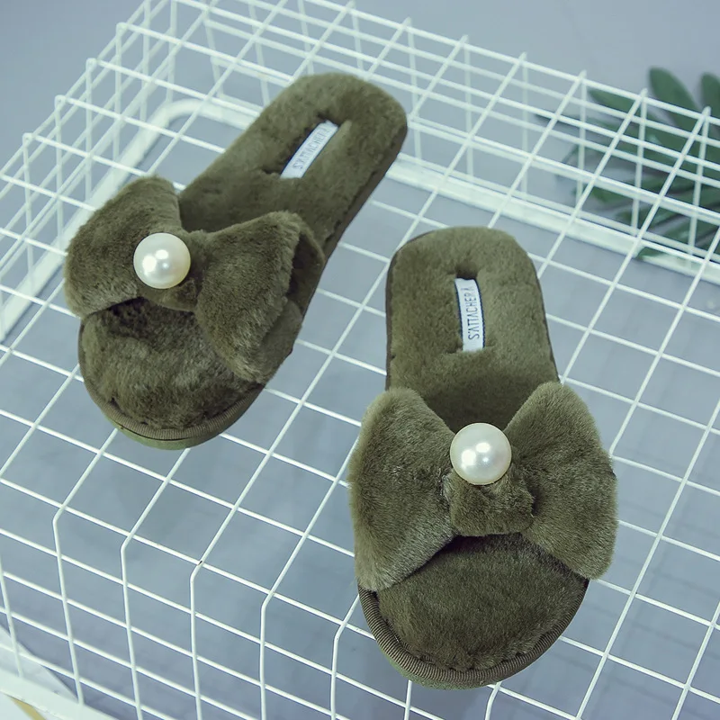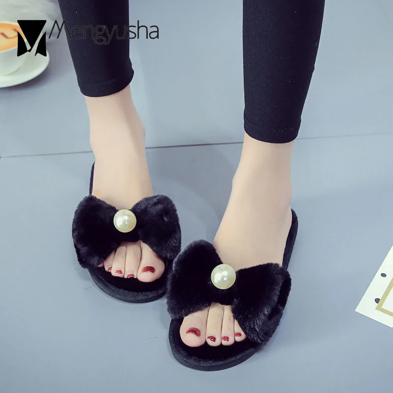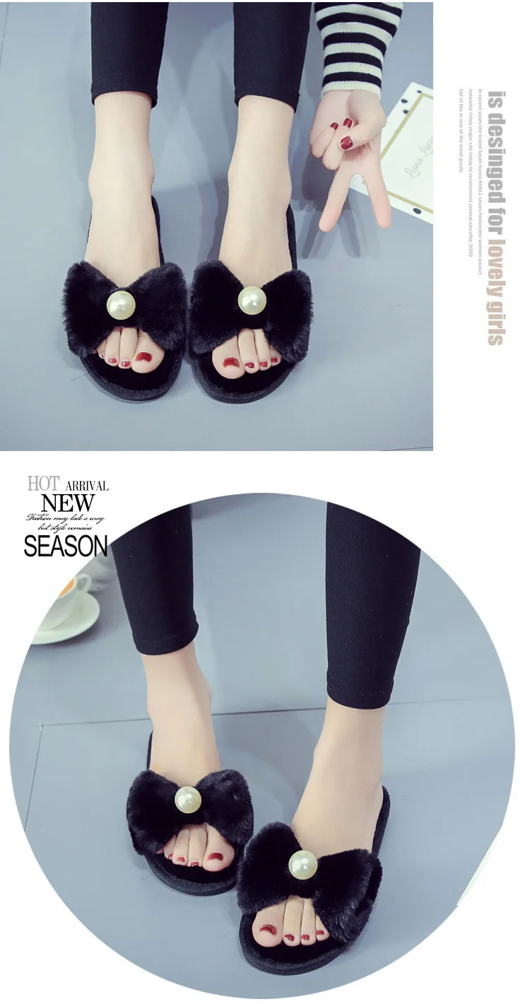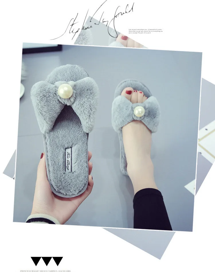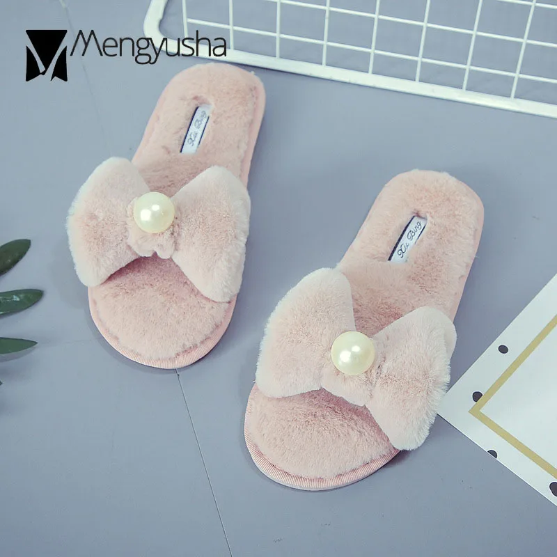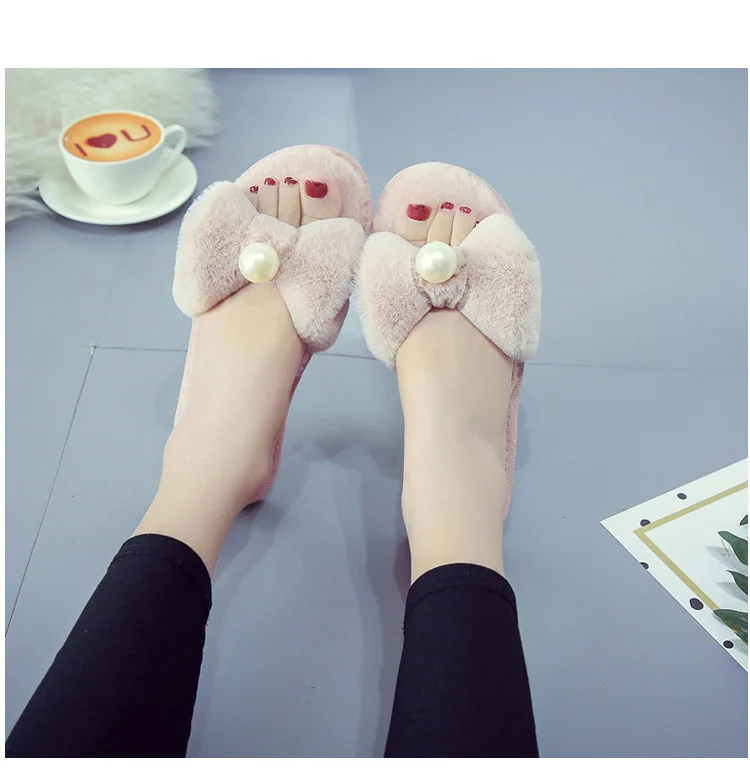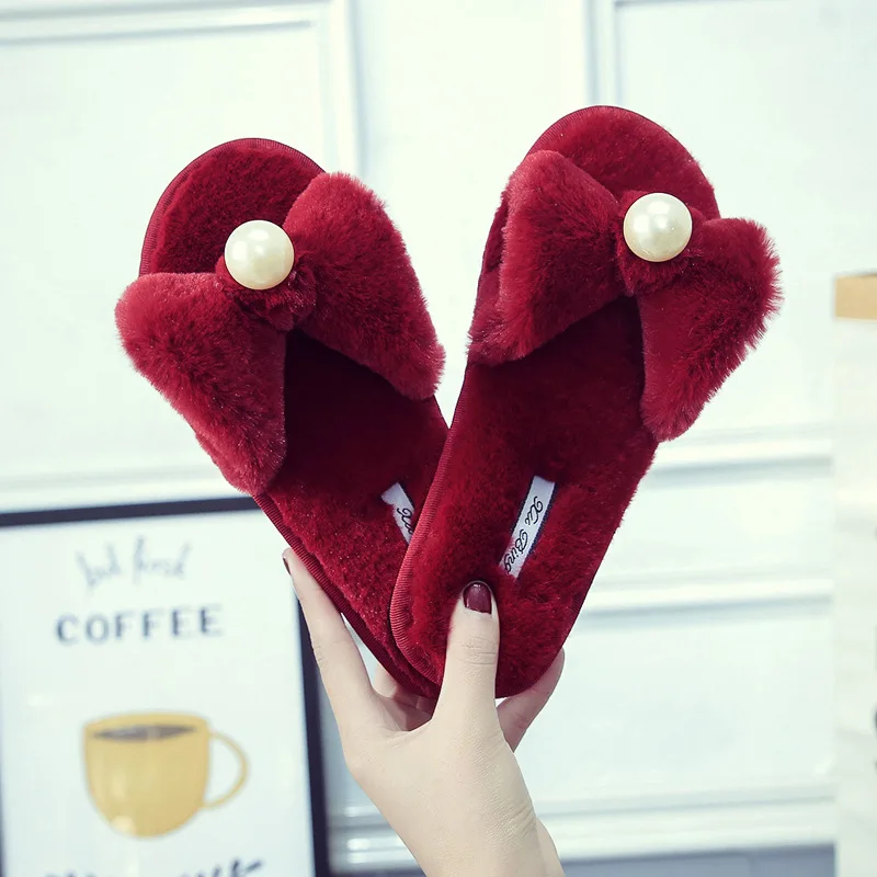 Fairy Girls Pearl Bow-Knot Fur Slippers Winter Fleeces Shoes Women