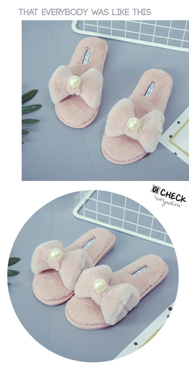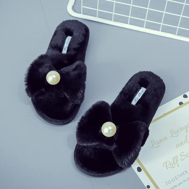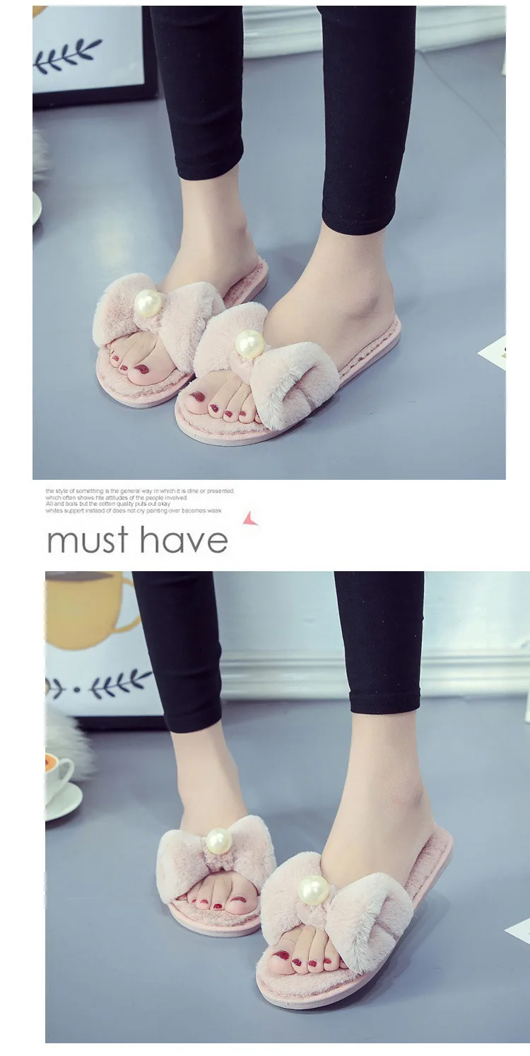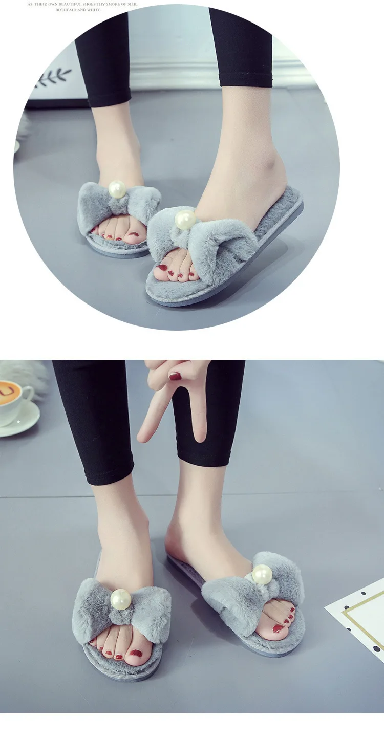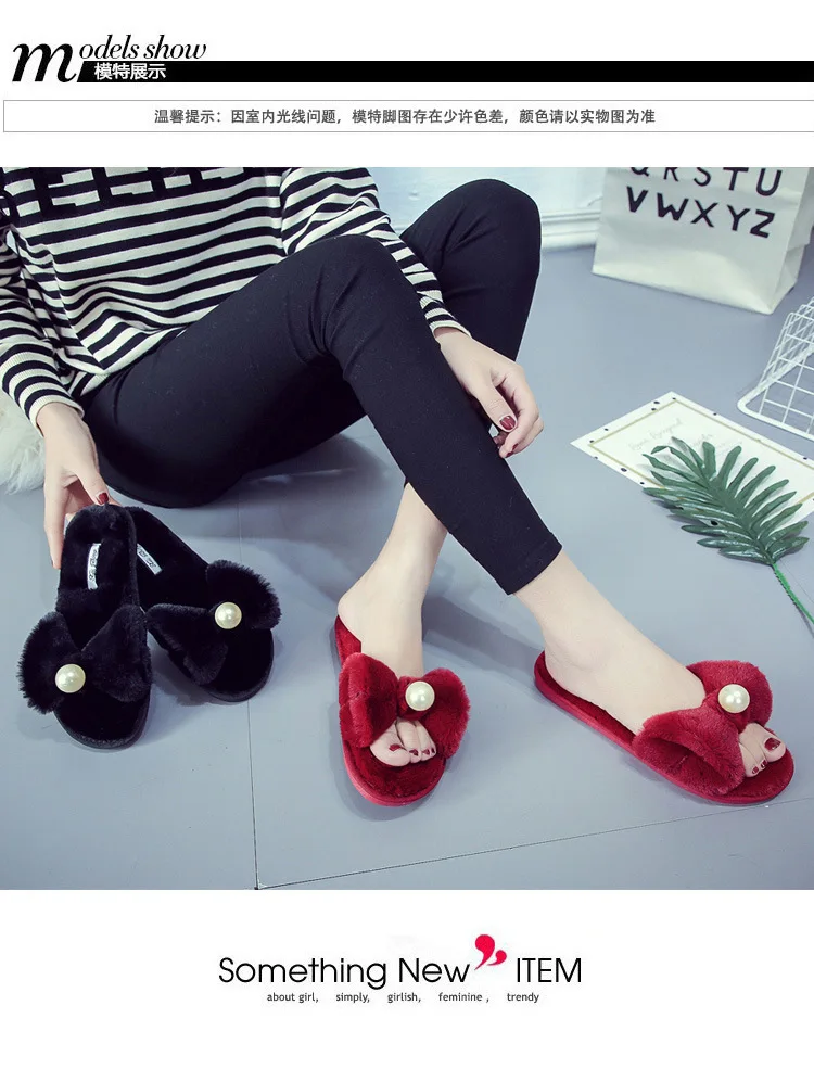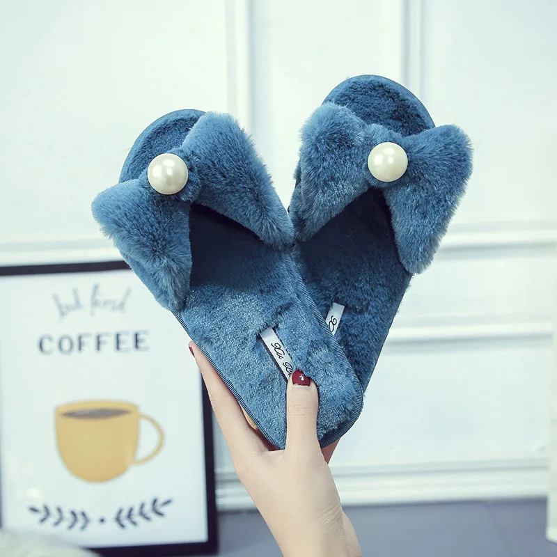 Fairy Girls Pearl Bow-Knot Fur Slippers Winter Fleeces Shoes Women