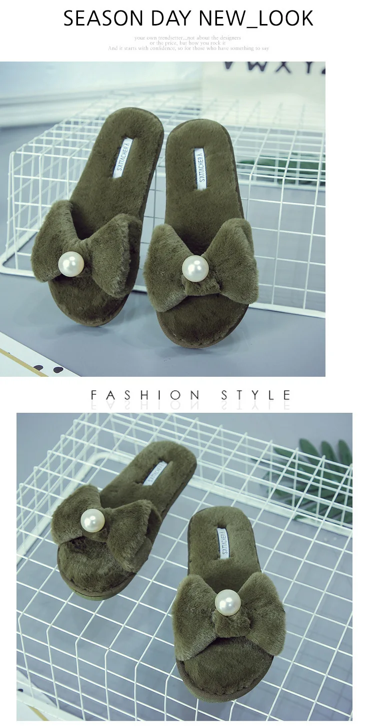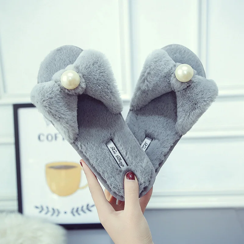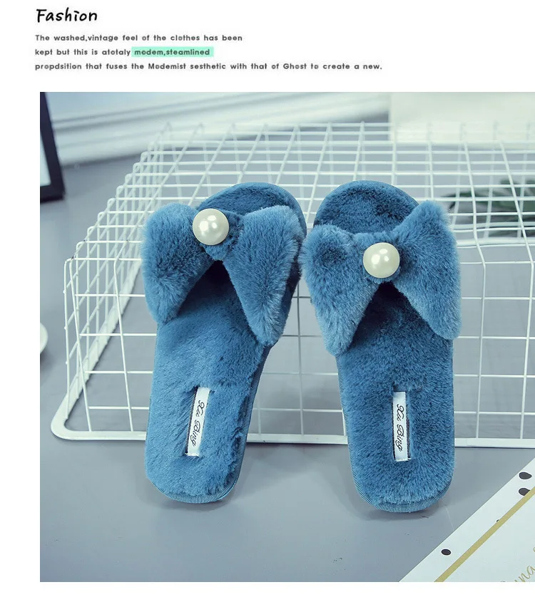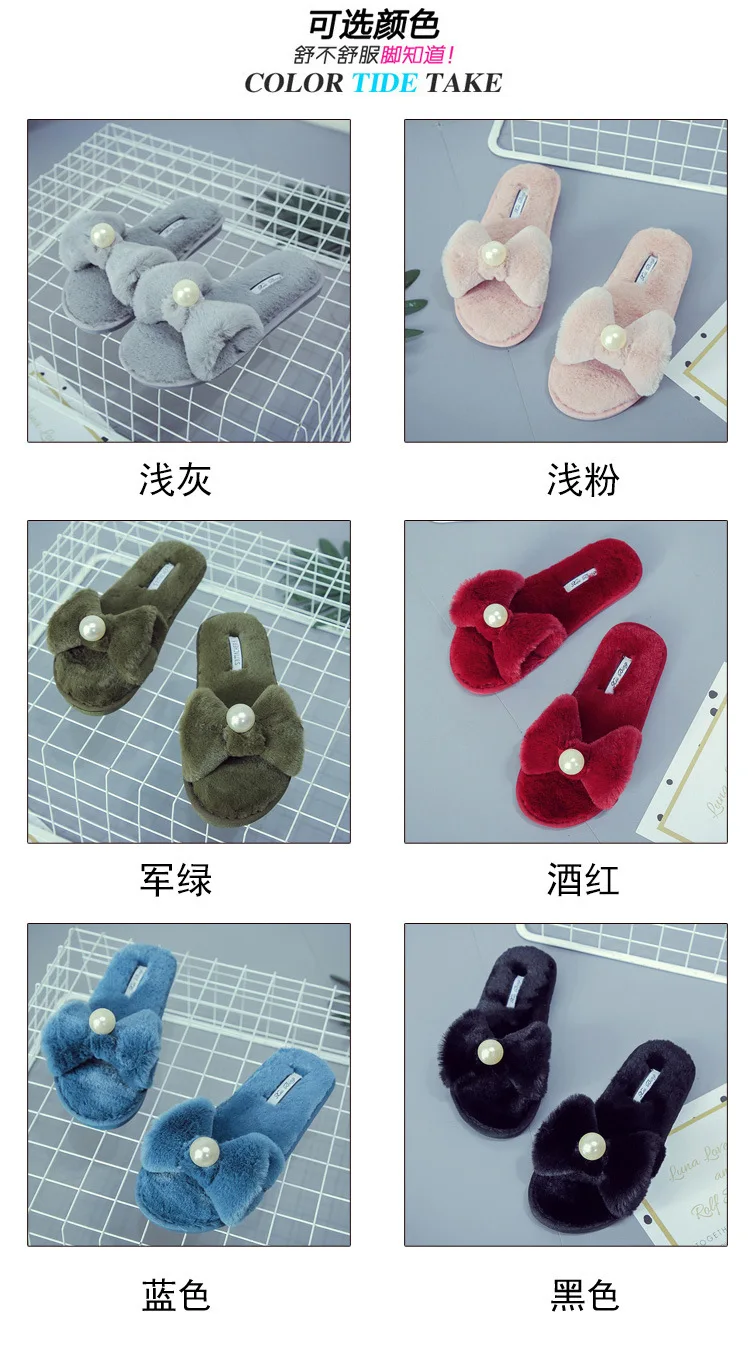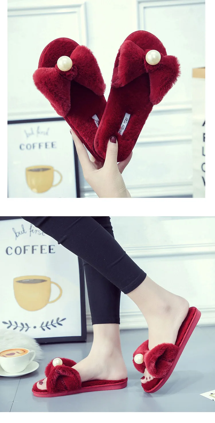 Fairy Girls Pearl Bow-Knot Fur Slippers Winter Fleeces Shoes Women