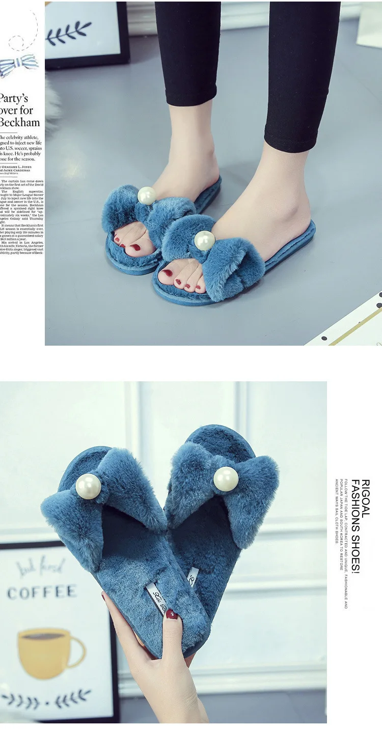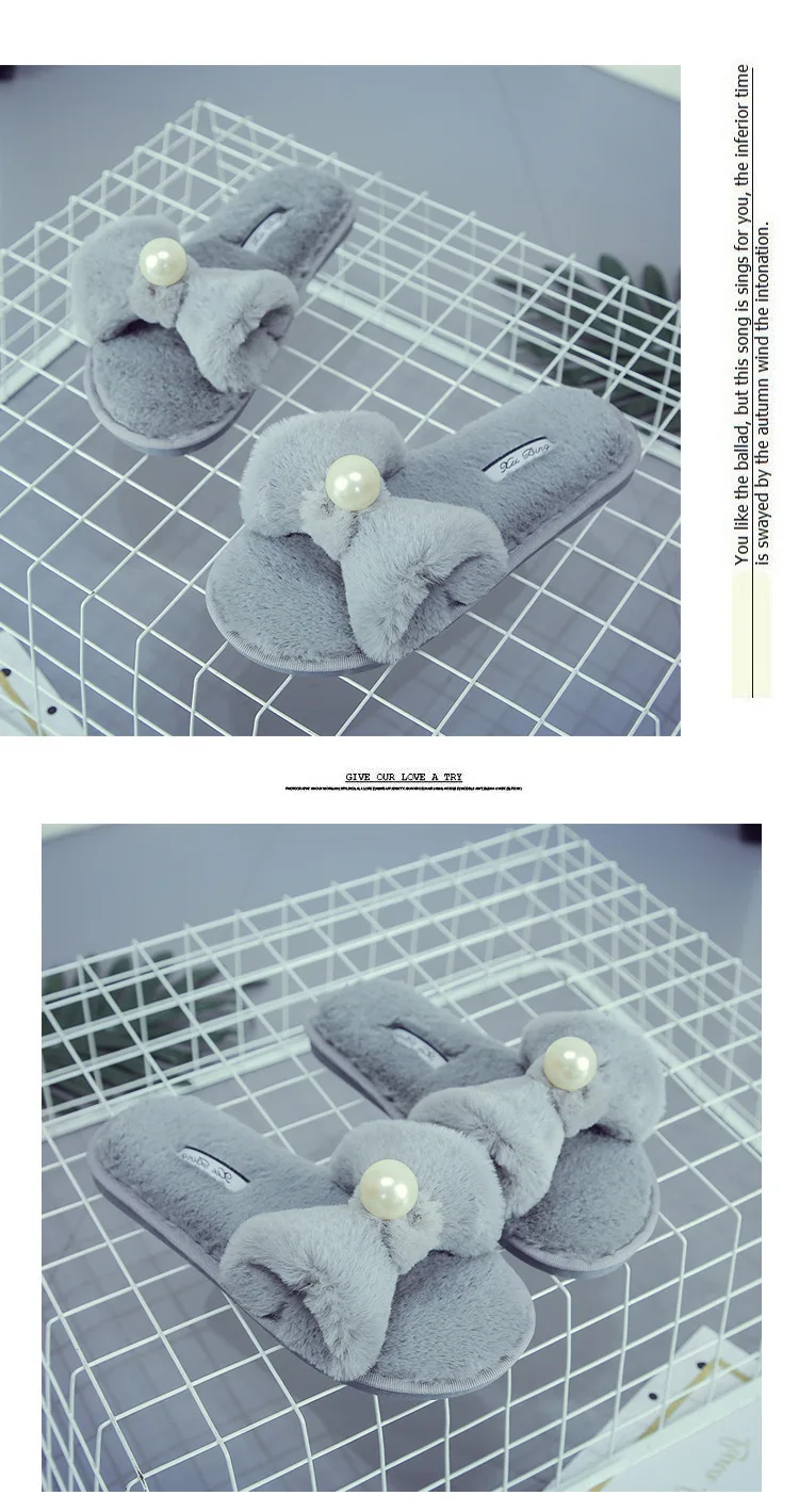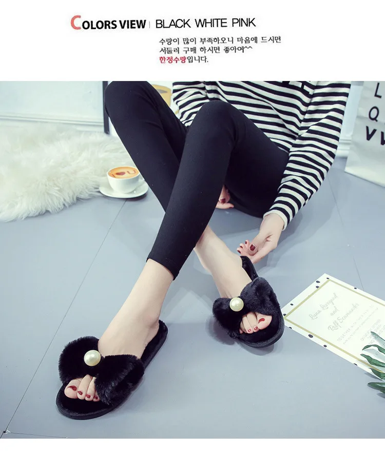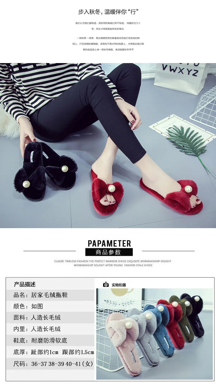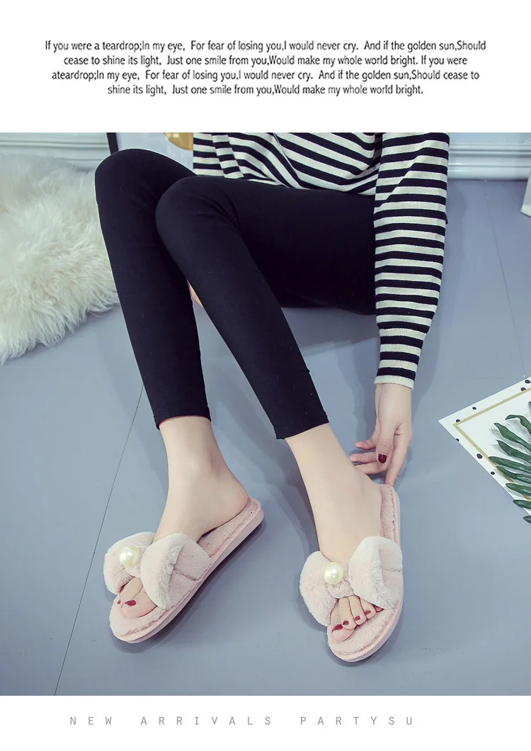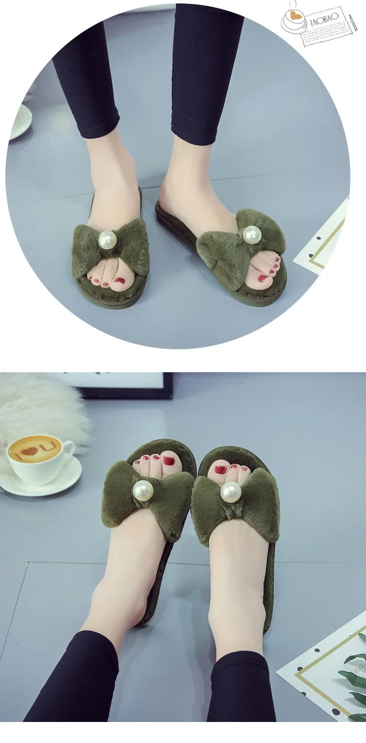 Fairy Girls Pearl Bow-Knot Fur Slippers Winter Fleeces Shoes Women