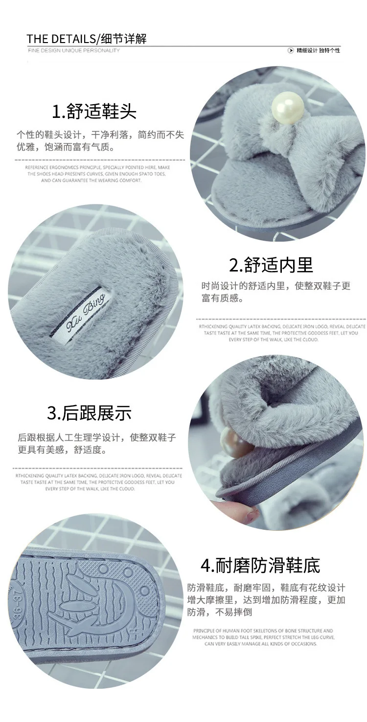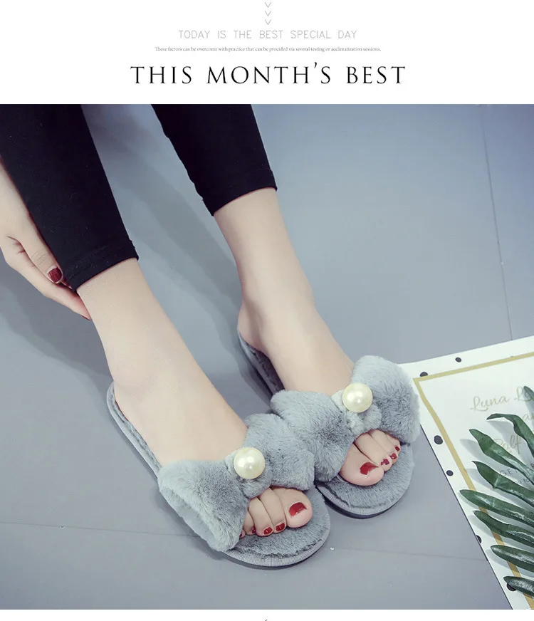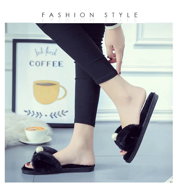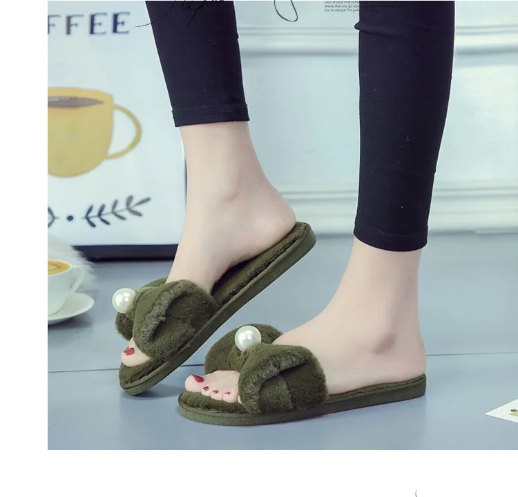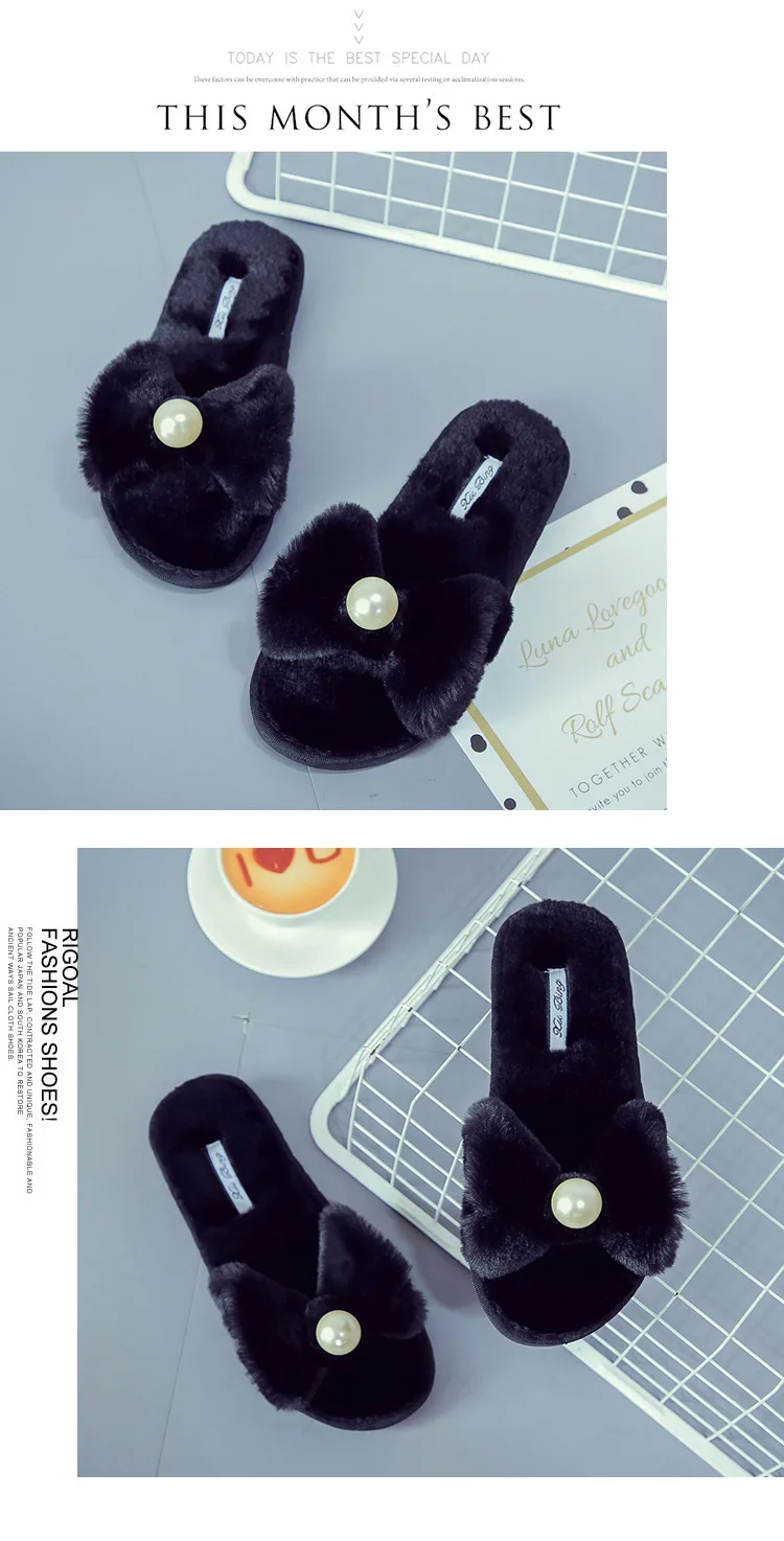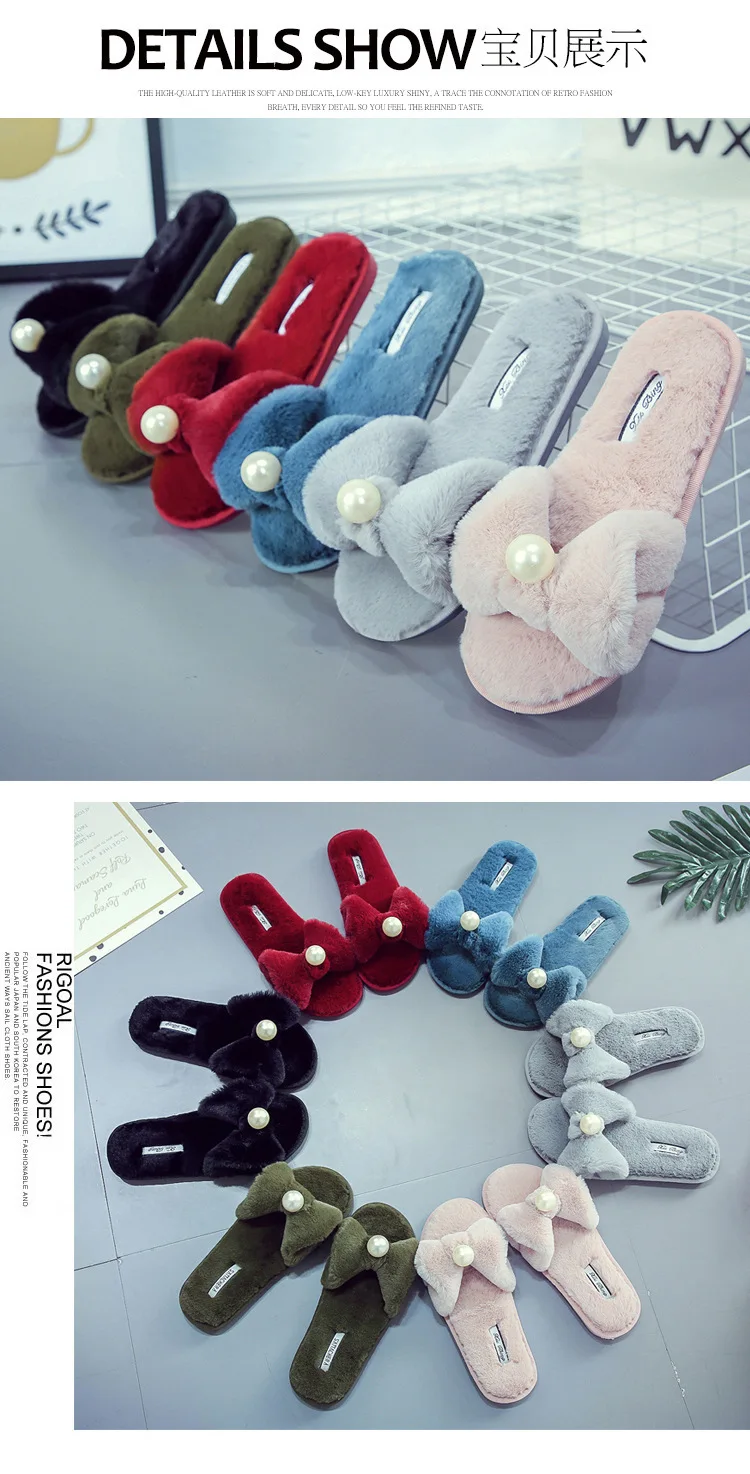 Fairy Girls Pearl Bow-Knot Fur Slippers Winter Fleeces Shoes Women