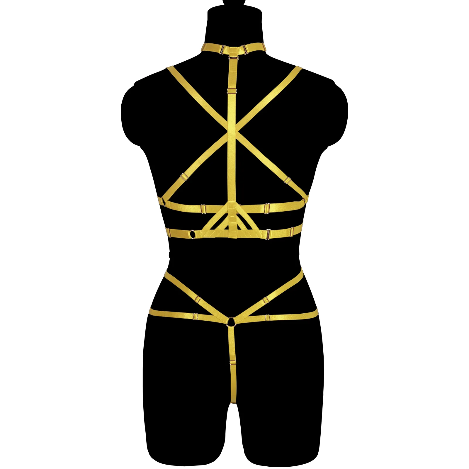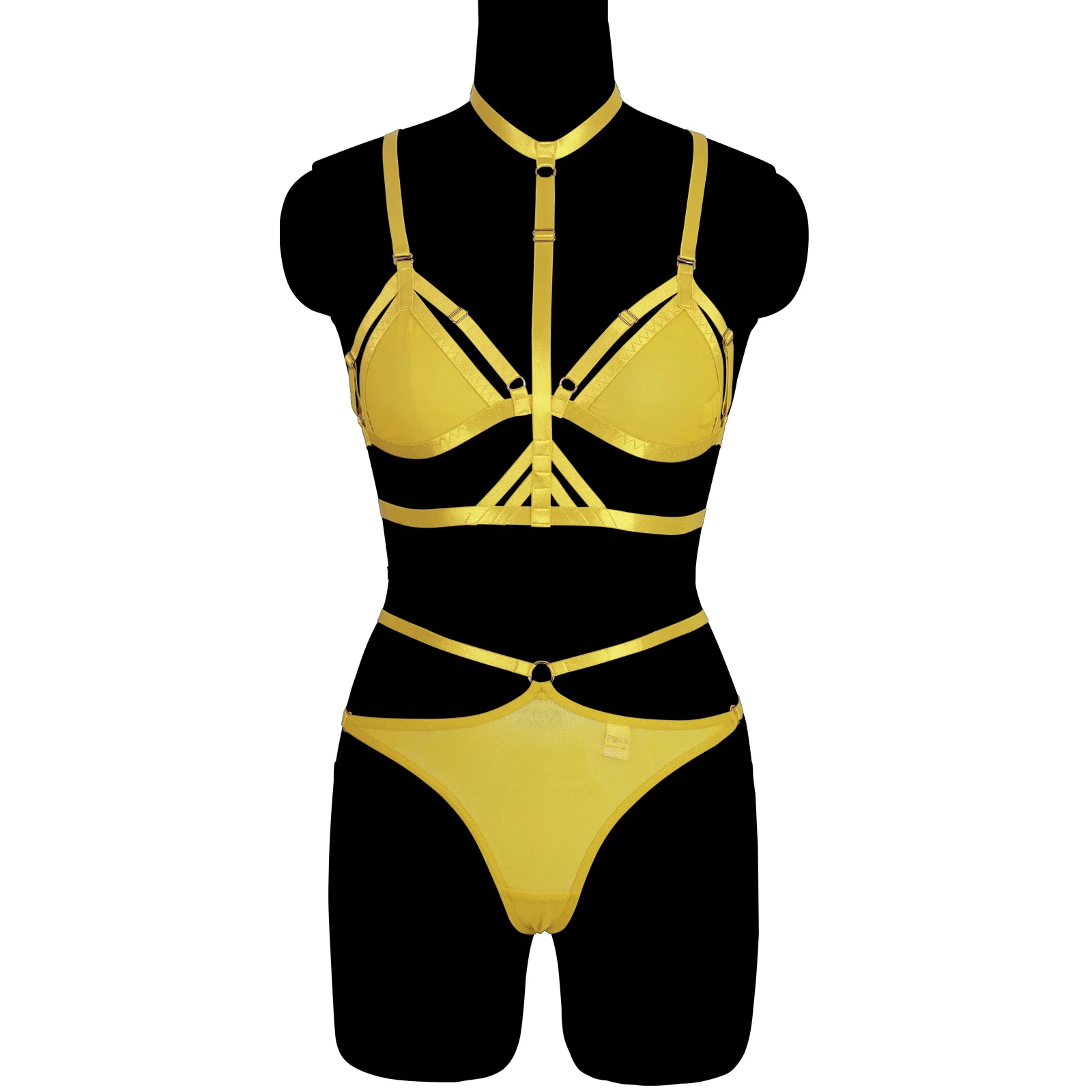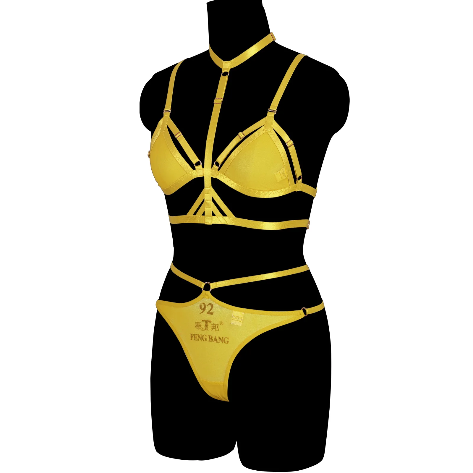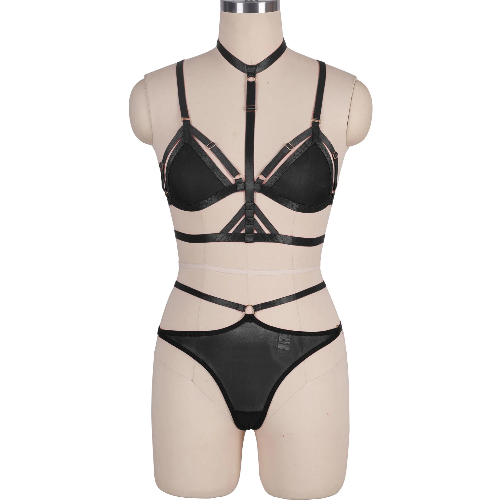 Women Mesh Body Harness Elastic Lingerie Cage Set Crop Top Underwear Bra Adjustable Fetish Mesh Lace G-string T-back Harness
