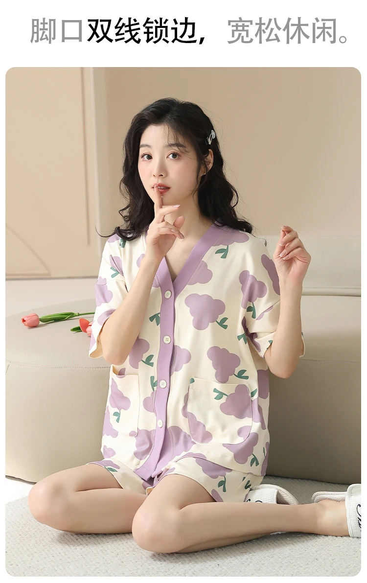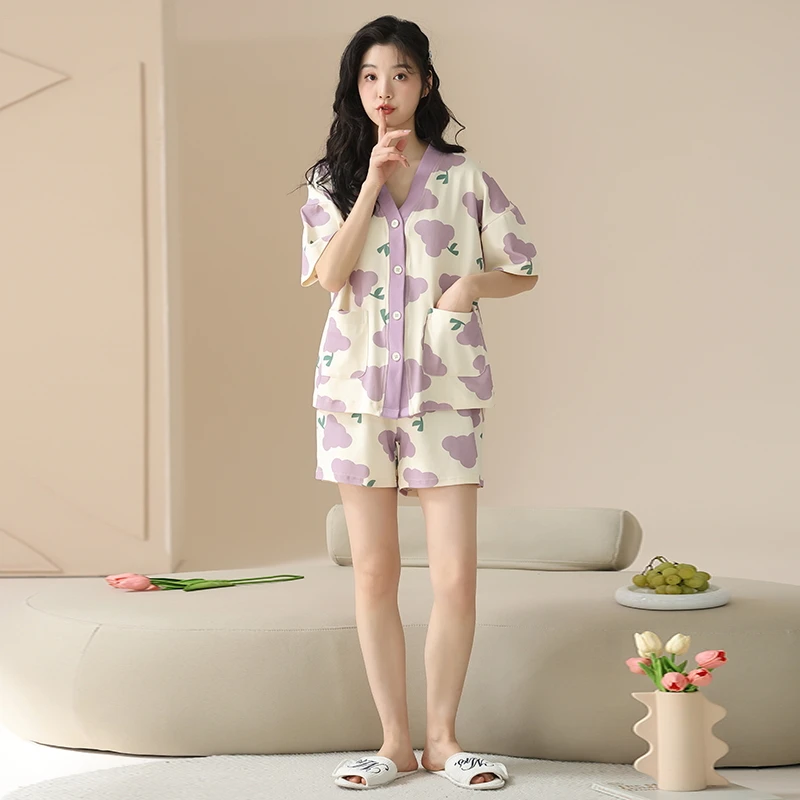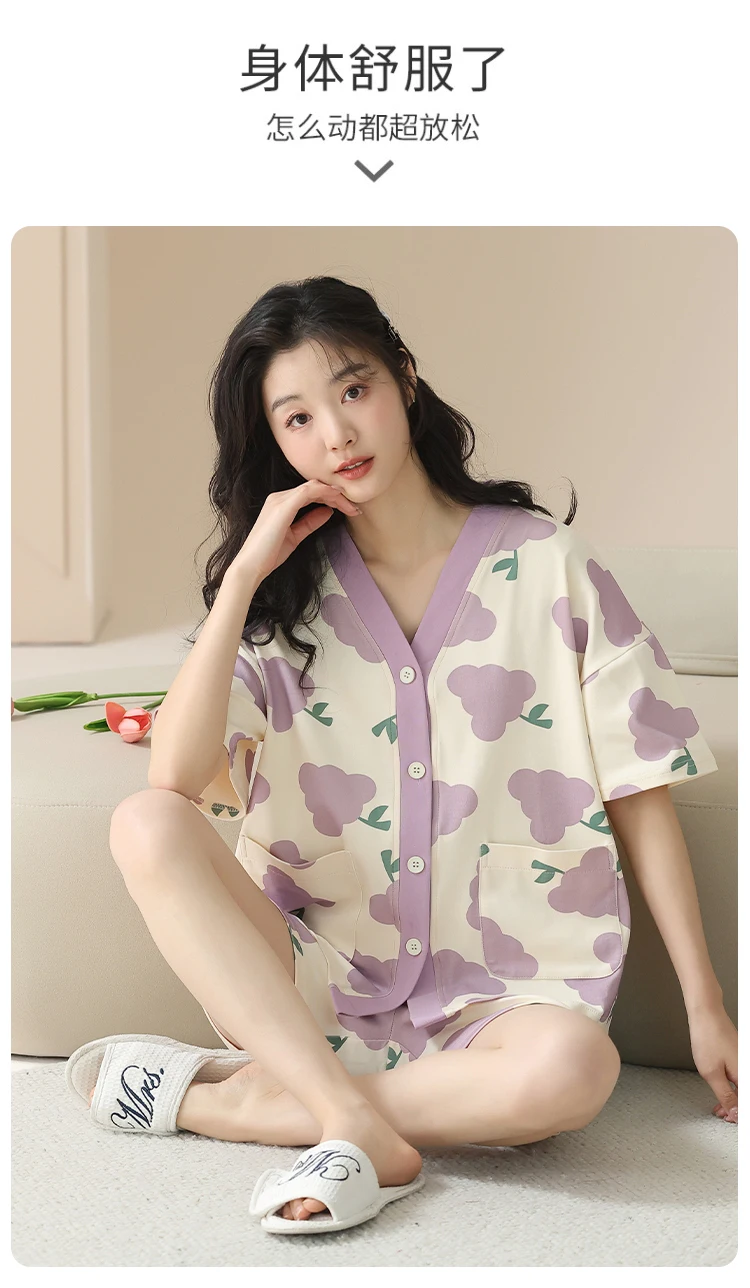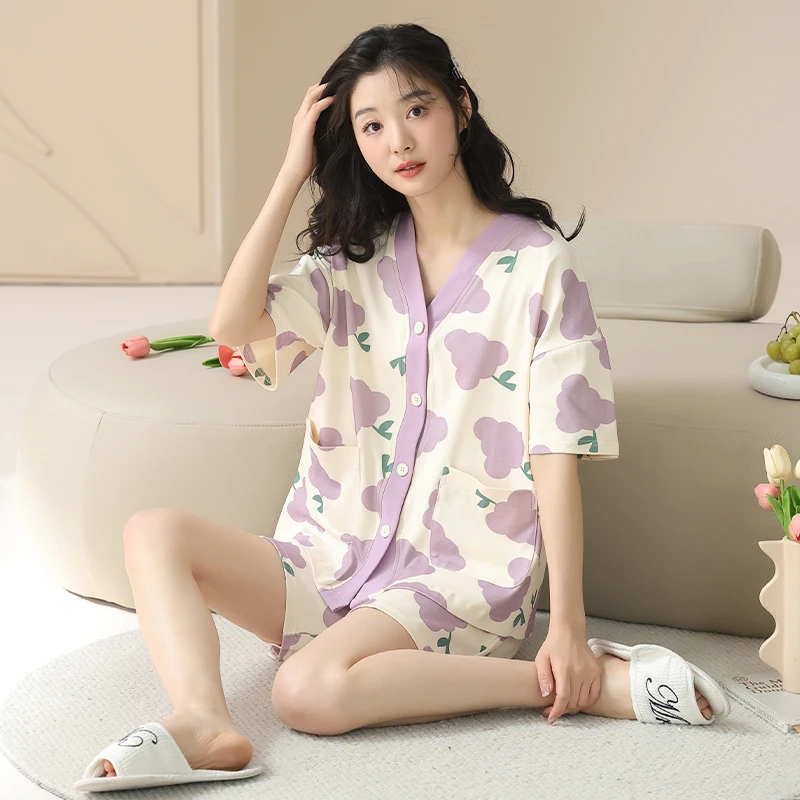 Women Pajama Set Summer 100%Cotton Short Sleeve Sleepwear V-Neck Floral Pijama